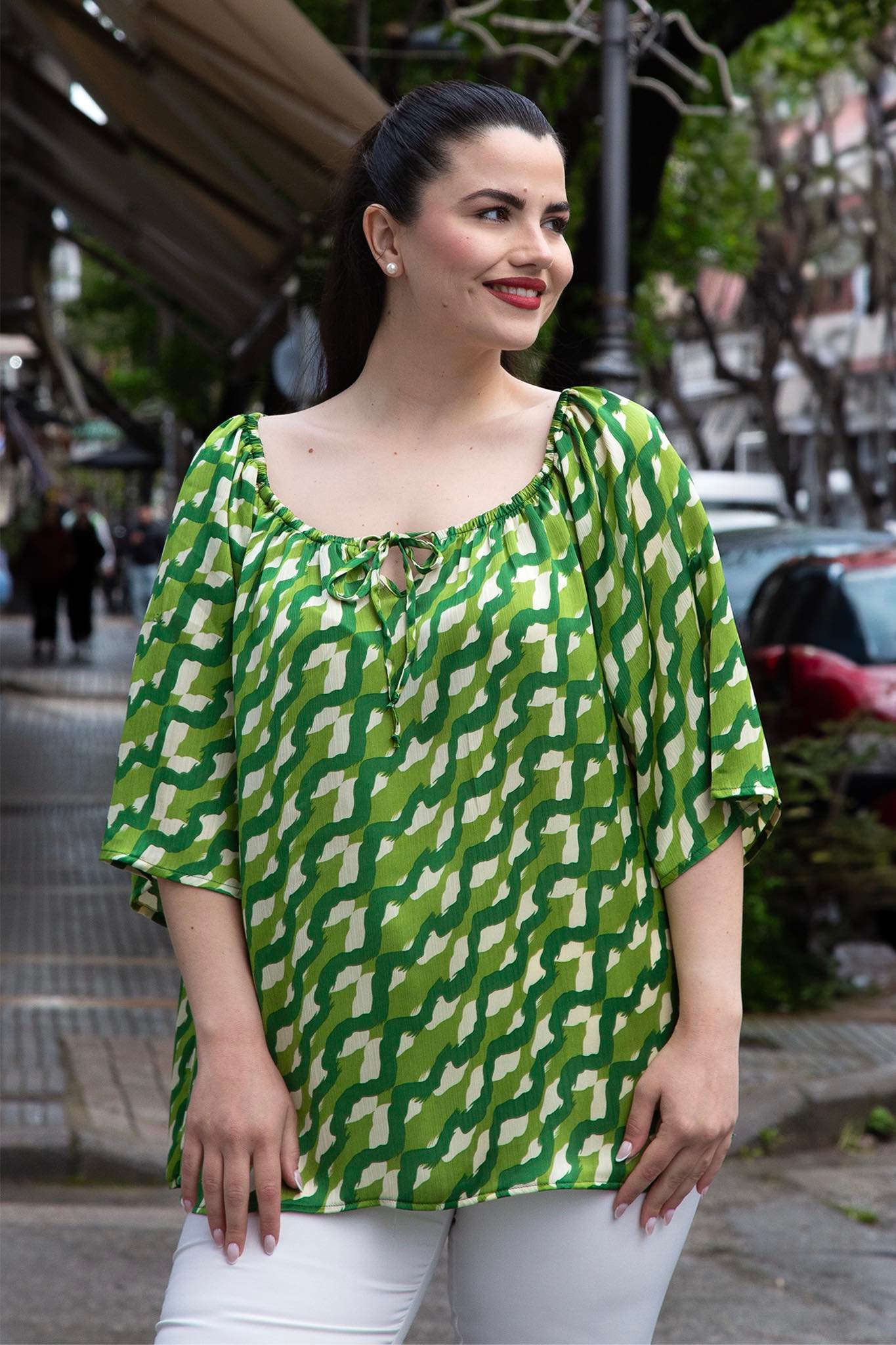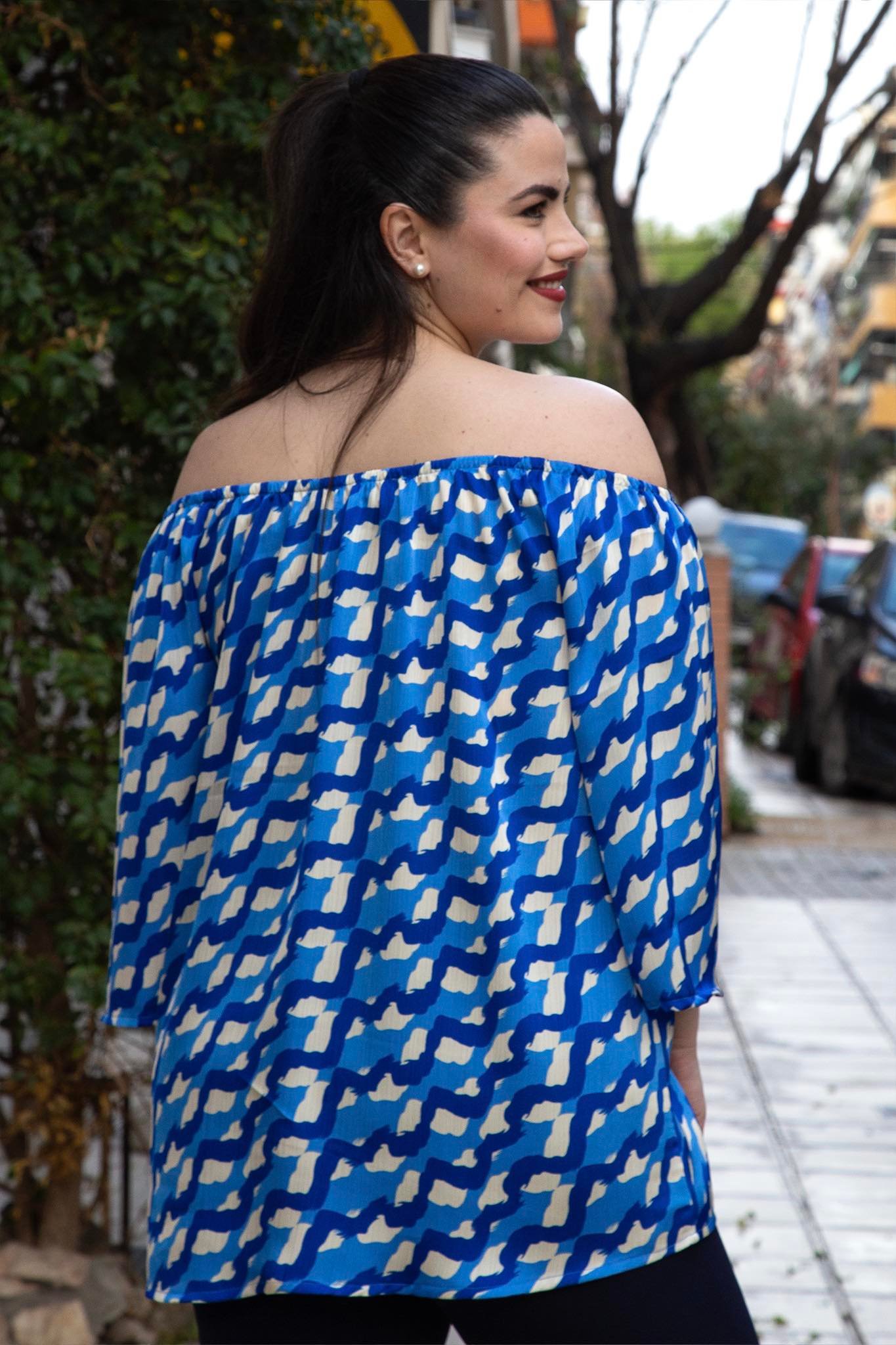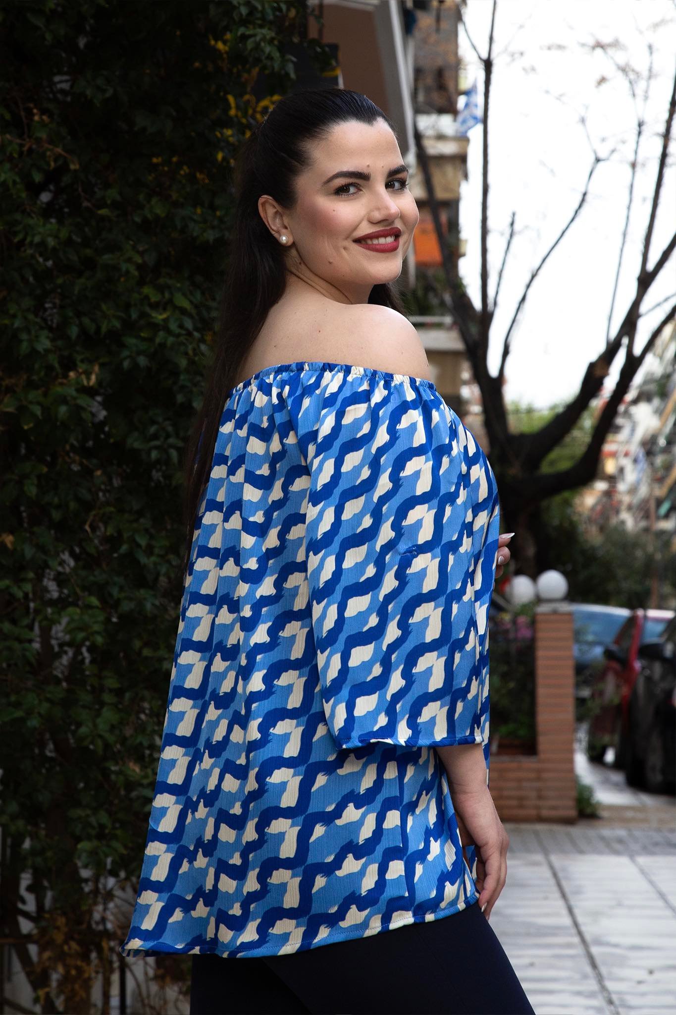 Μπλούζα, σε μεγάλα μεγέθη, με ντεκολτέ χαμόγελο που έχει λάστιχο για να μπορεί να φορεθεί και έξωμη. Στο κέντρο εμπρός του ντεκολτέ έχει κορδελάκι. Το μανίκι είναι 3/4. Καλύπτει περιφέρεια.