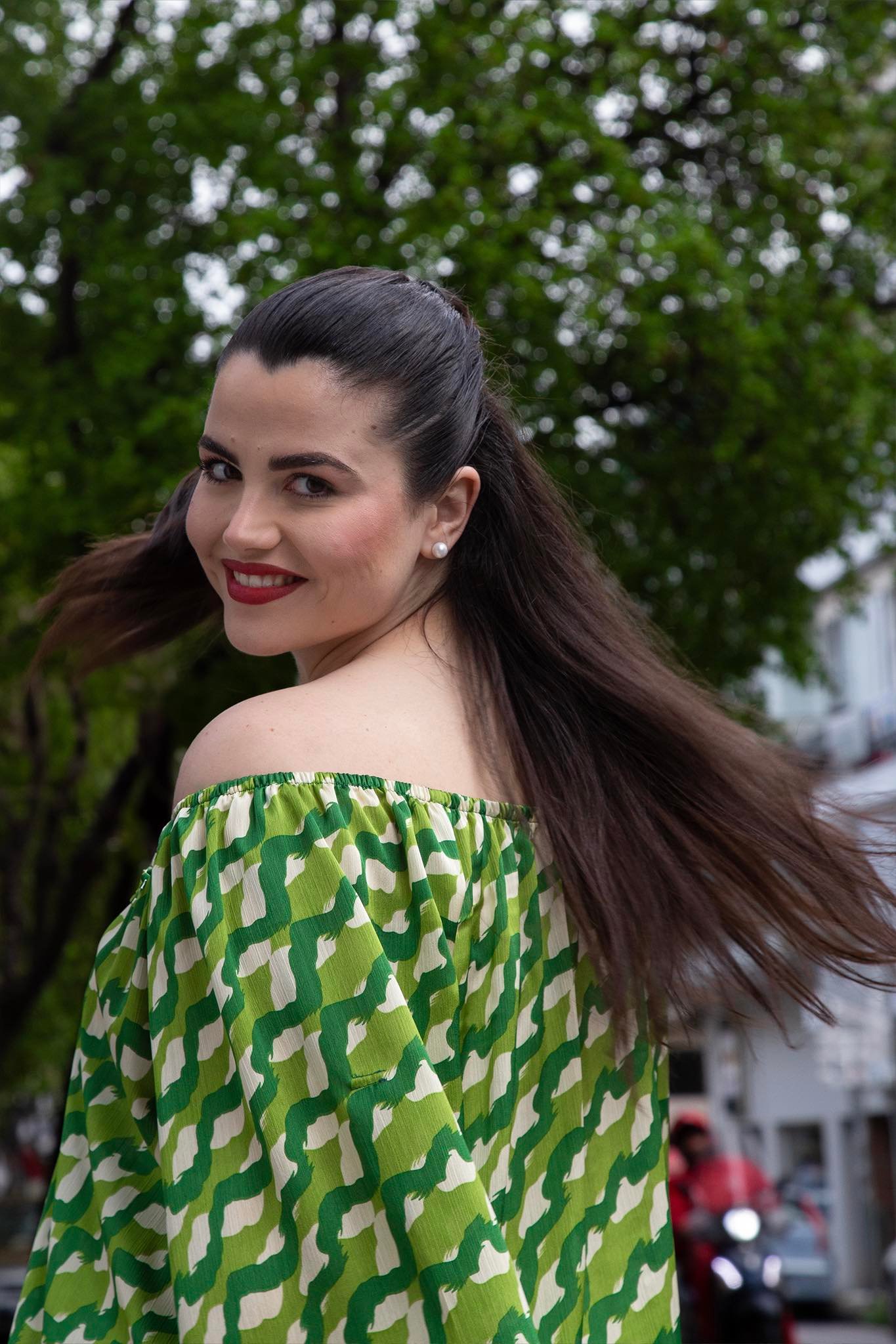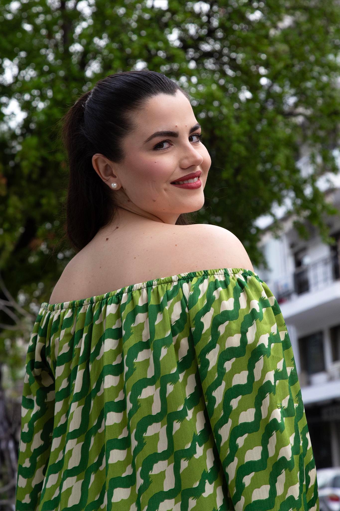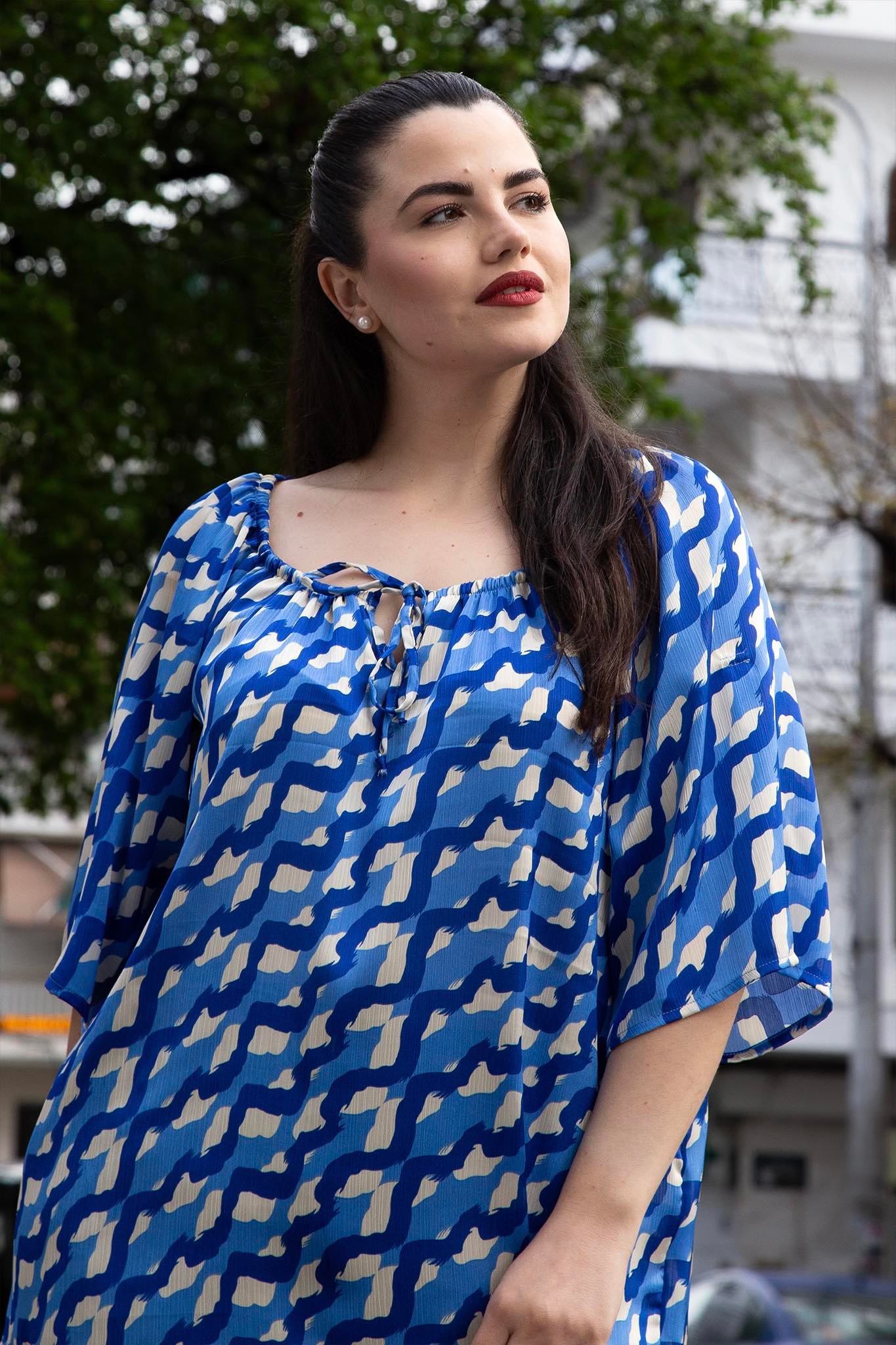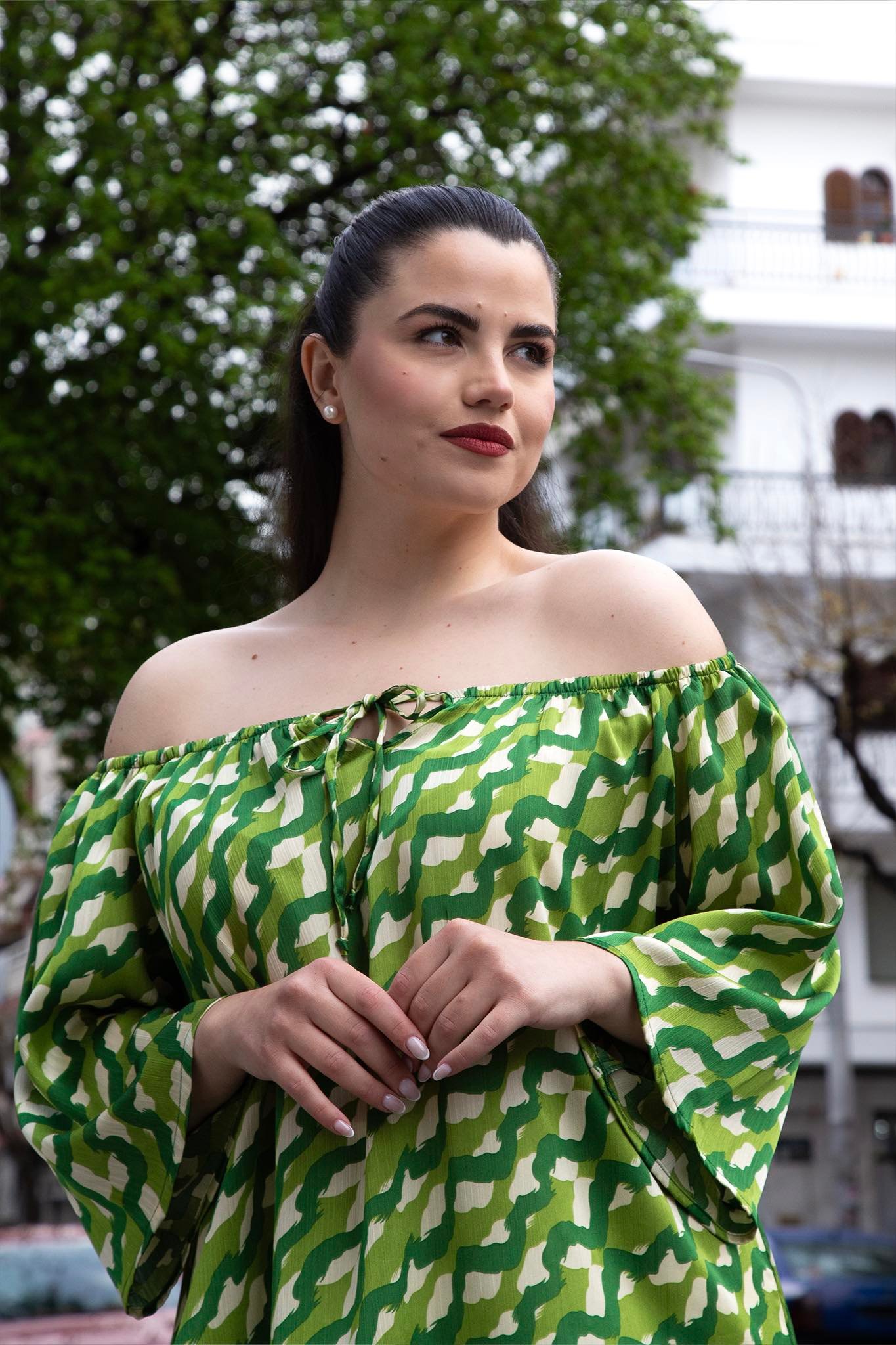 Μπλούζα, σε μεγάλα μεγέθη, με ντεκολτέ χαμόγελο που έχει λάστιχο για να μπορεί να φορεθεί και έξωμη. Στο κέντρο εμπρός του ντεκολτέ έχει κορδελάκι. Το μανίκι είναι 3/4. Καλύπτει περιφέρεια.