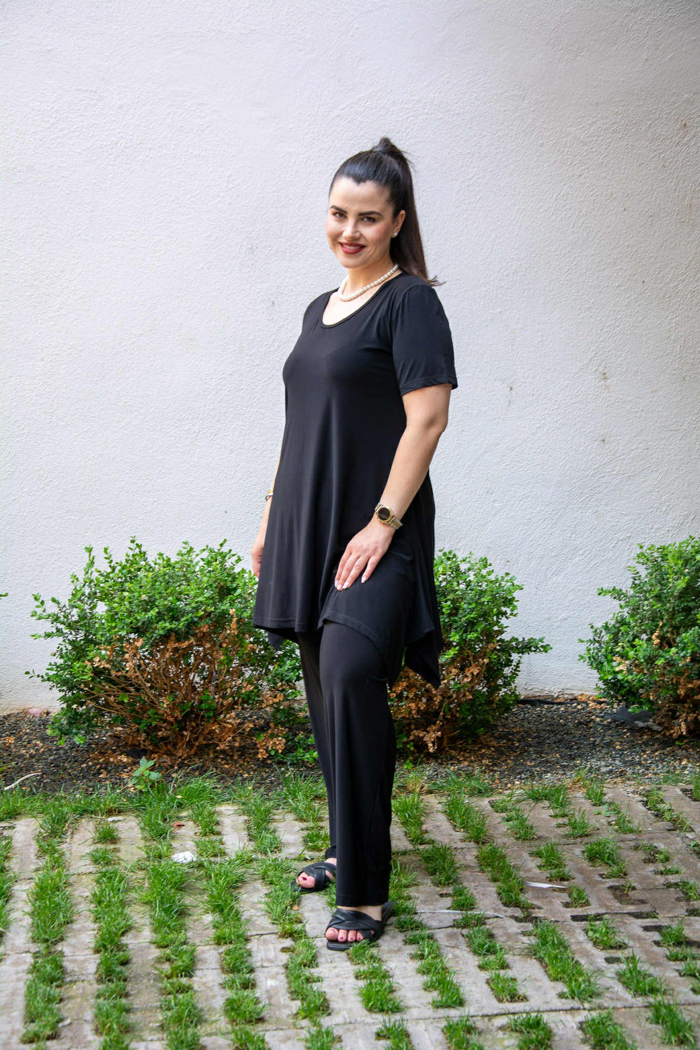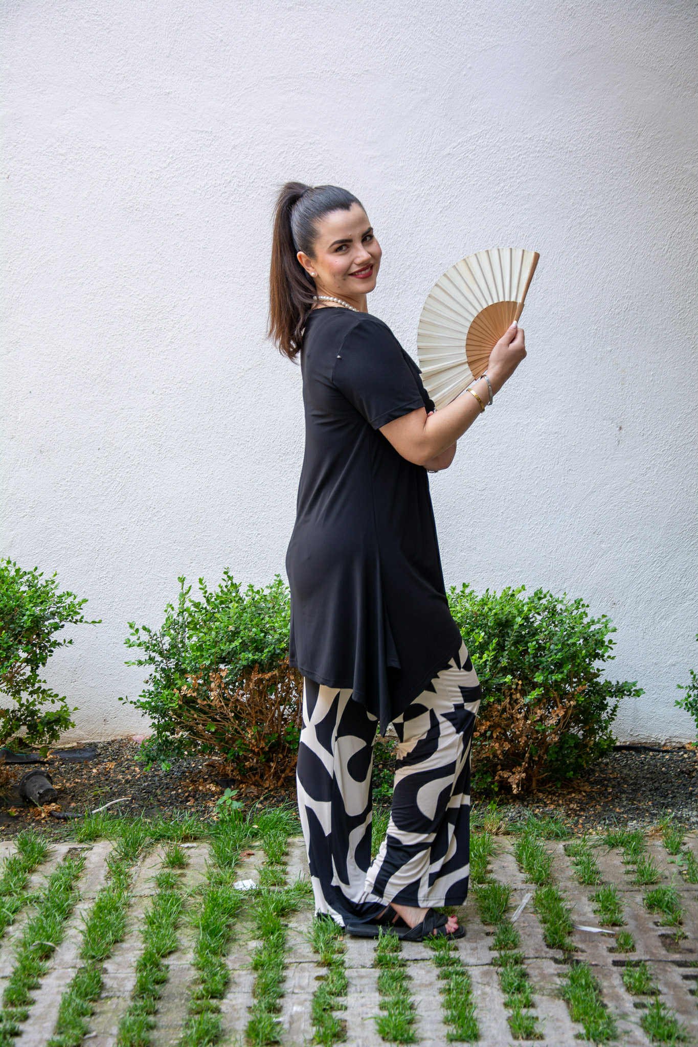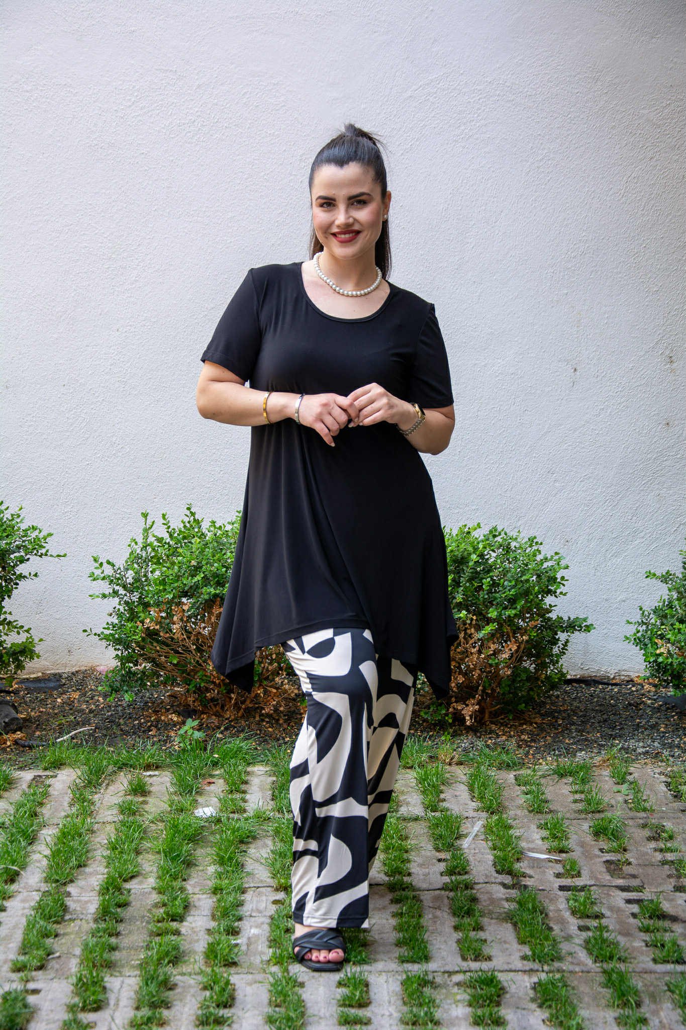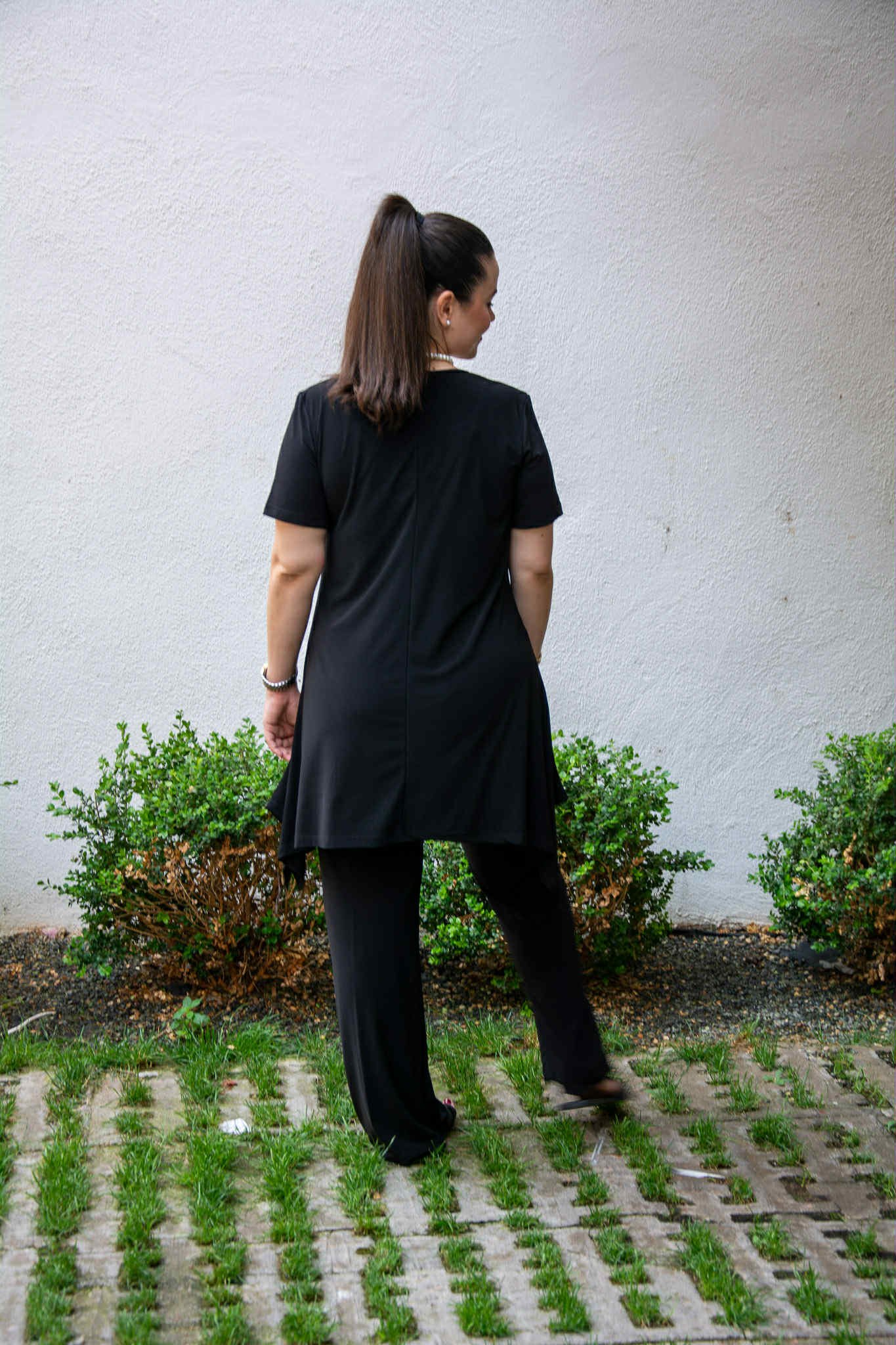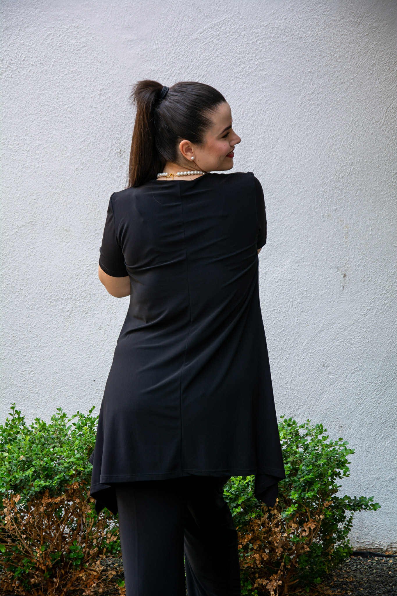 Μπλούζα κοντομάνικη, σε μεγάλα μεγέθη, μακριά, με στρογγυλή λαιμόκοψη και μύτες δεξιά και αριστερά.