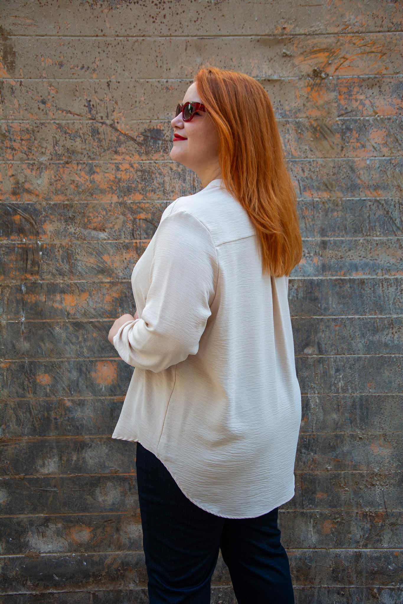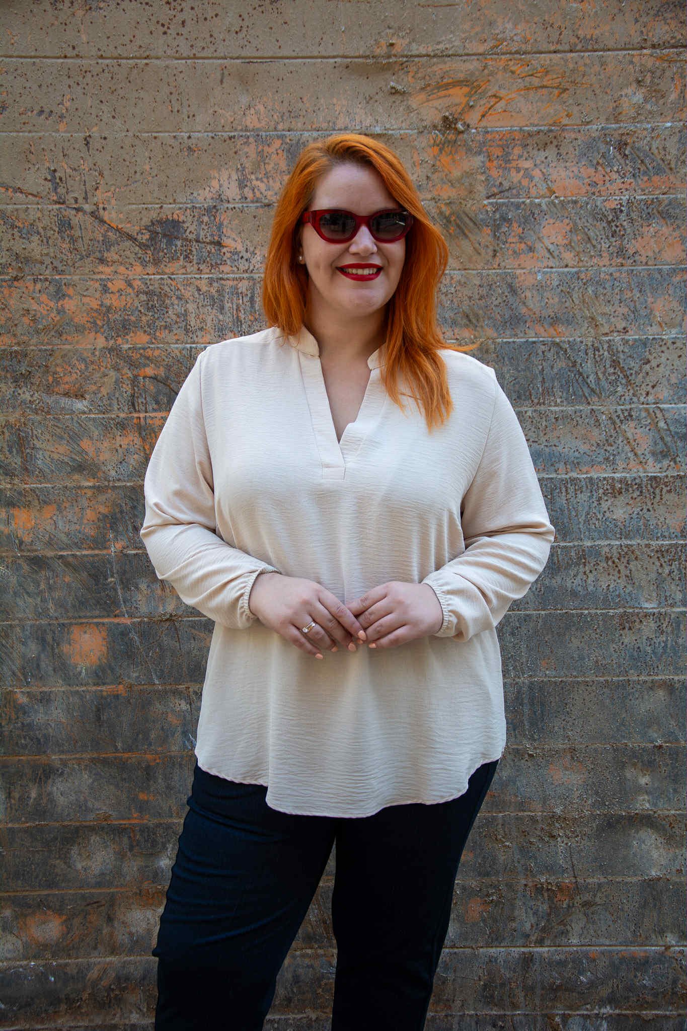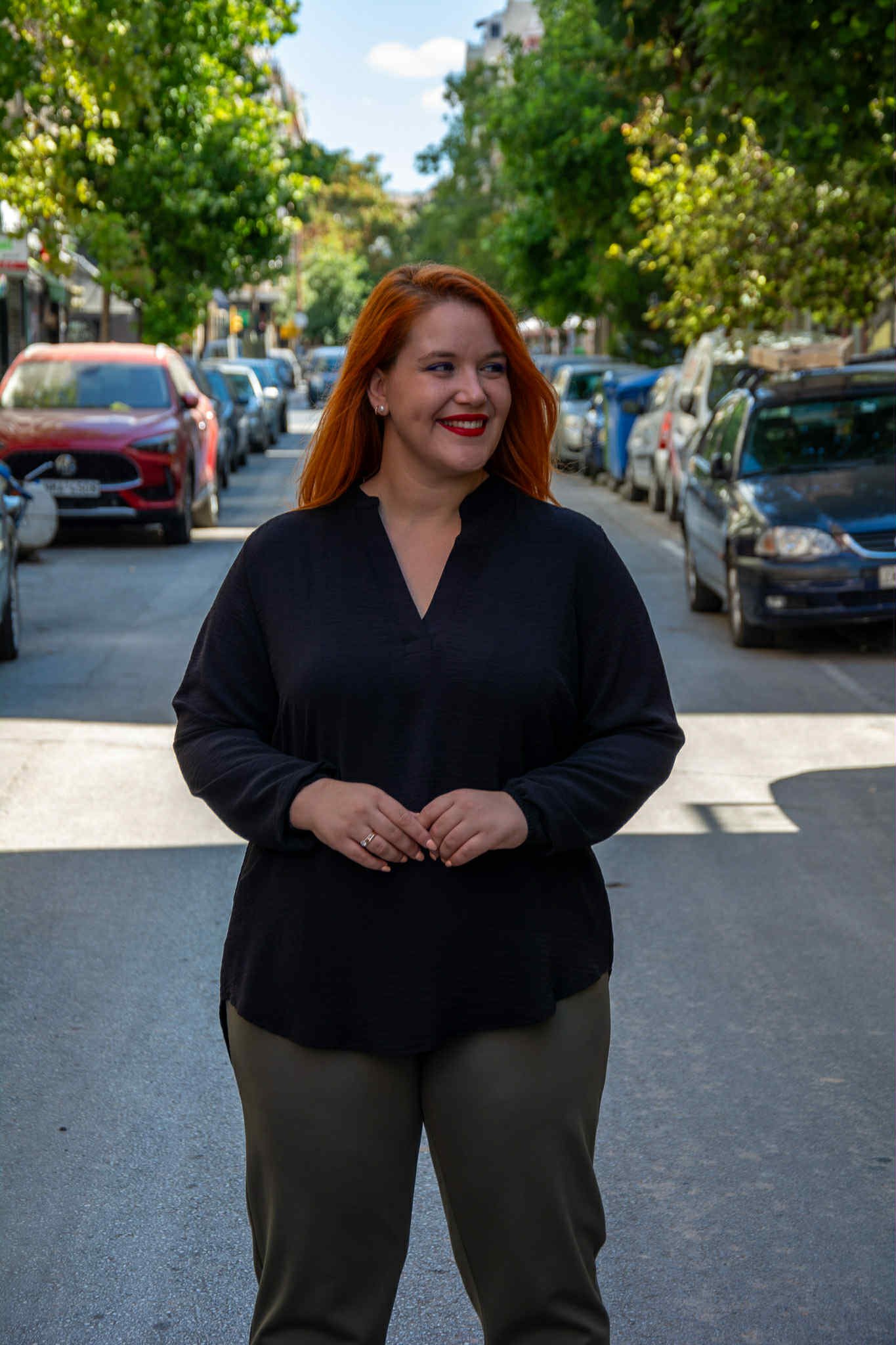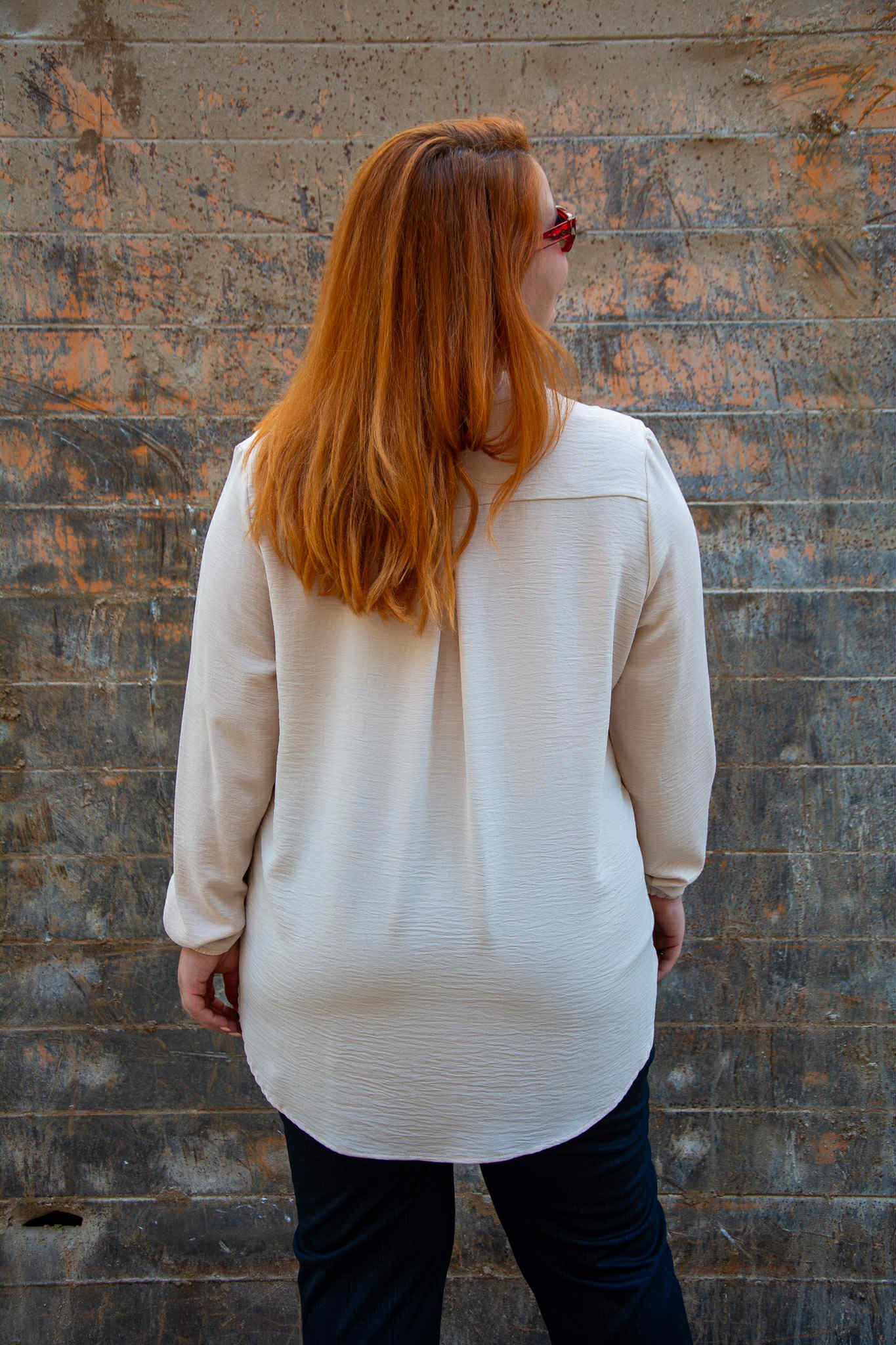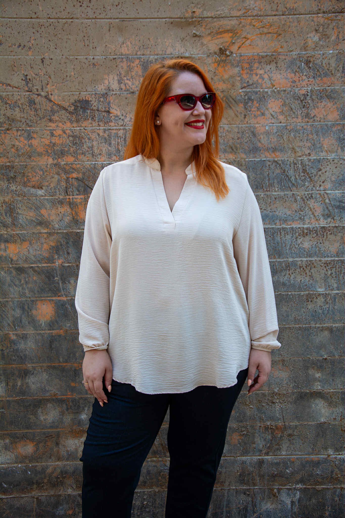 Μπλούζα, σε μεγάλο μέγεθος. Είναι μακριά και έχει μάο V-ντεκολτέ και λάστιχο στο τελείωμα του μανικιού.