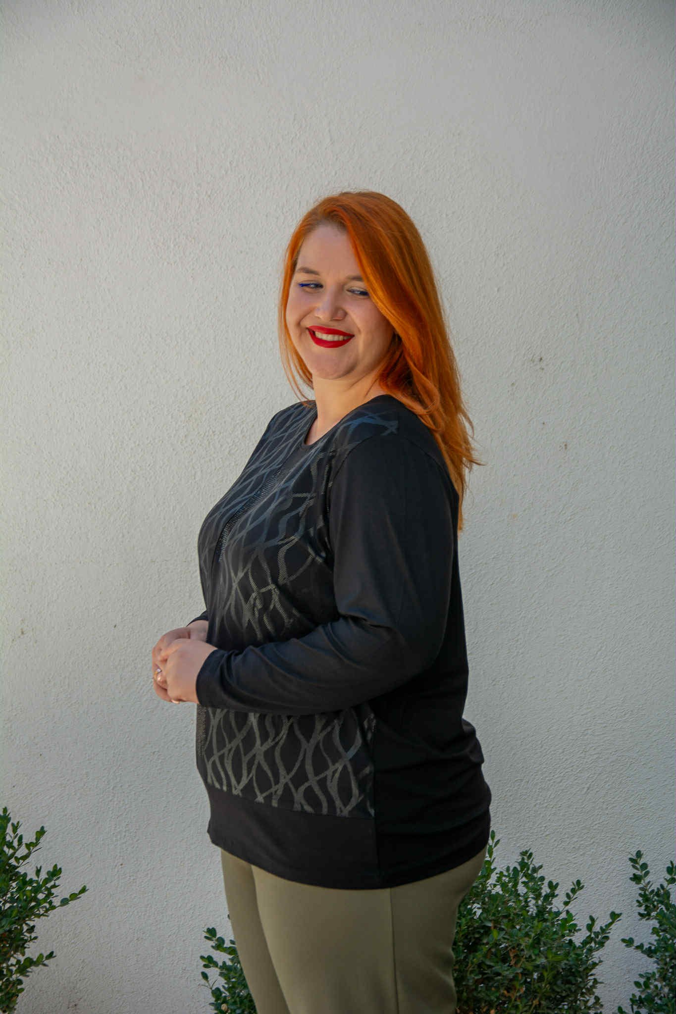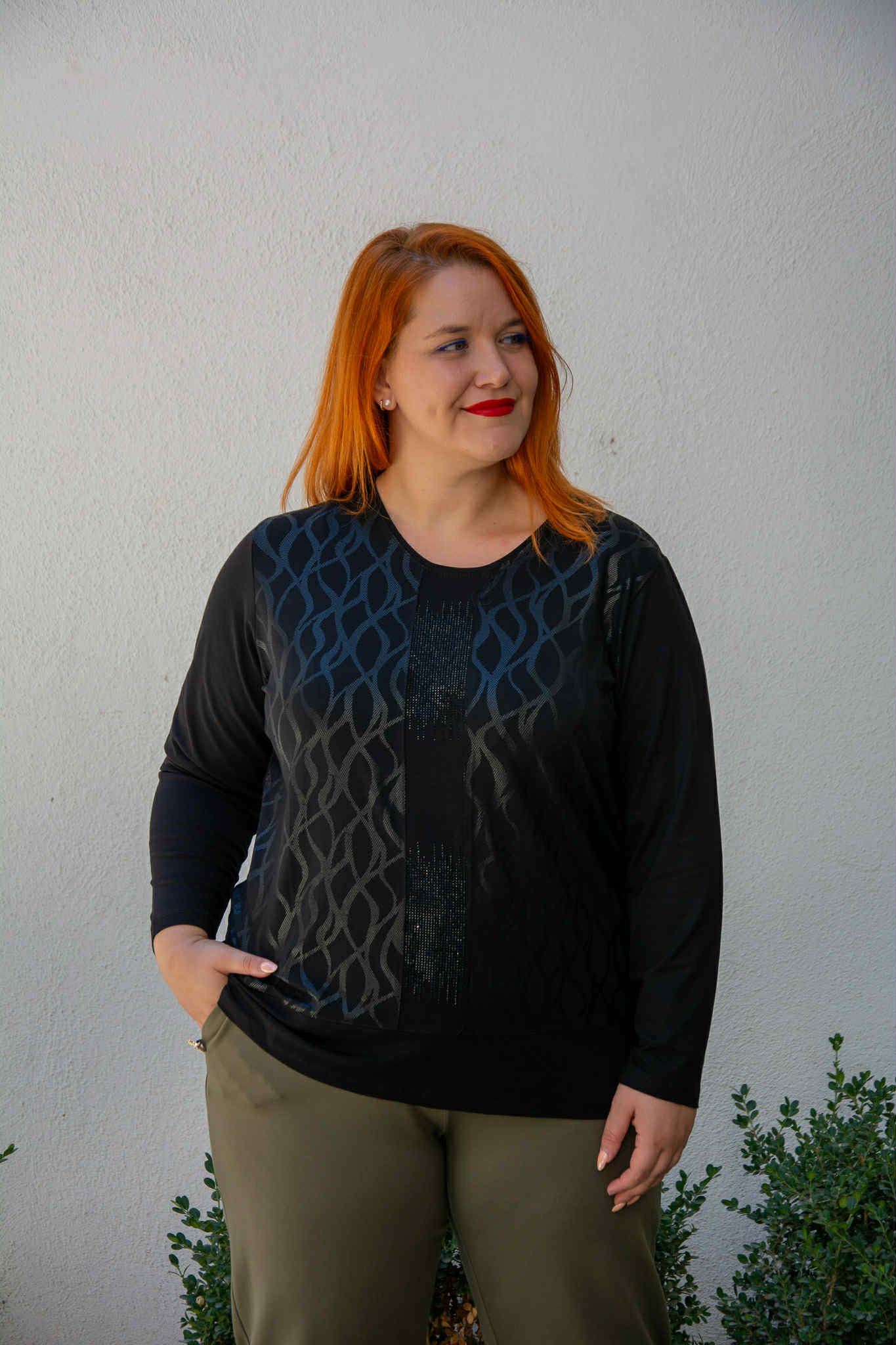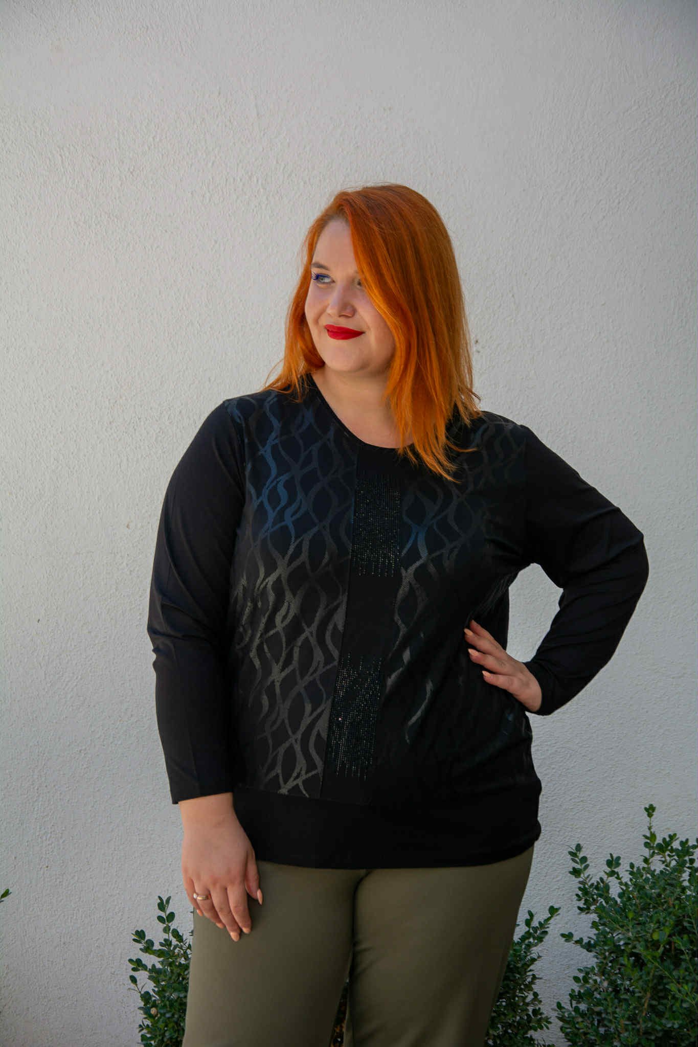 Μπλούζα, σε μεγάλα μεγέθη. Έχει ίσια γραμμή και στρογγυλή λαιμόκοψη. Είναι μαύρη και έχει κάθετη λωρίδα με στρας.