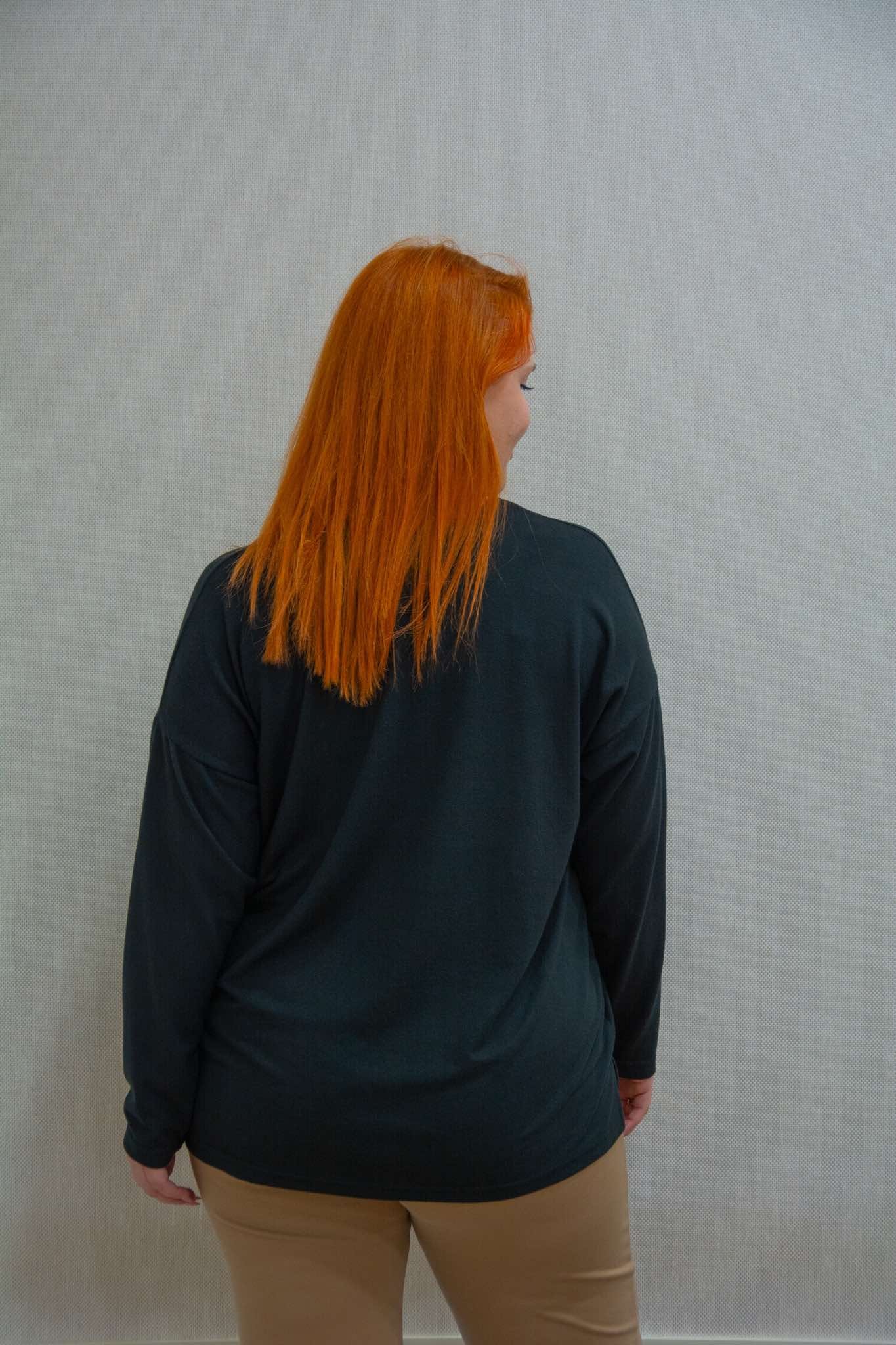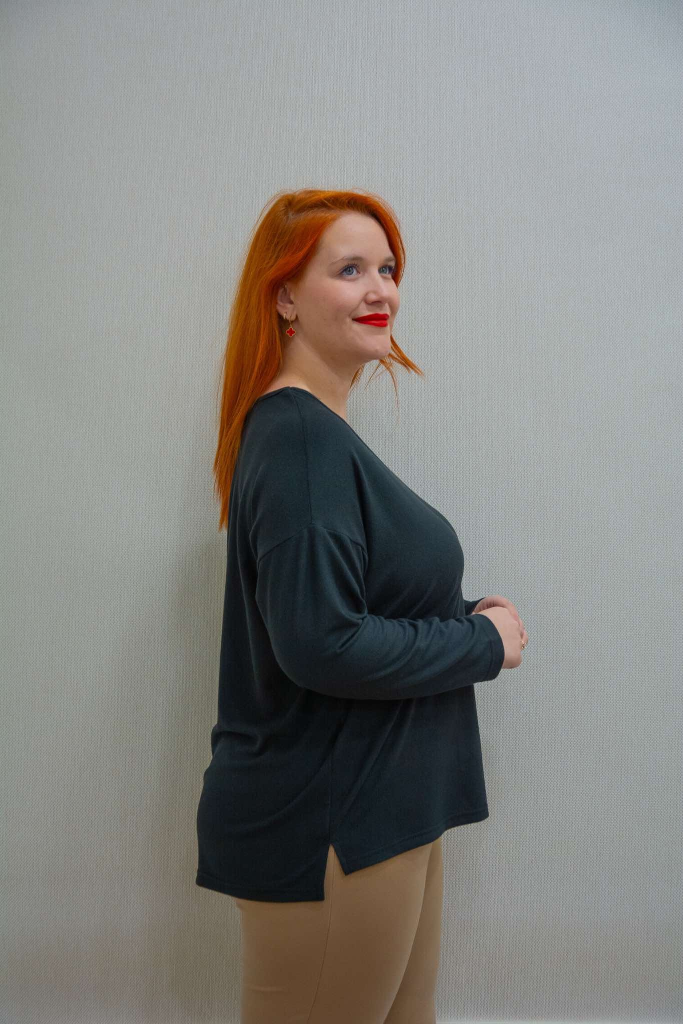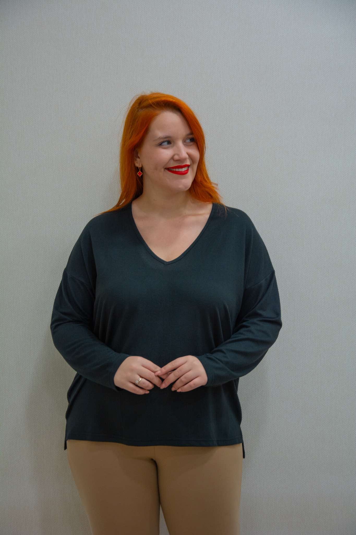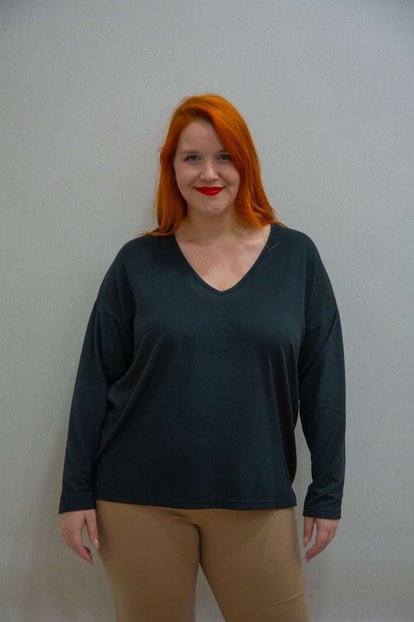 Μπλούζα, σε μεγάλα μεγέθη. Είναι σε ίσια γραμμή και έχει V-ντεκολτέ. Είναι ελαφρώς πιο μακριά στο πίσω μέρος.