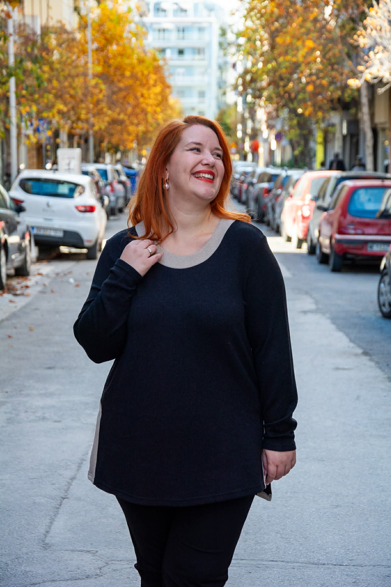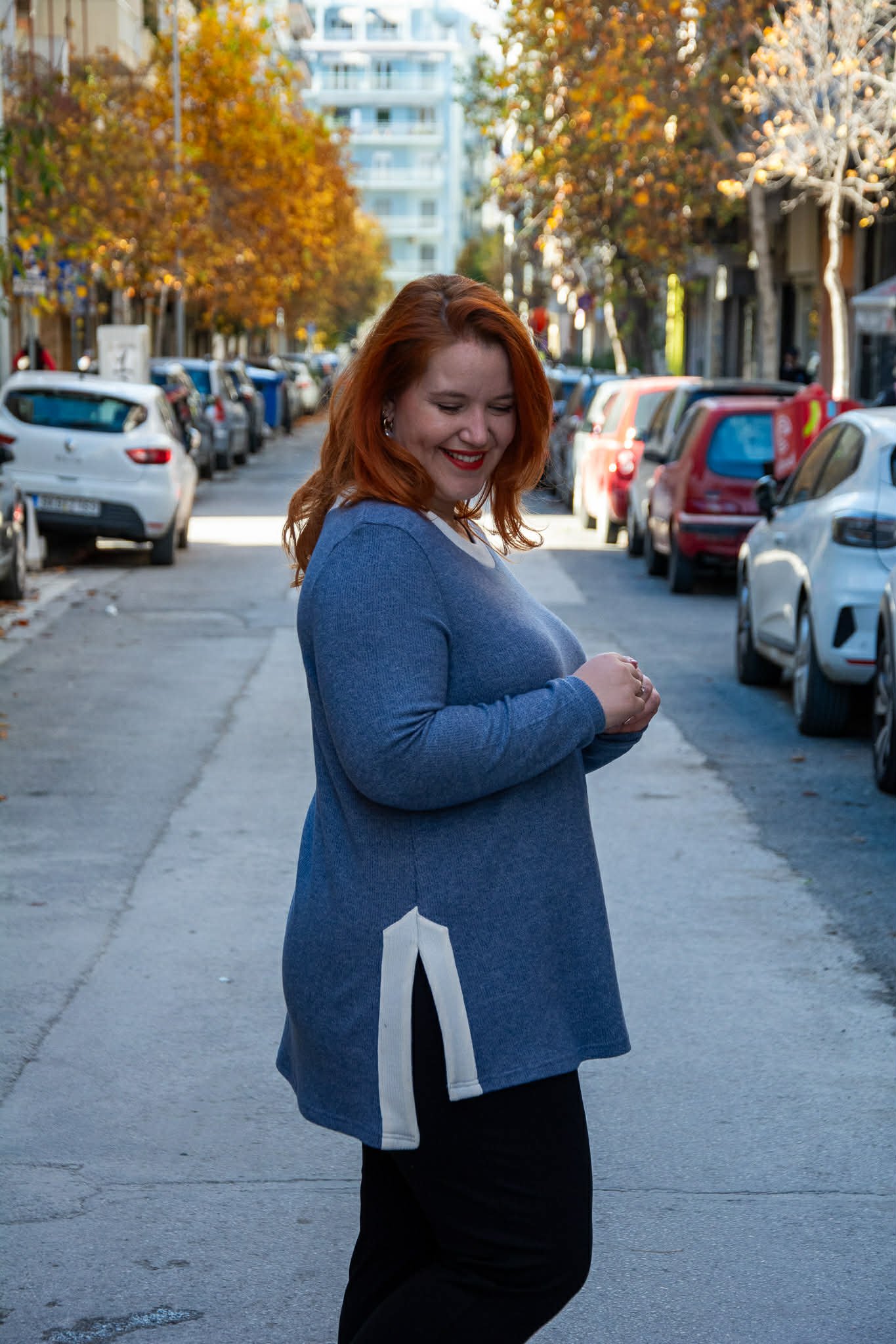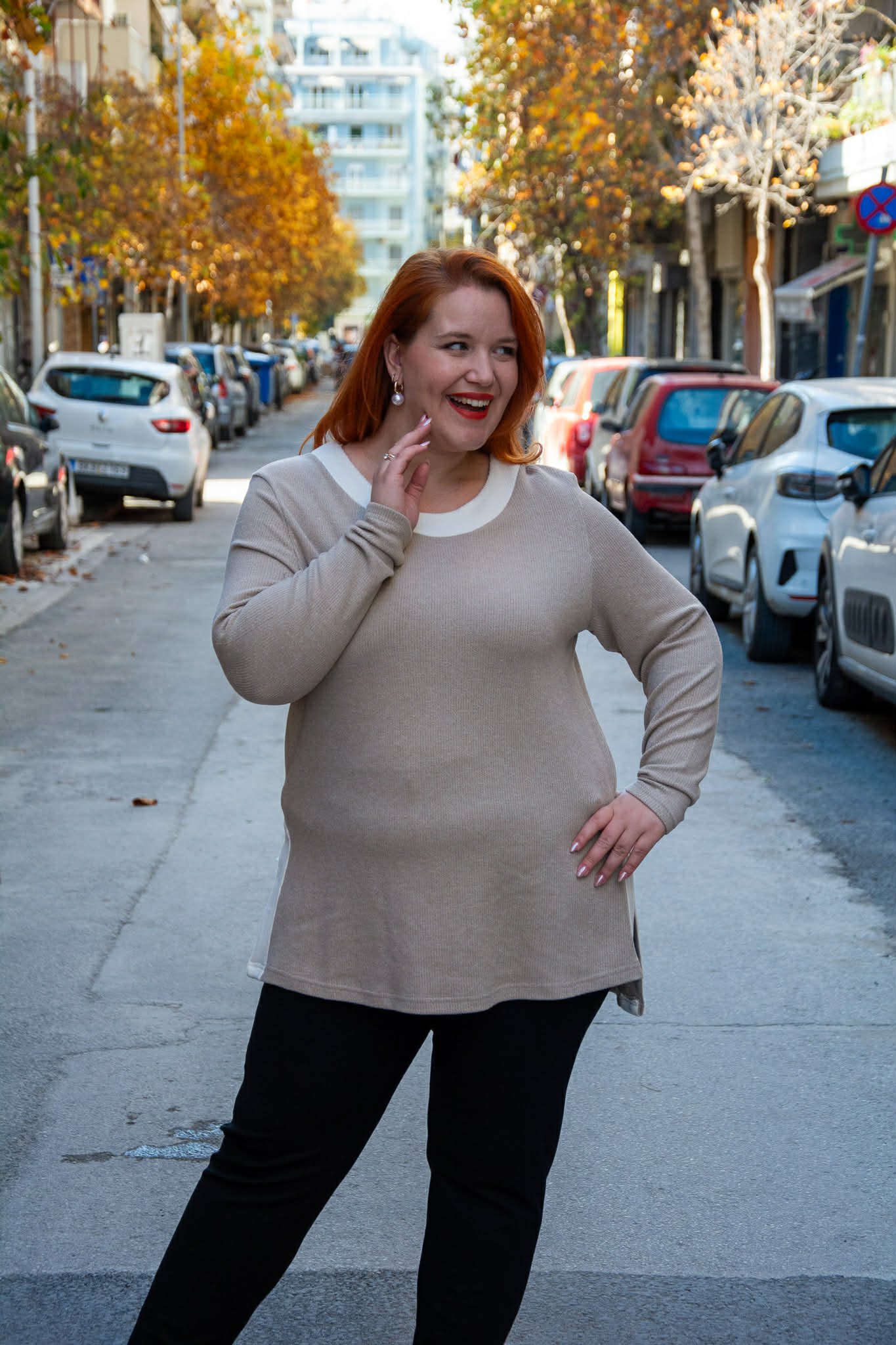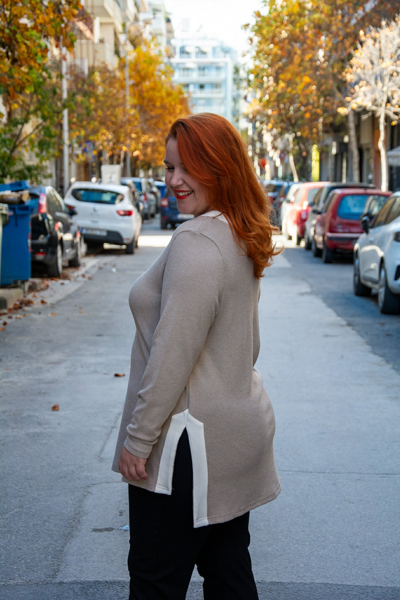 Μπλούζα, σε μεγάλα μεγέθη. Είναι μακριά και έχει στρόγγυλη λαιμόκοψη και έχει άνοιγμα στις πλαϊνές πλευρές. Έχει διχρωμία στο ντεκολτέ και στα ανοίγματα.