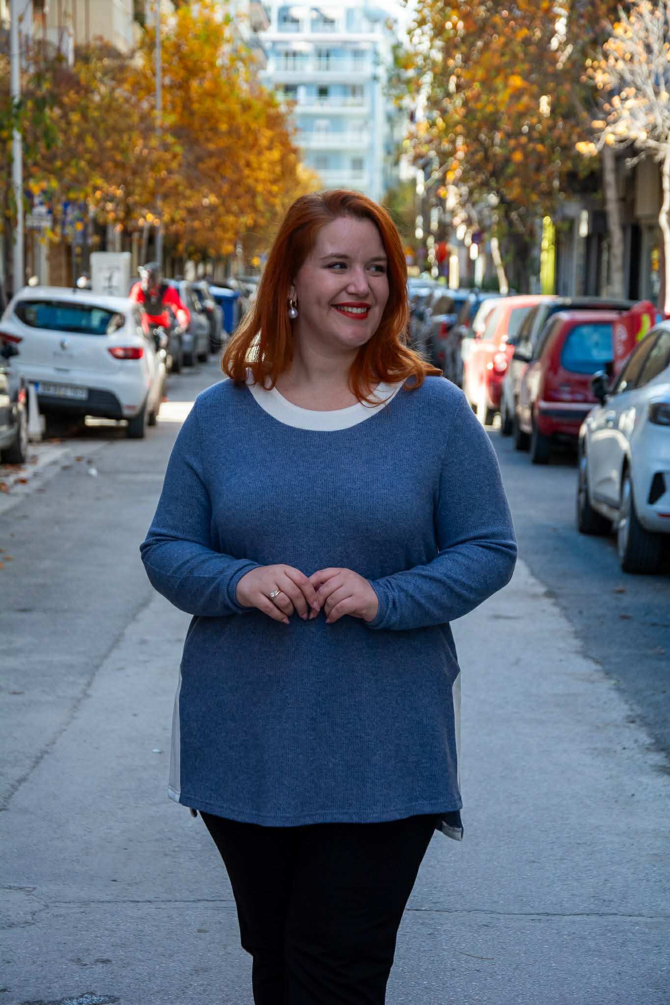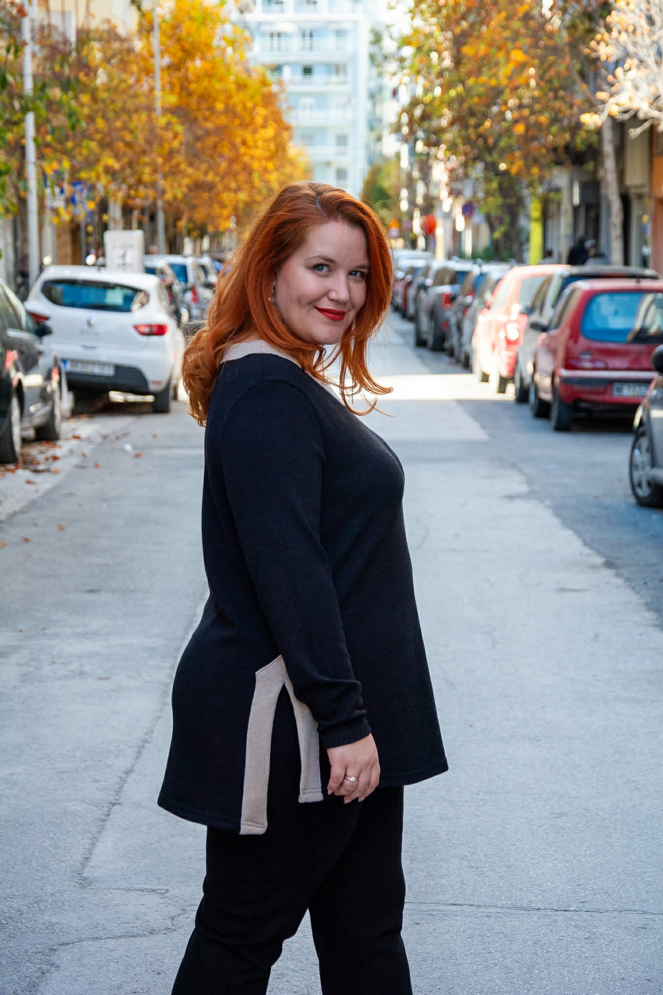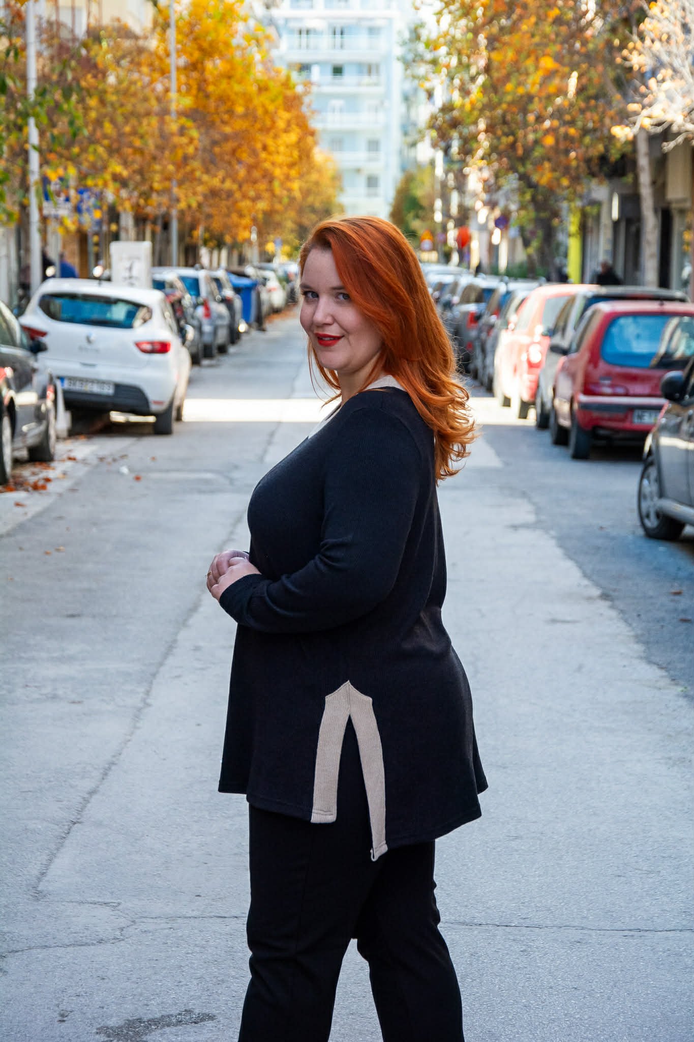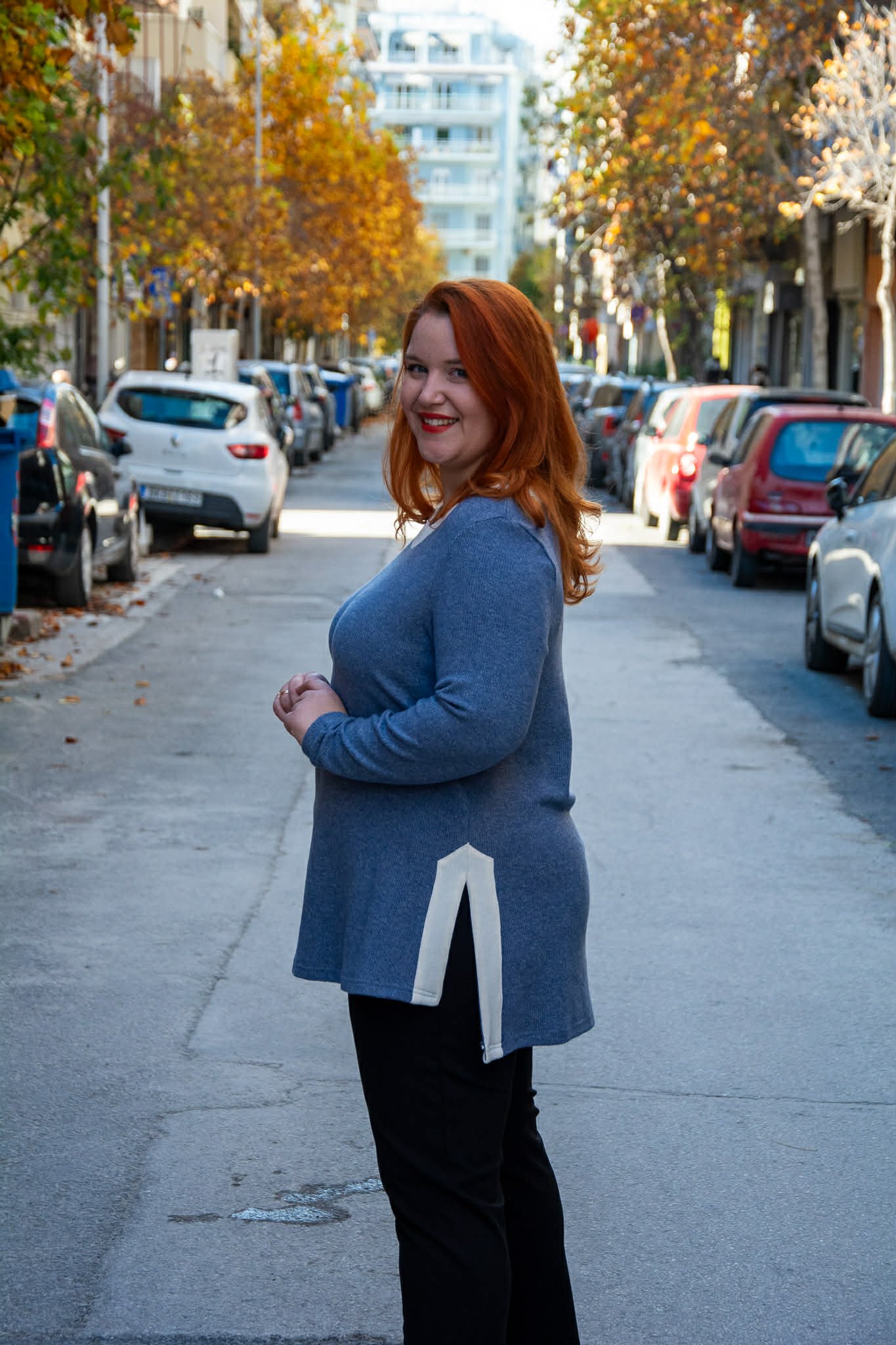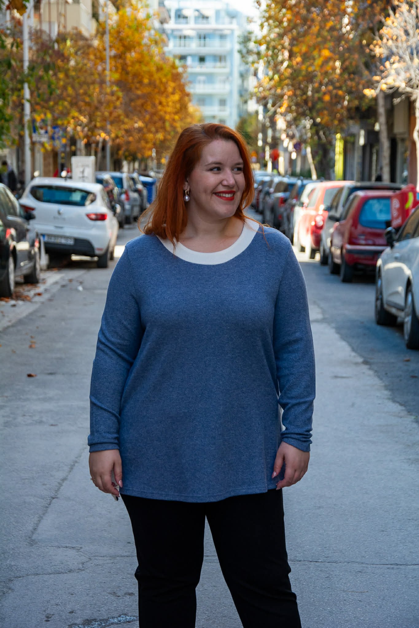 Μπλούζα, σε μεγάλα μεγέθη. Είναι μακριά και έχει στρόγγυλη λαιμόκοψη και έχει άνοιγμα στις πλαϊνές πλευρές. Έχει διχρωμία στο ντεκολτέ και στα ανοίγματα.