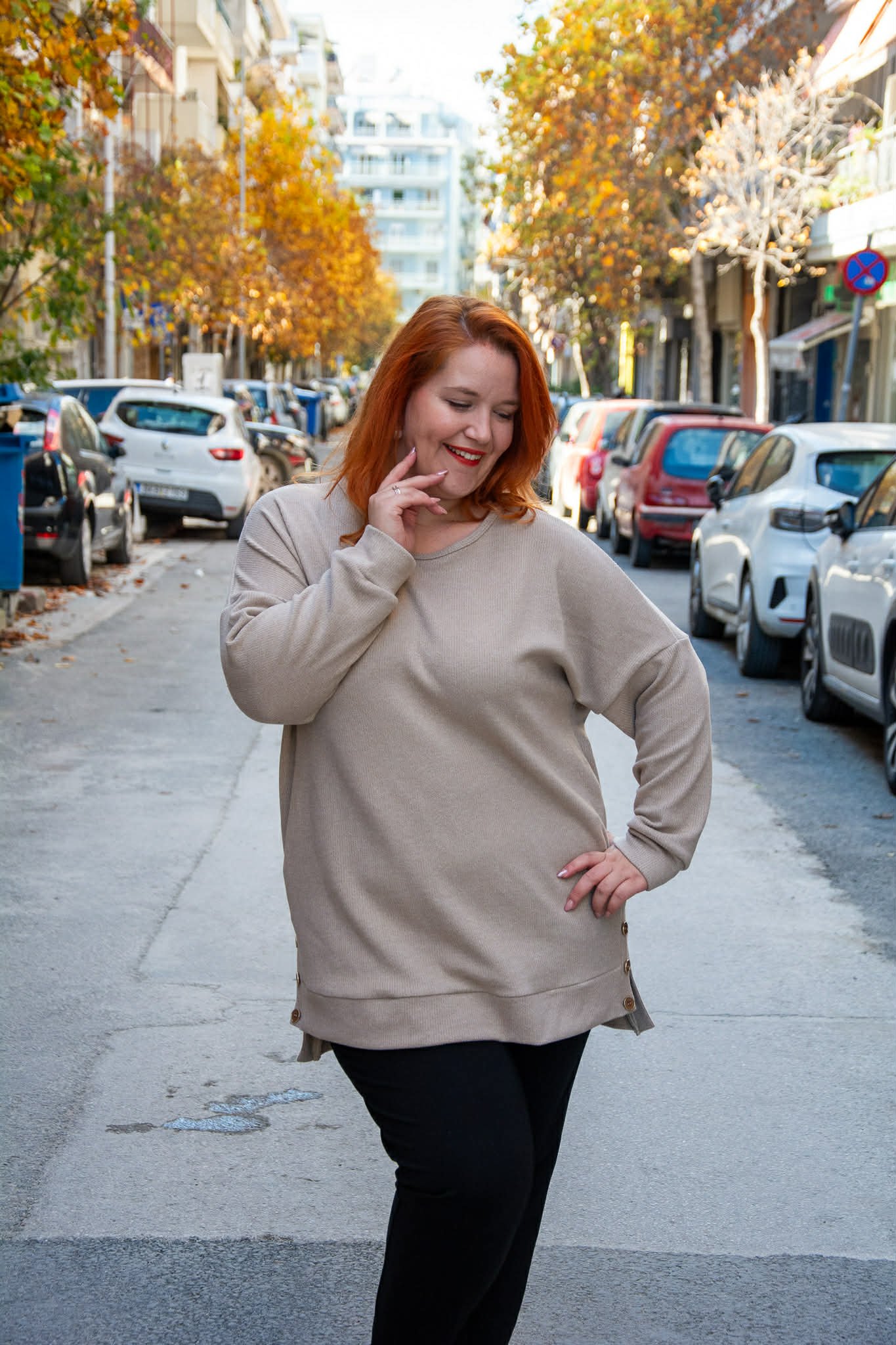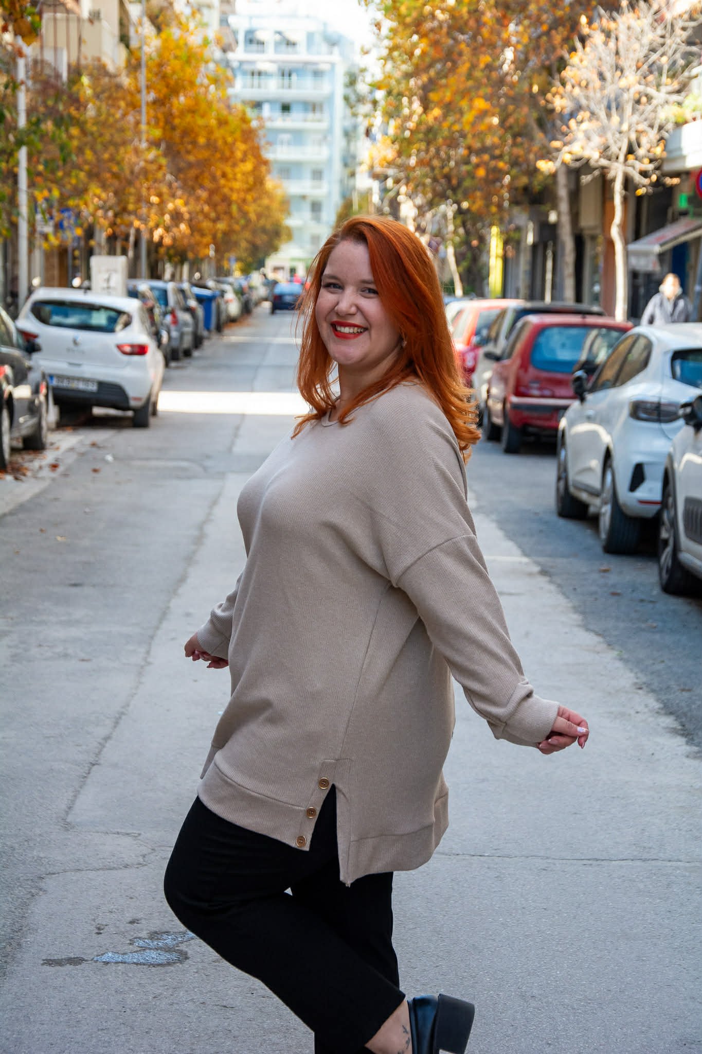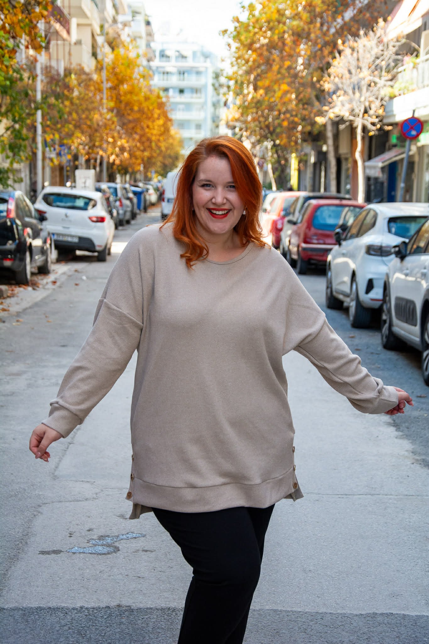 Μπλούζα, σε μεγάλα μεγέθη. Είναι μακριά και έχει στρόγγυλη λαιμόκοψη. Έχει άνοιγμα στις πλαϊνές πλευρές και κουμπάκια στο τελείωμά της.