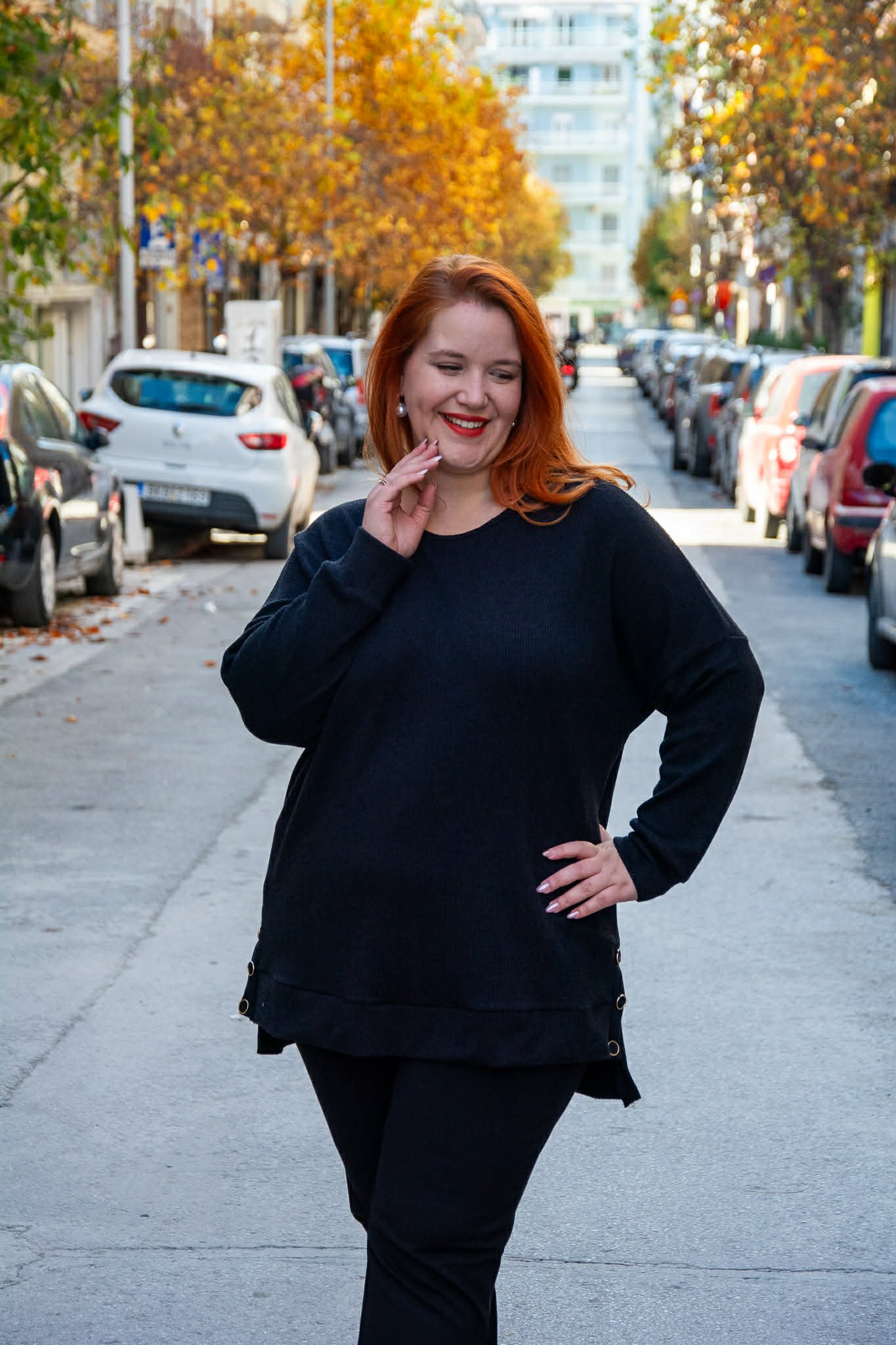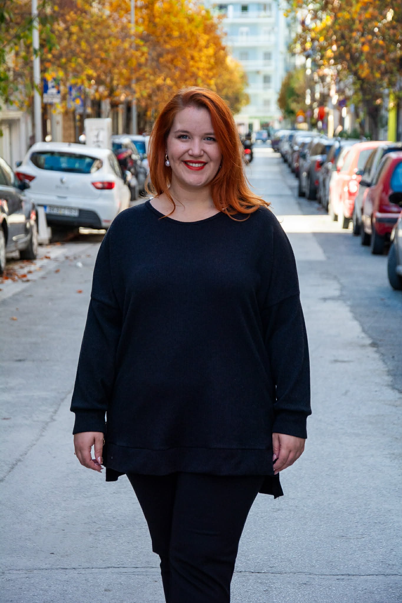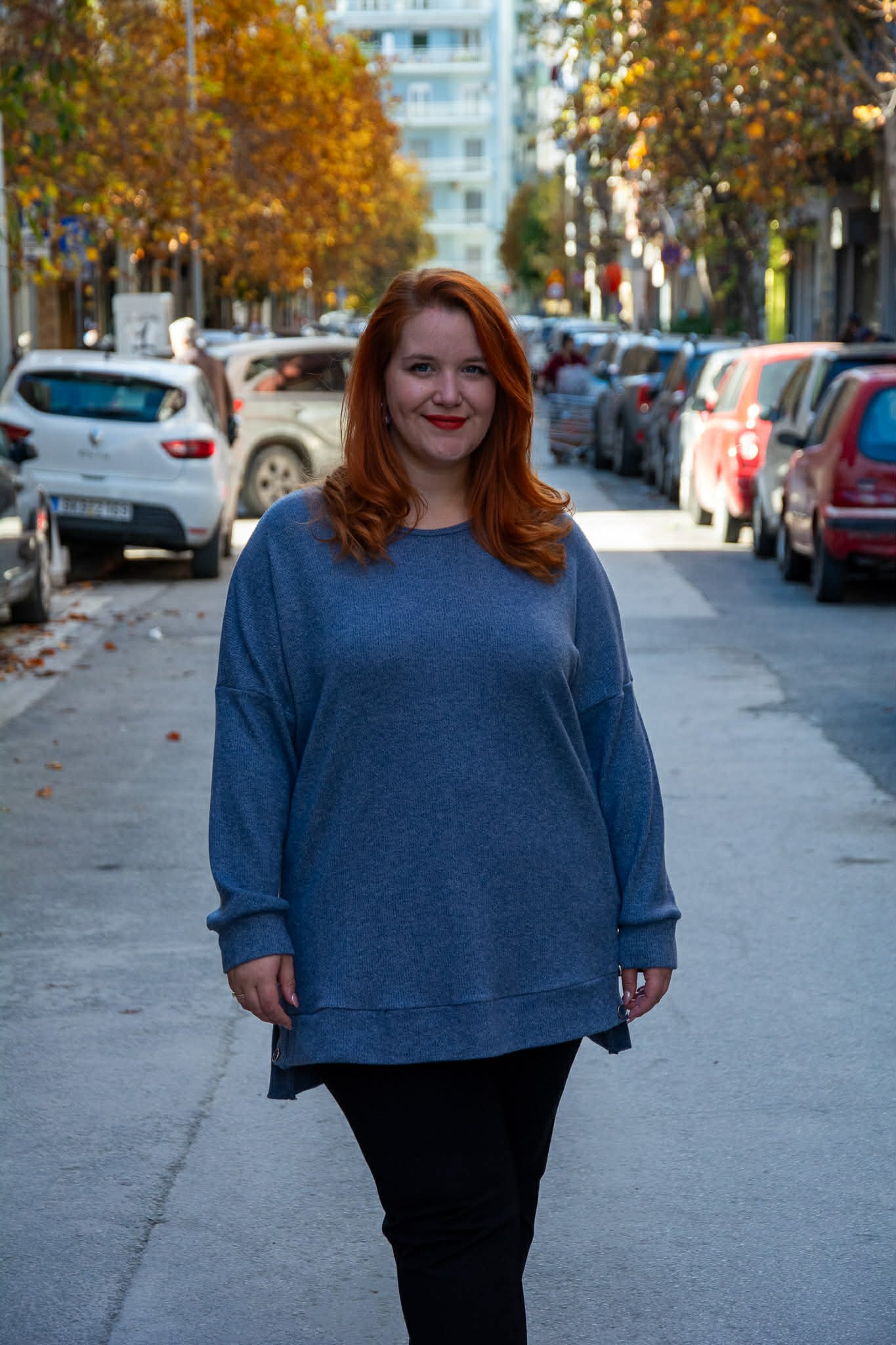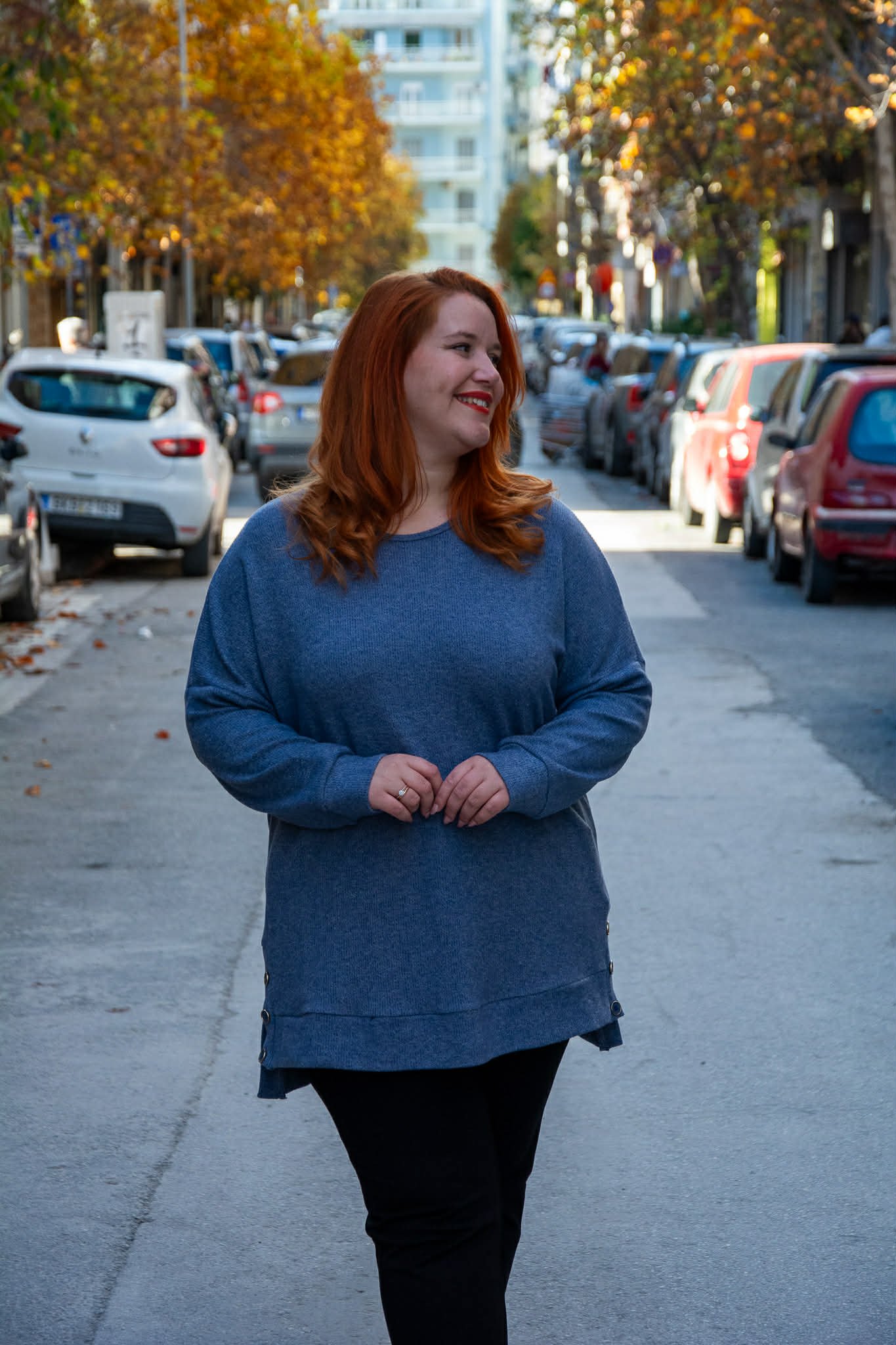 Μπλούζα, σε μεγάλα μεγέθη. Είναι μακριά και έχει στρόγγυλη λαιμόκοψη. Έχει άνοιγμα στις πλαϊνές πλευρές και κουμπάκια στο τελείωμά της.