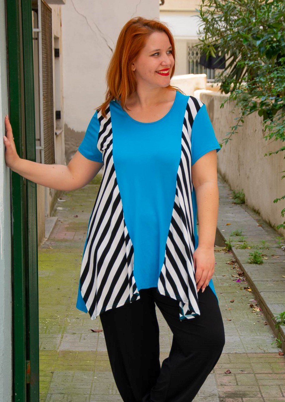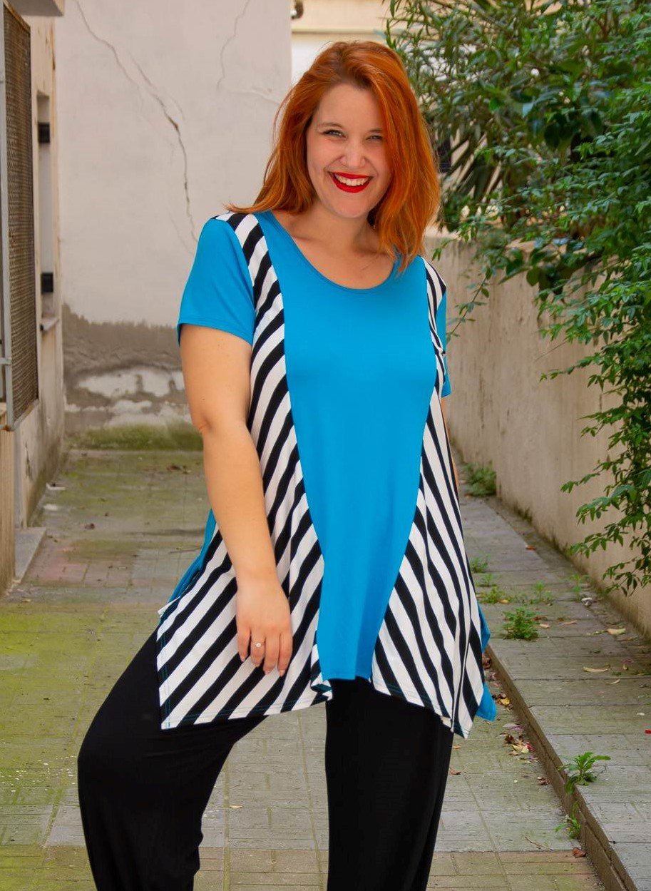 Μπλούζα, σε μεγάλα μεγέθη, με στρογγυλεμένη λαιμόκοψη. Στο κέντρο και στην πλάτη είναι μονόχρωμη, ενώ οι δύο πλαϊνές της δεξιά και αριστερά είναι ριγέ και καταλήγουν σε μύτη με σχισίματα.