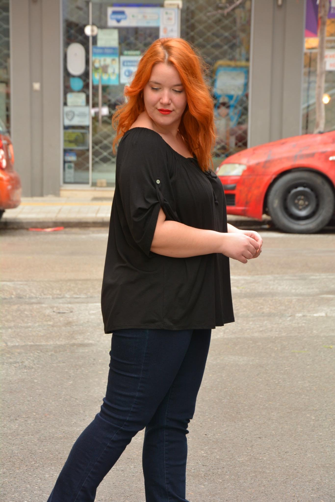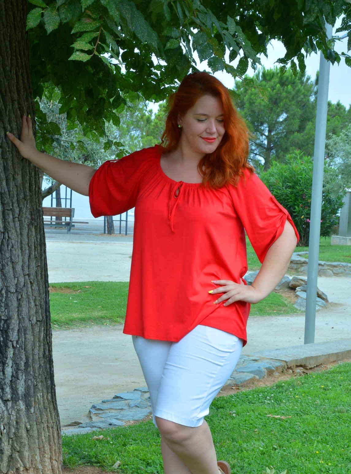 Μπλούζα, σε μεγάλα μεγέθη, με ντεκολτέ χαμόγελο που έχει λάστιχο για να μπορεί να φορεθεί και έξωμη. Στο κέντρο εμπρός του ντεκολτέ έχει κορδελάκι. Το μανίκι είναι 3/4 που αναδιπλώνεται με κουμπί.