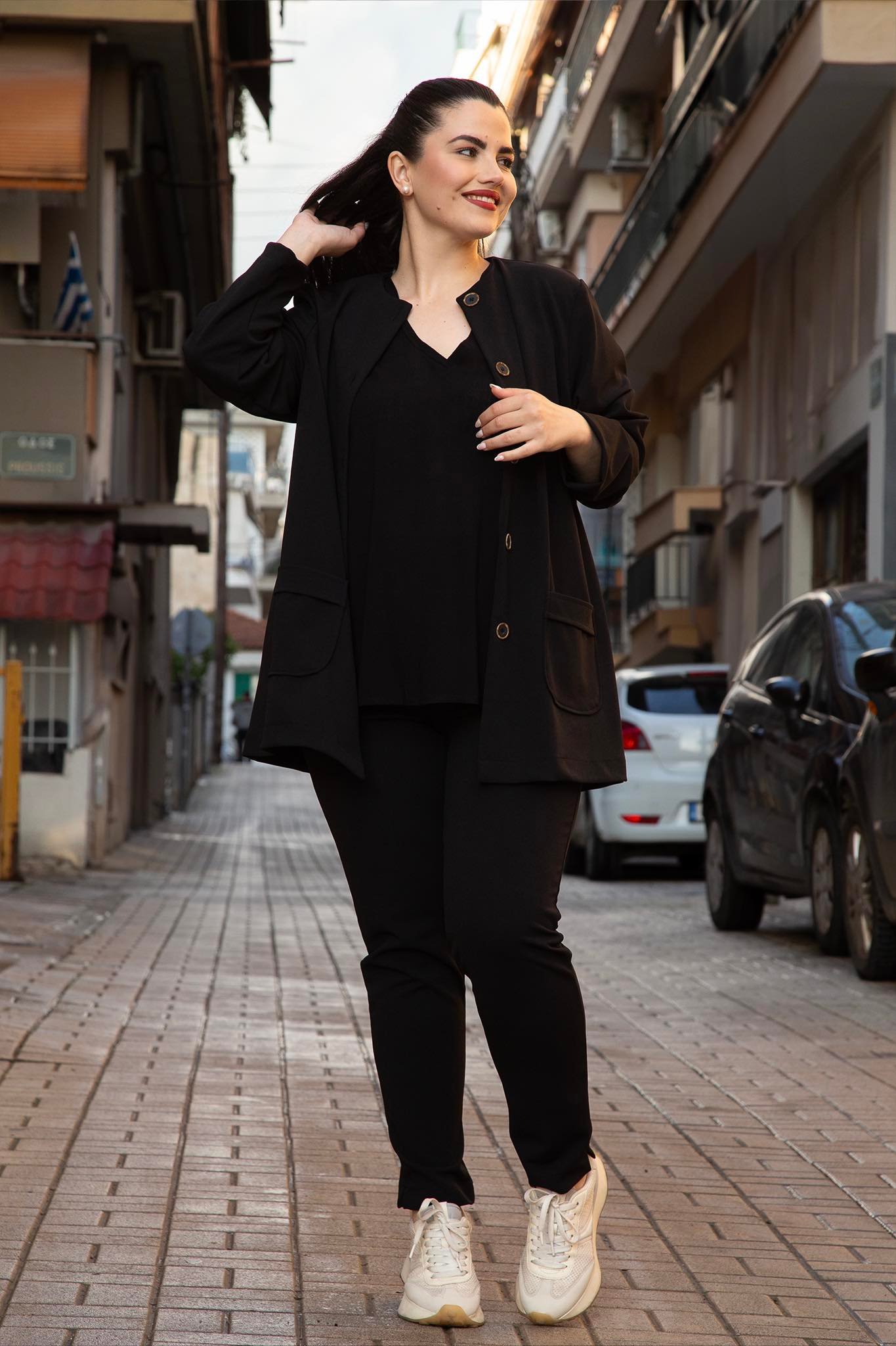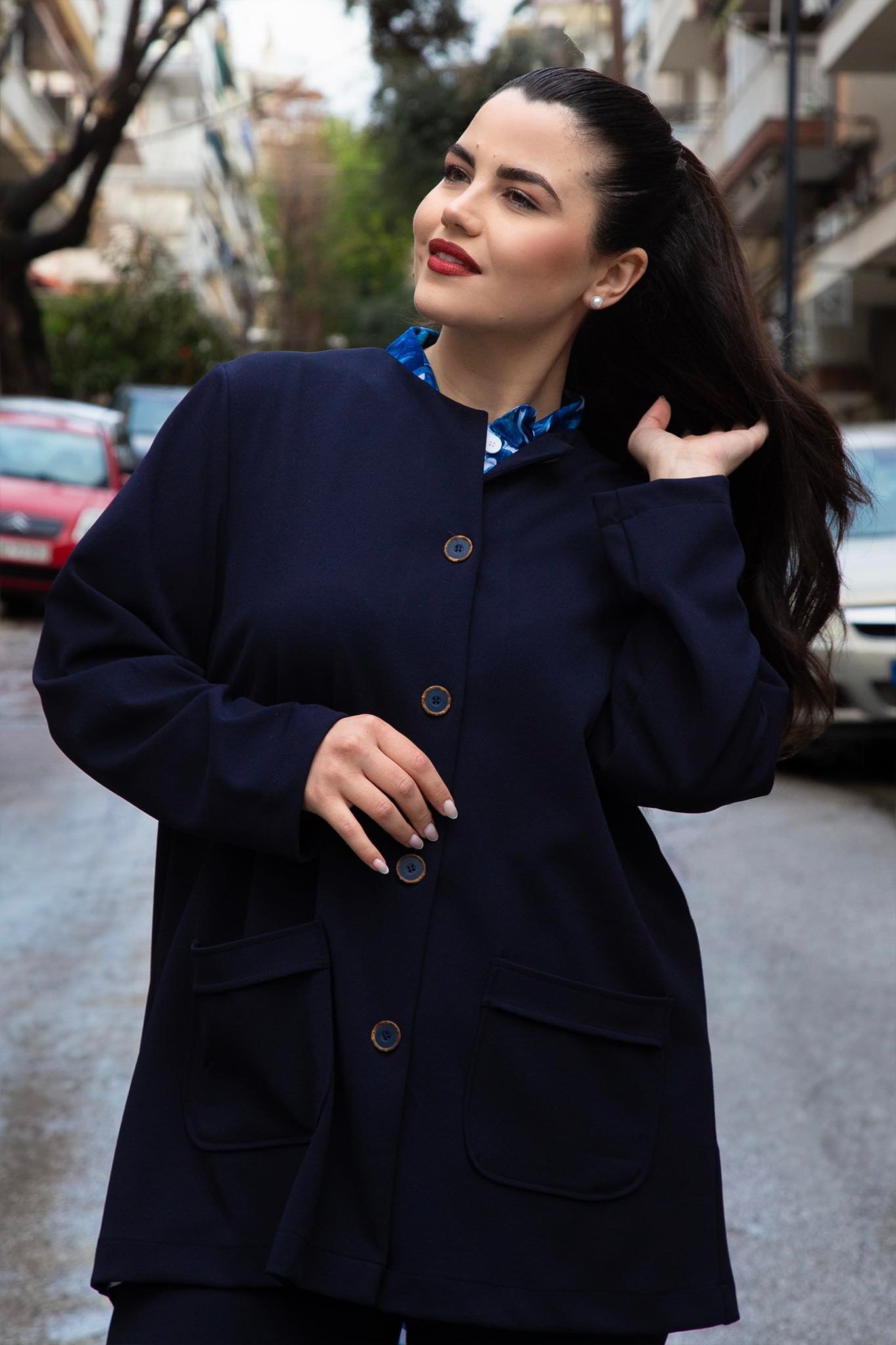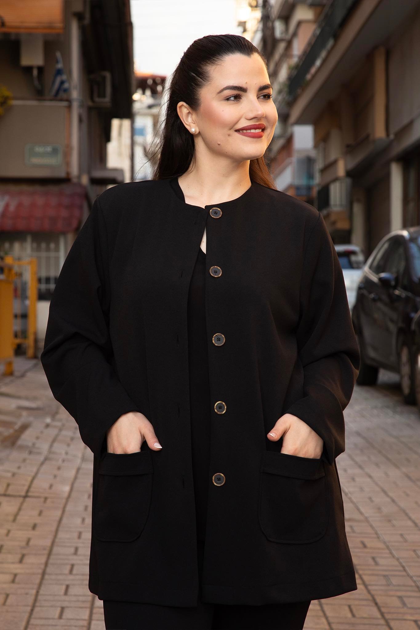 Ζακέτα, σε μεγάλα μεγέθη, με στρογγυλεμένη λαιμόκοψη, εξωτερικές τσέπες και κουμπώνει με πέντε κουμπιά. Καλύπτει περιφέρεια.