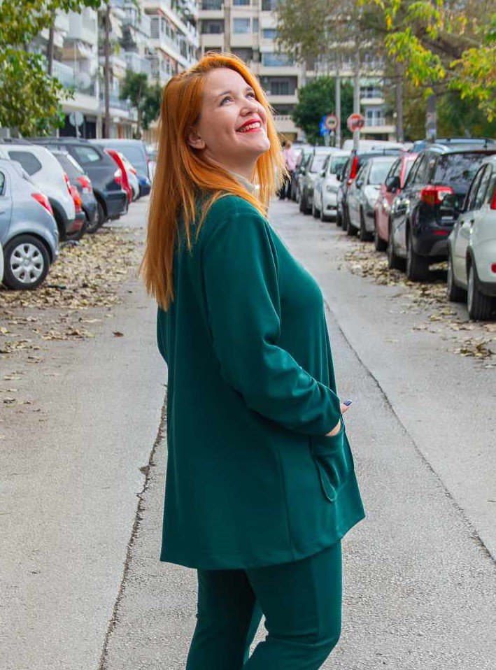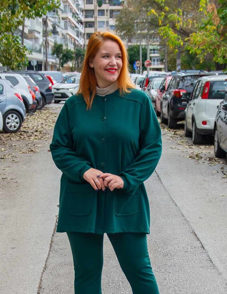 Ζακέτα, σε μεγάλα μεγέθη, με στρογγυλεμένη λαιμόκοψη, εξωτερικές τσέπες και κουμπώνει με πέντε κουμπιά. Καλύπτει περιφέρεια.