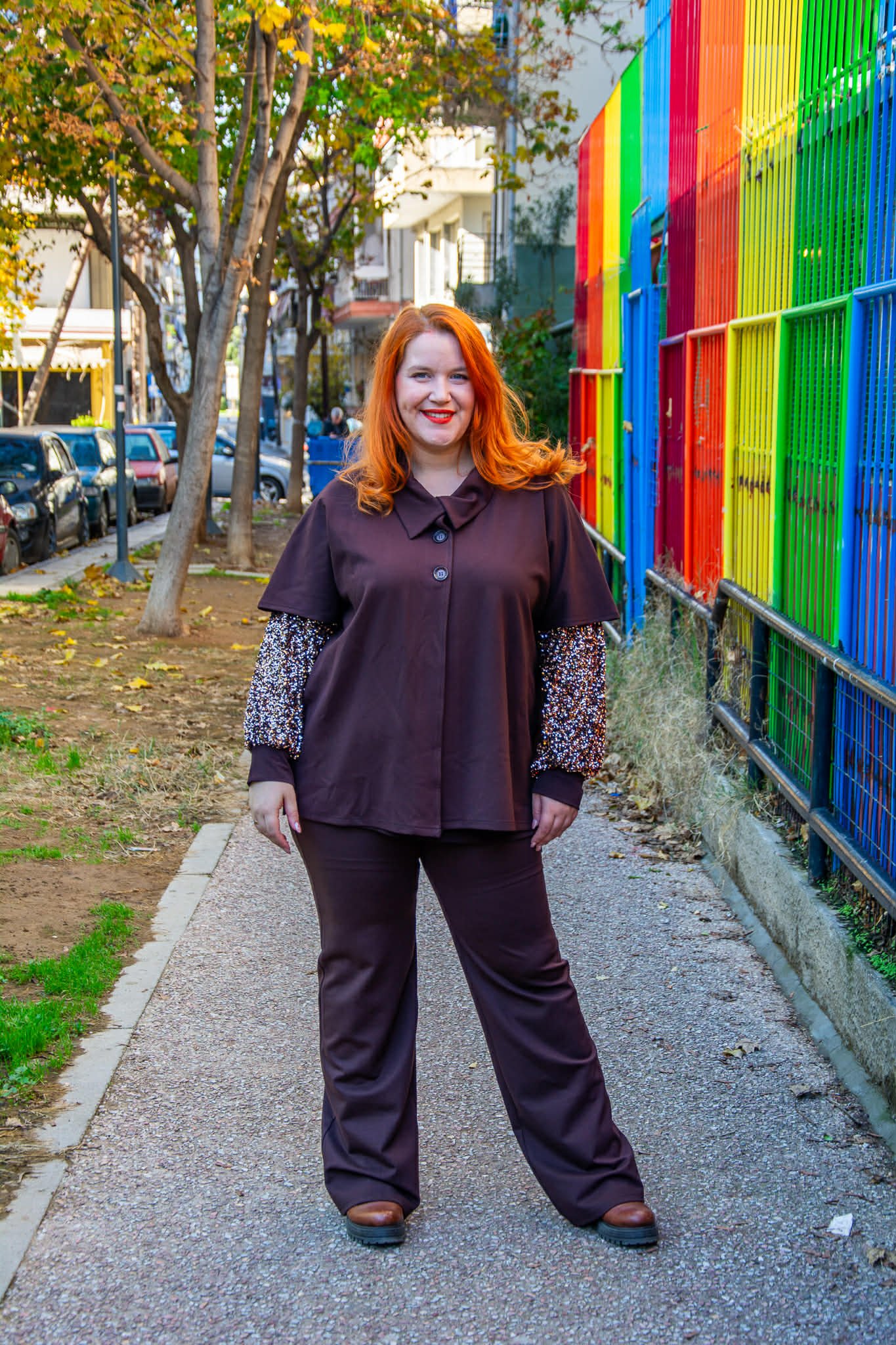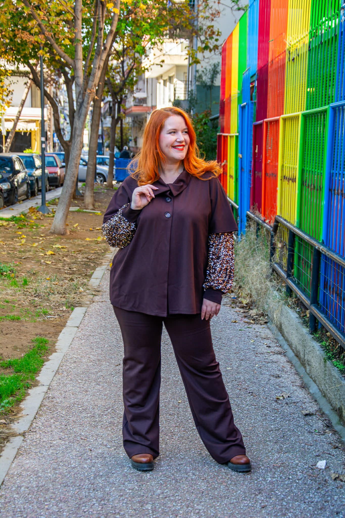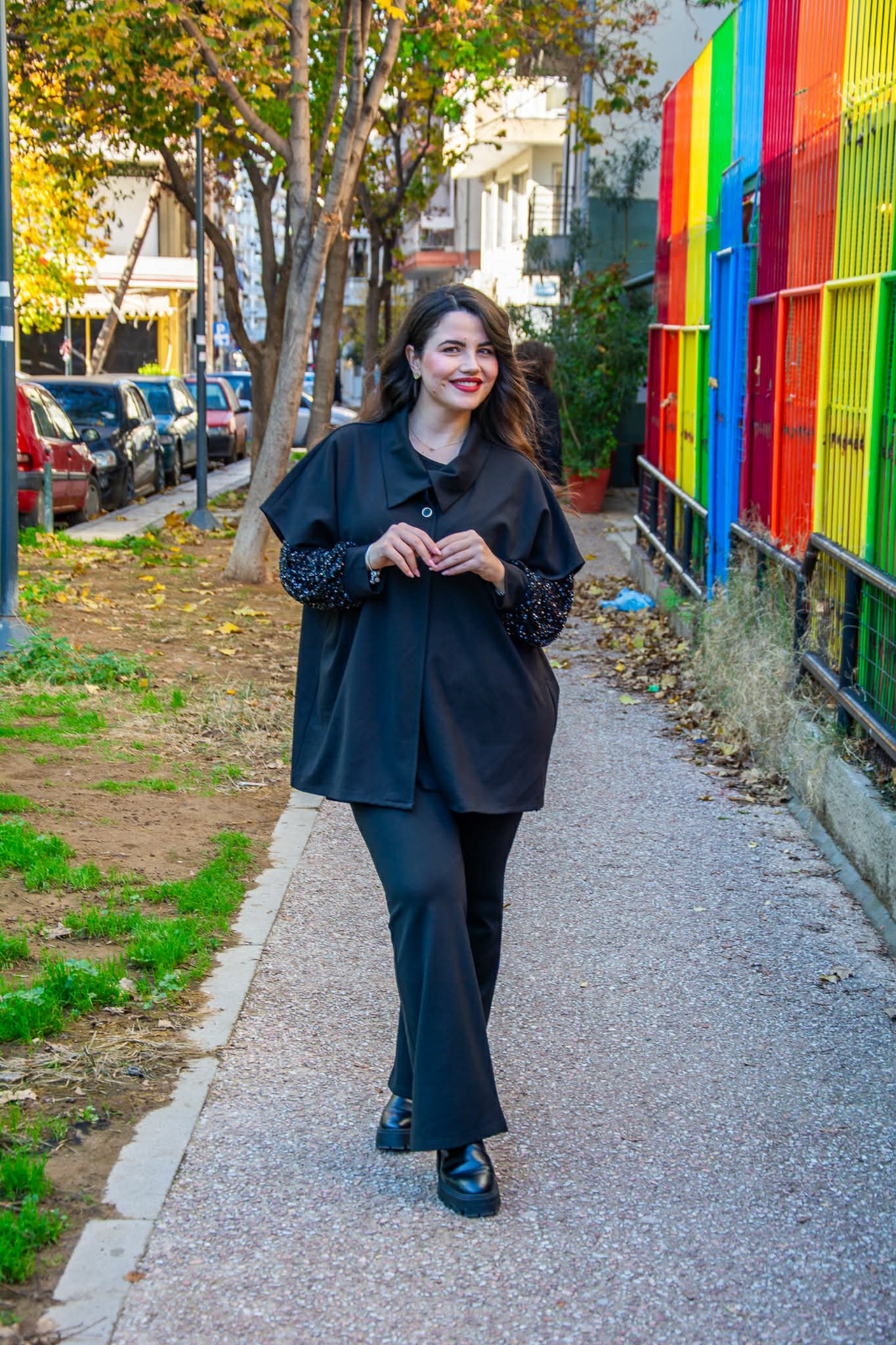 Ζακέτα κάπα, σε μεγάλα μεγέθη. Έχει πέτο και κουμπώνει με 3 κουμπιά. Καλύπτει περιφέρεια.