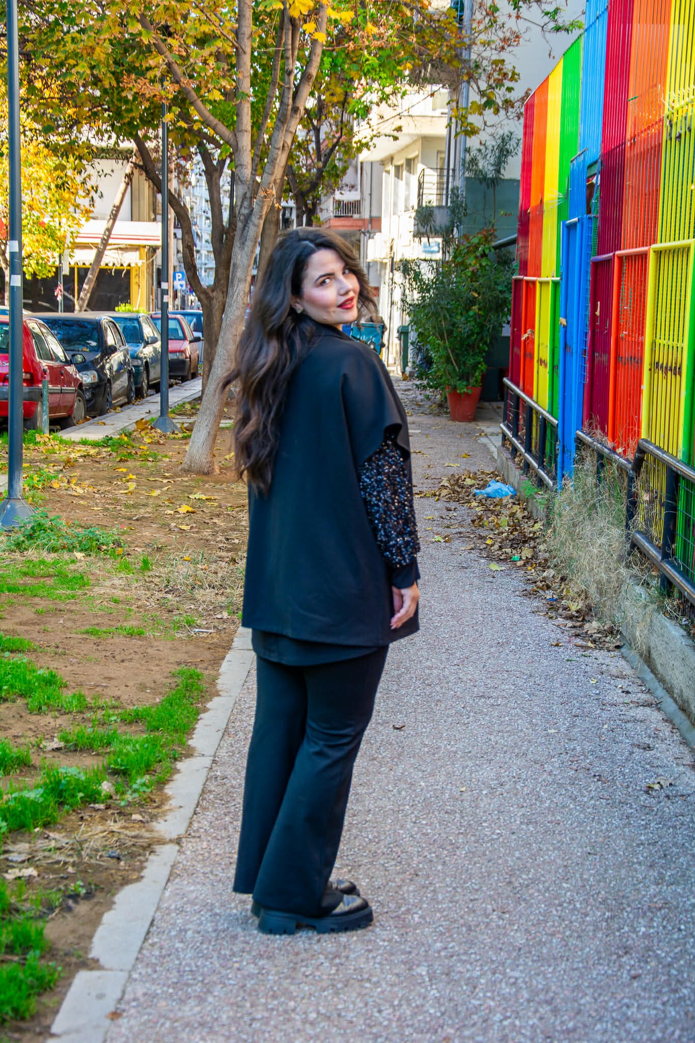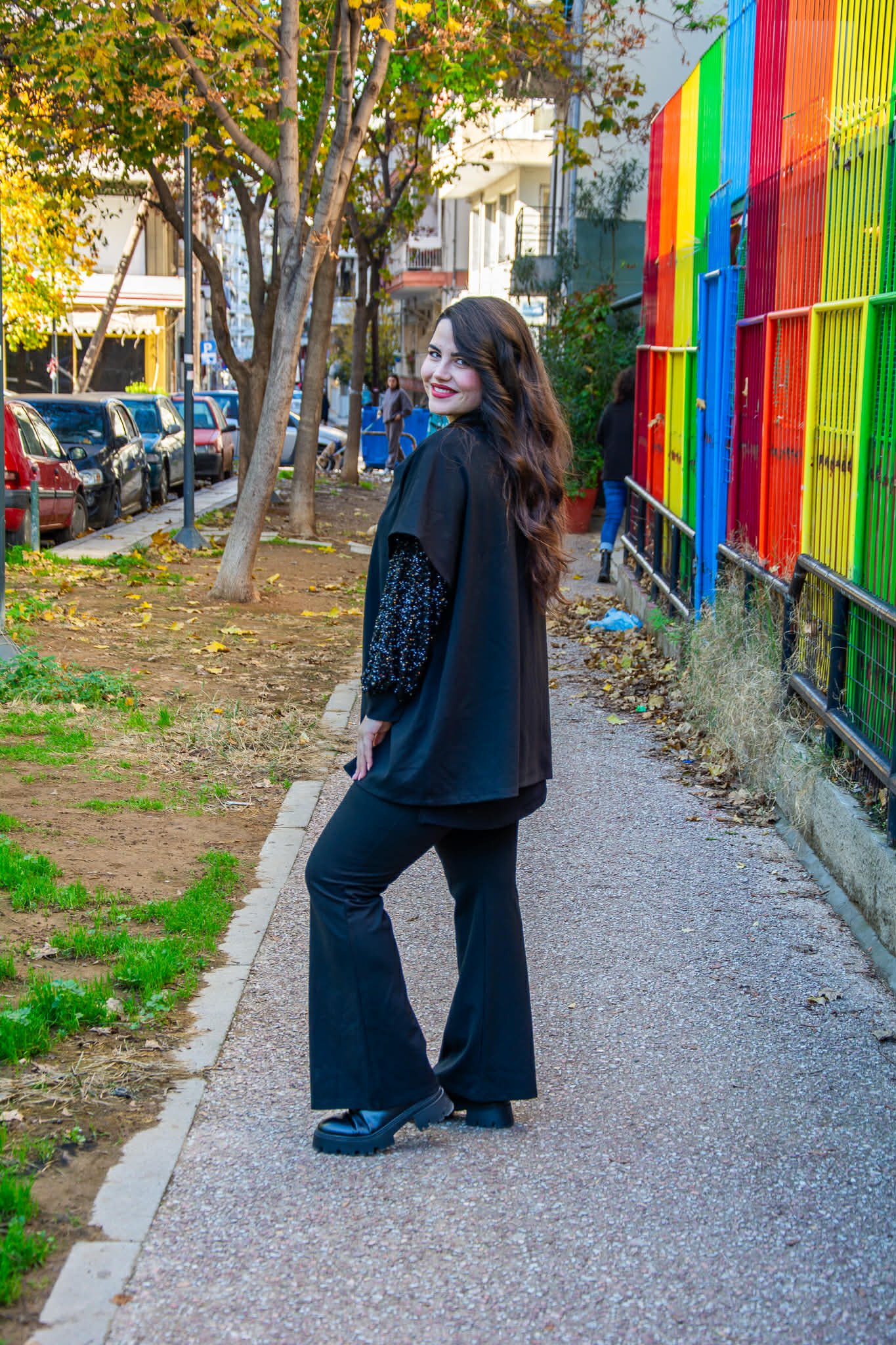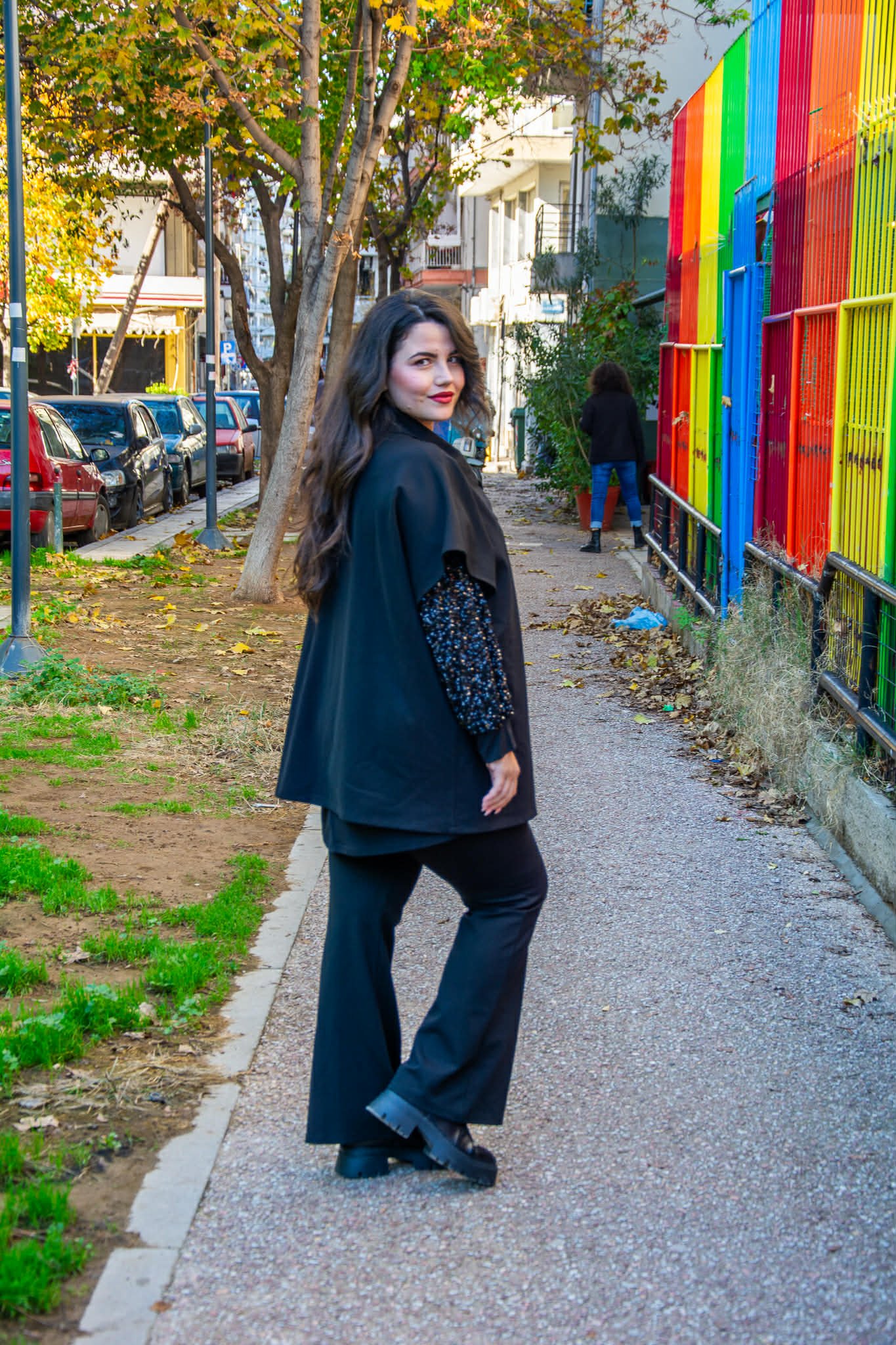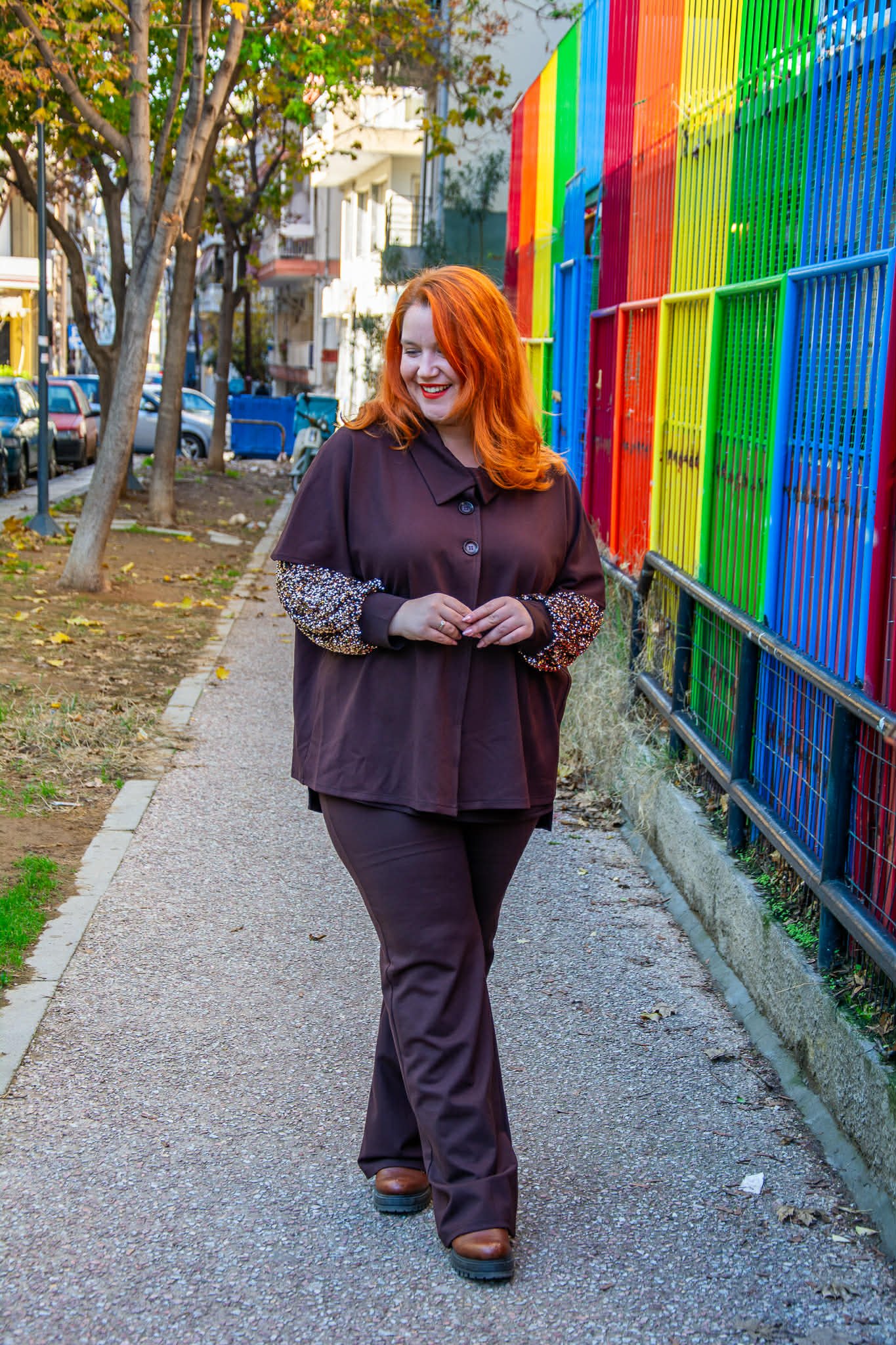 Ζακέτα κάπα, σε μεγάλα μεγέθη. Έχει πέτο και κουμπώνει με 3 κουμπιά. Καλύπτει περιφέρεια.