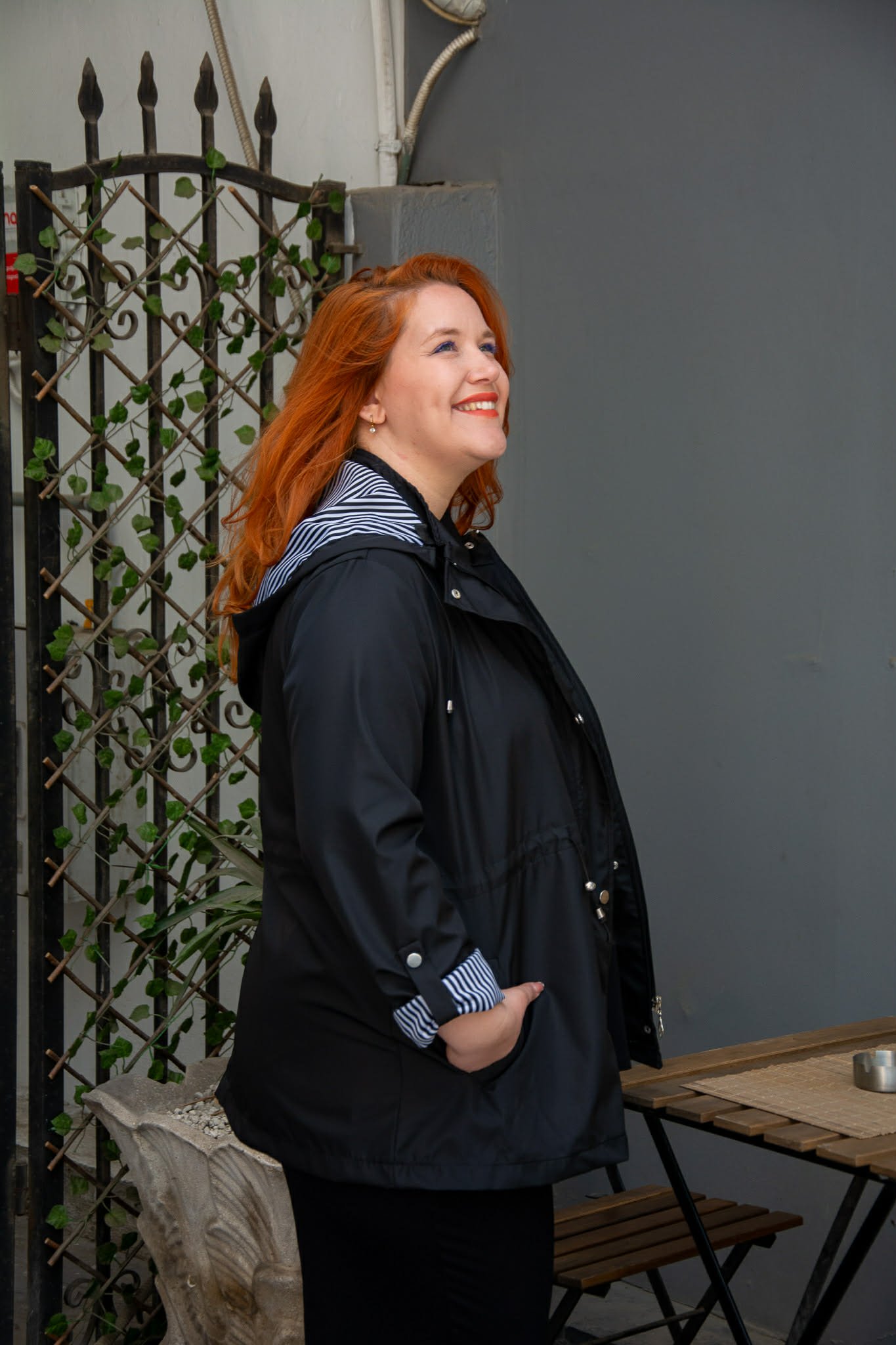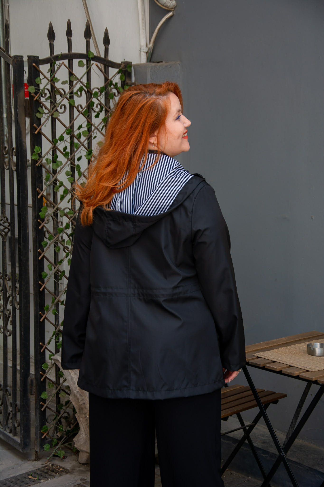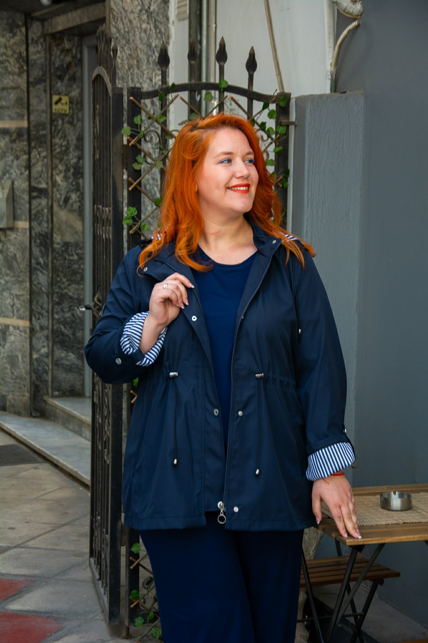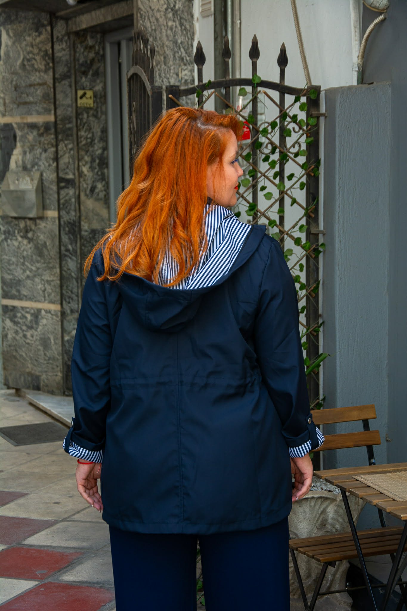 Ελαφρύ μπουφάν, σε μεγάλα μεγέθη. Διαθέτει αποσπώμενη κουκούλα και τσέπες μπροστά. Κλείνει με φερμουάρ και κουμπιά και μαζεύει στη μέση για πιο μεσάτη εφαρμογή. Είναι μακρυμάνικο και μαζεύει με κουμπί.