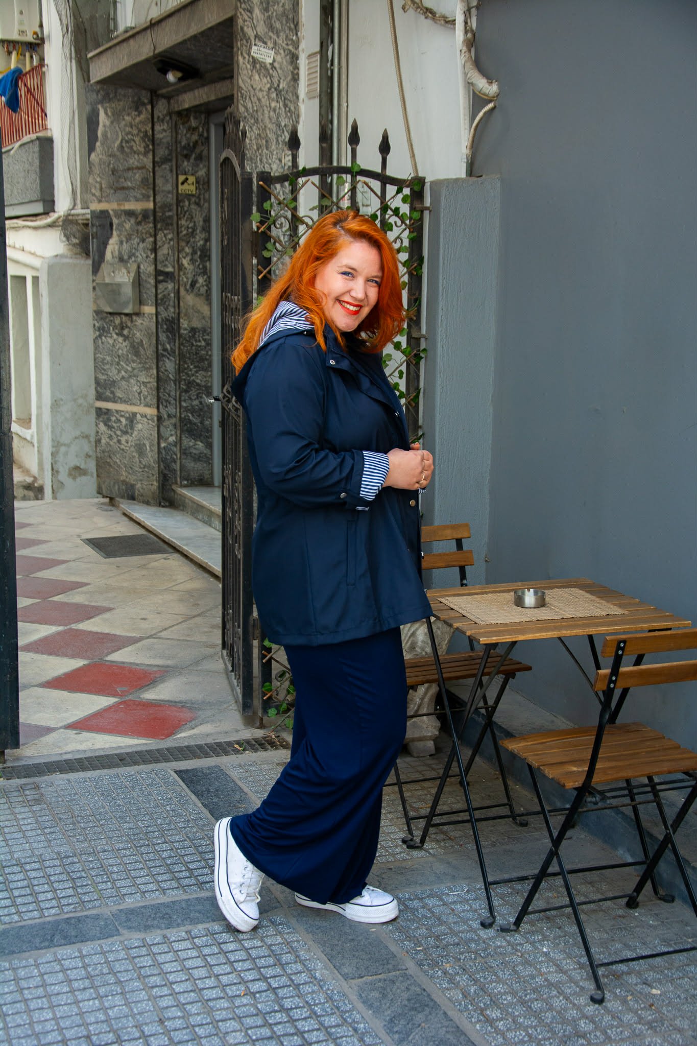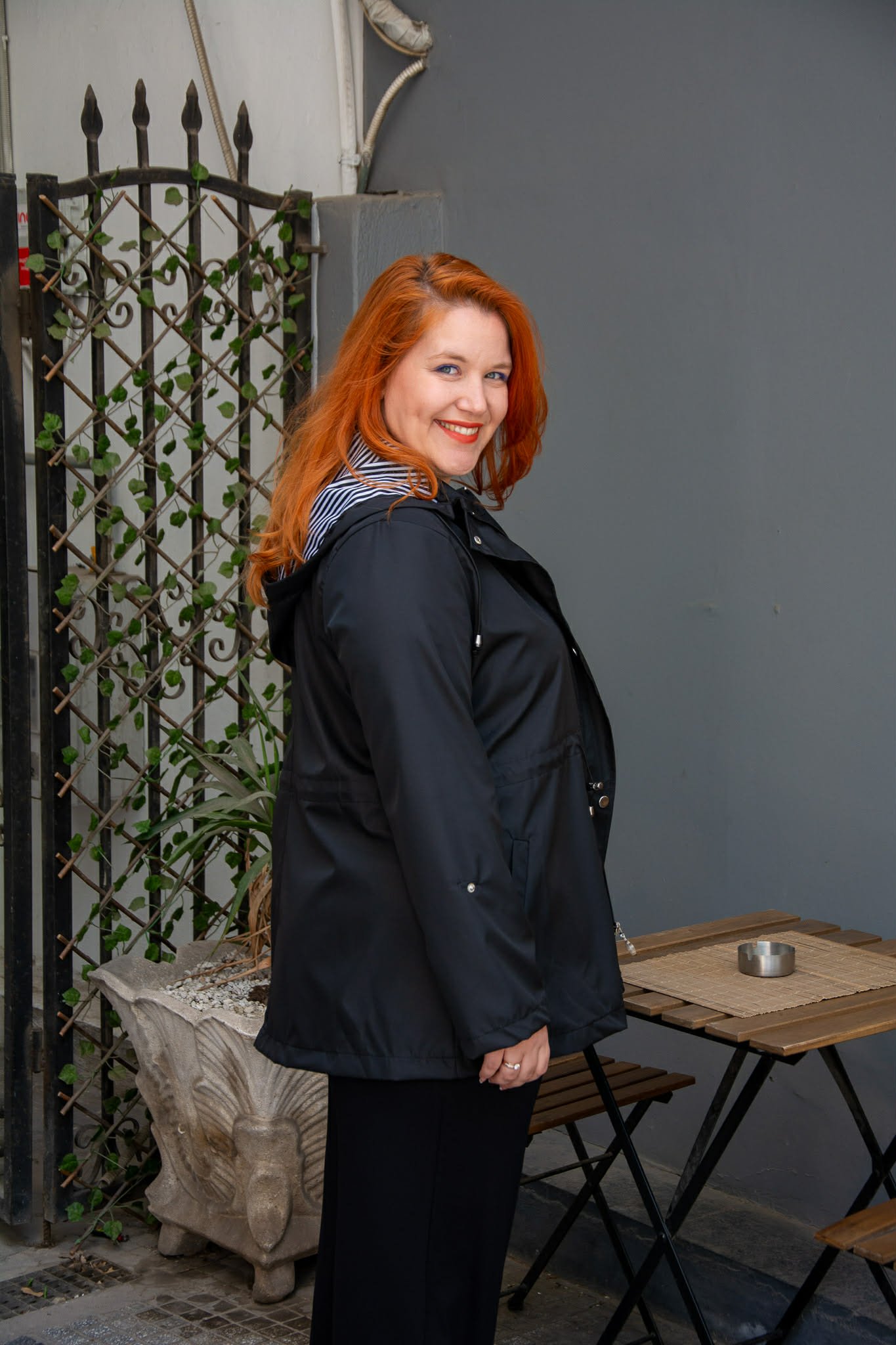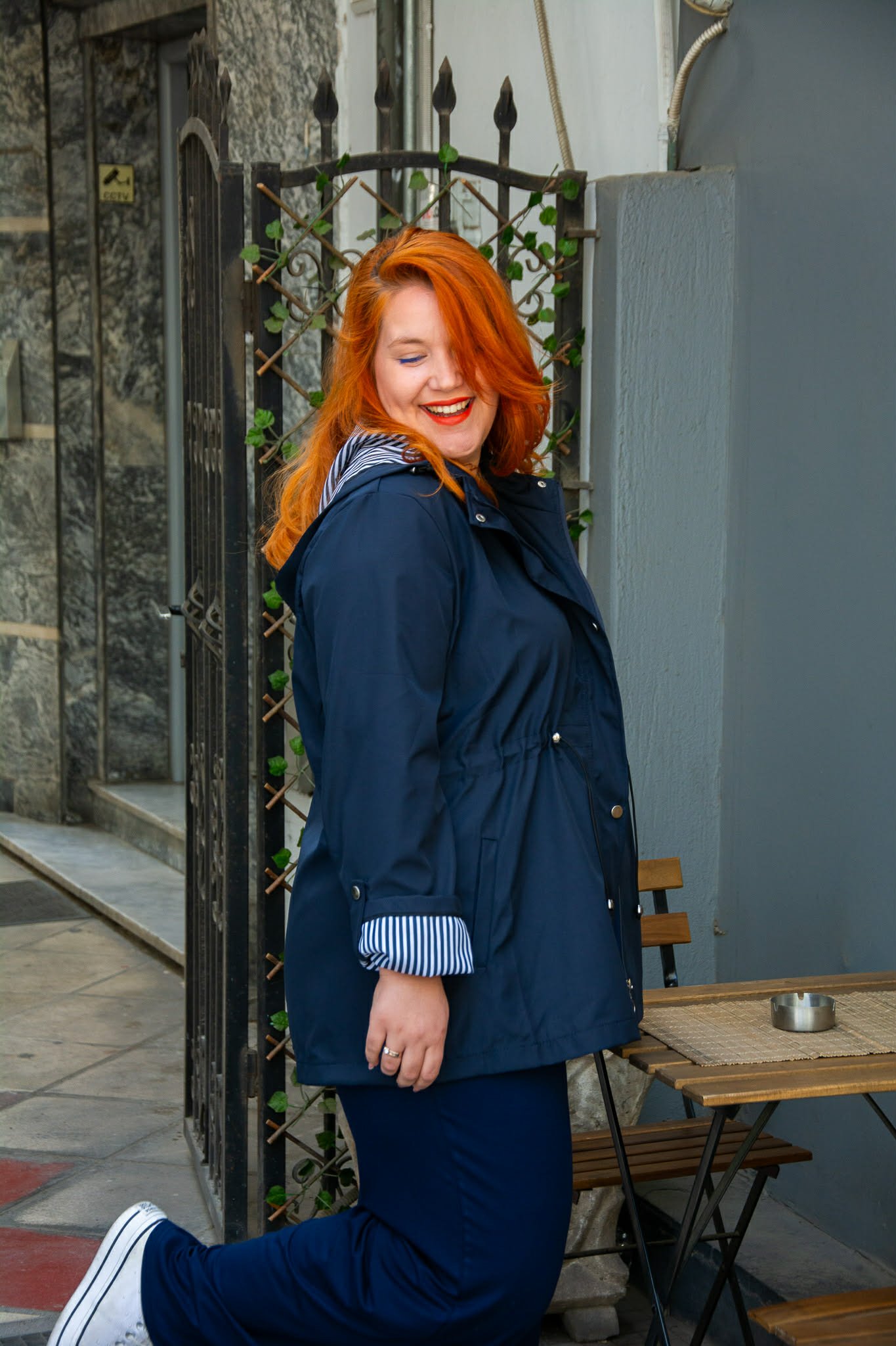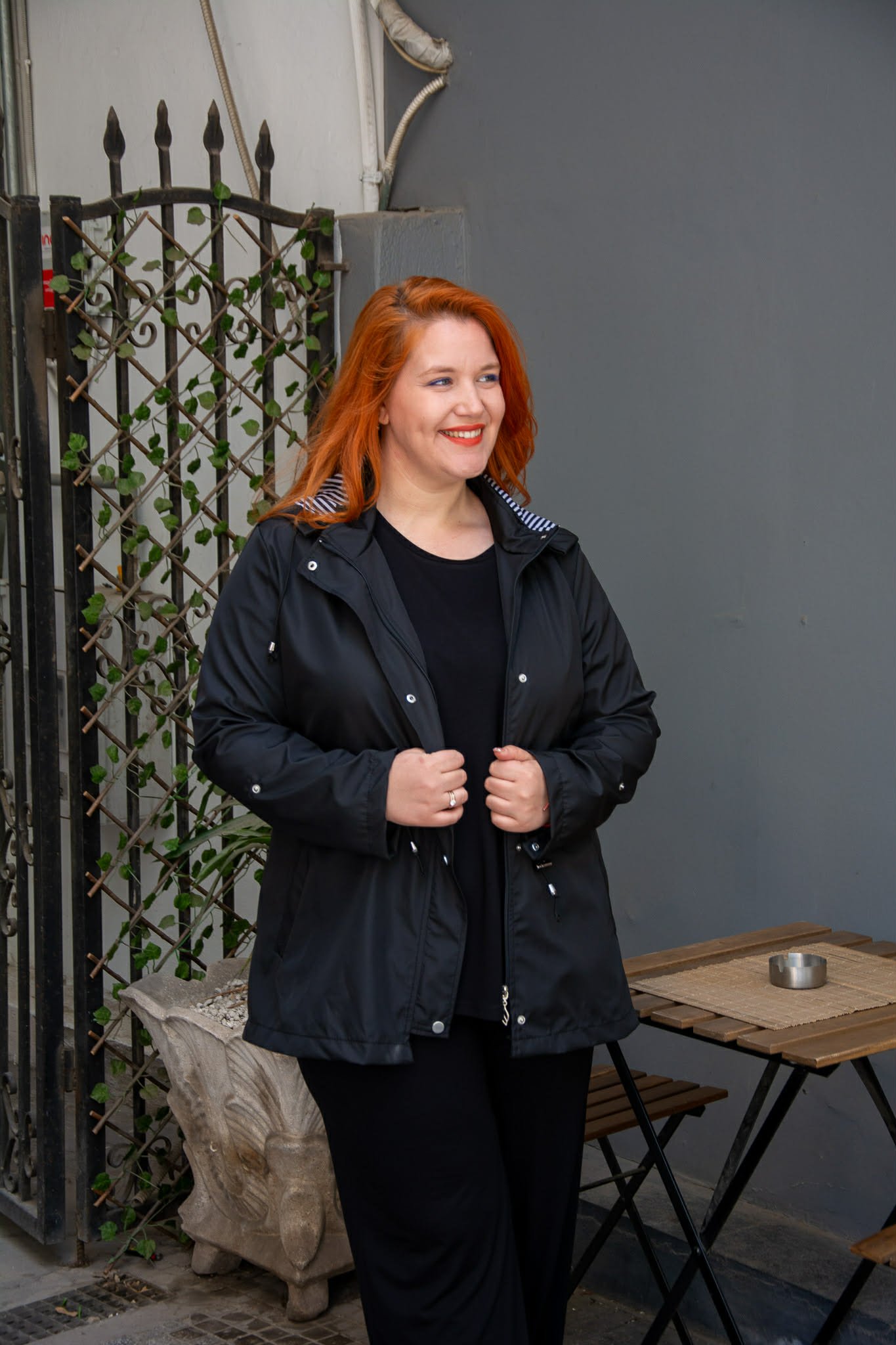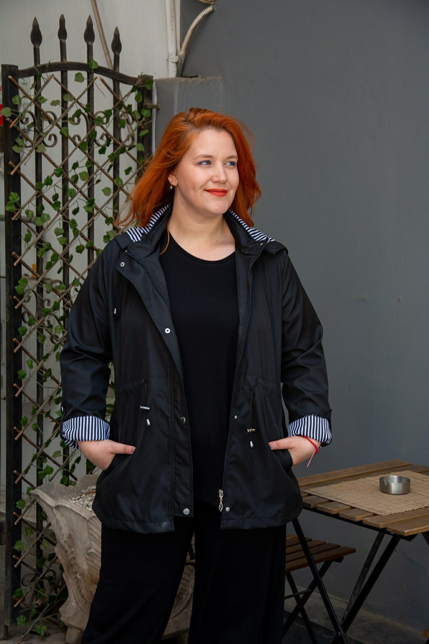 Ελαφρύ μπουφάν, σε μεγάλα μεγέθη. Διαθέτει αποσπώμενη κουκούλα και τσέπες μπροστά. Κλείνει με φερμουάρ και κουμπιά και μαζεύει στη μέση για πιο μεσάτη εφαρμογή. Είναι μακρυμάνικο και μαζεύει με κουμπί.