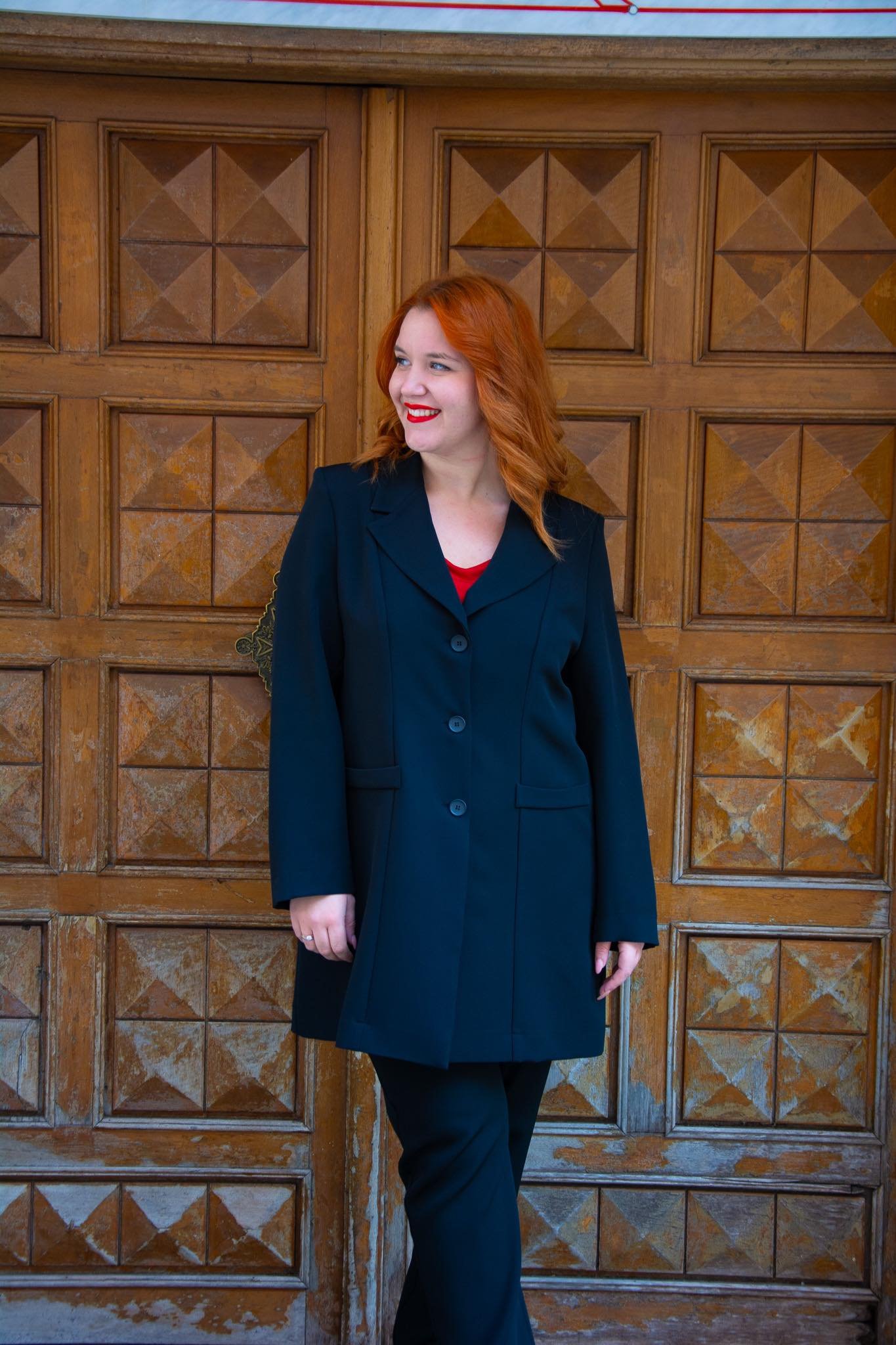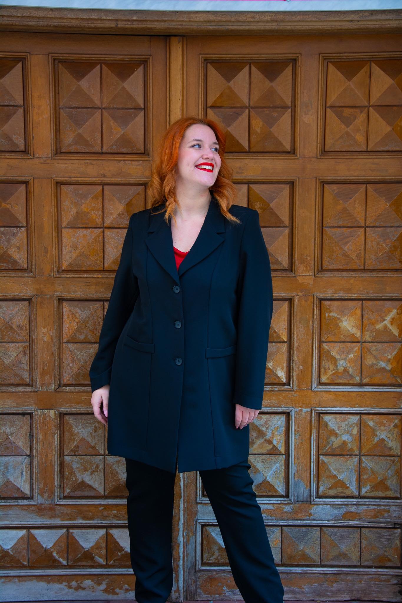 Σακάκι μακρύ, σε μεγάλα μεγέθη. Έχει ίσια γραμμή, πέτο γιακά, 3 κουμπιά και μη λειτουργικές τσέπες.