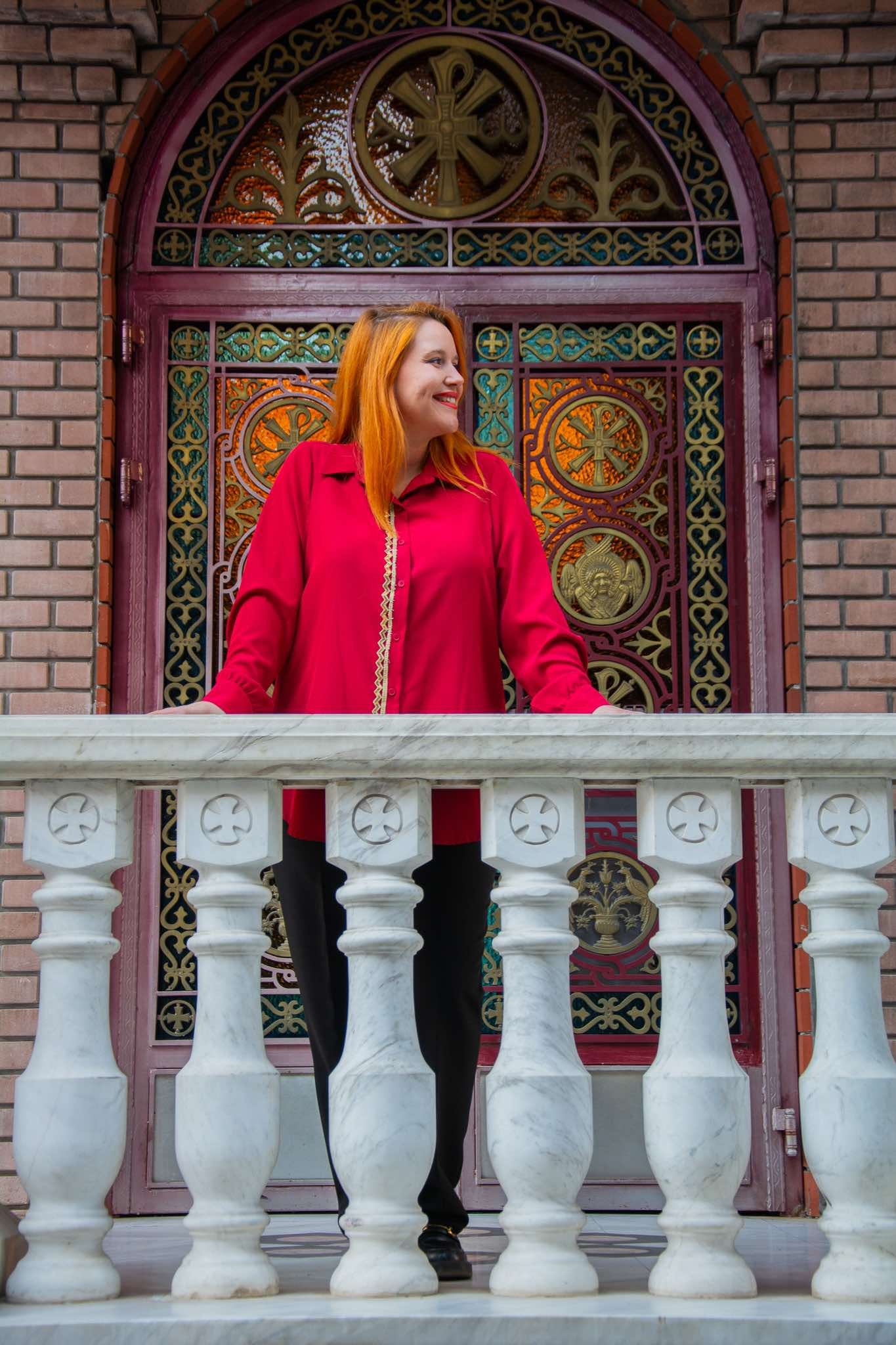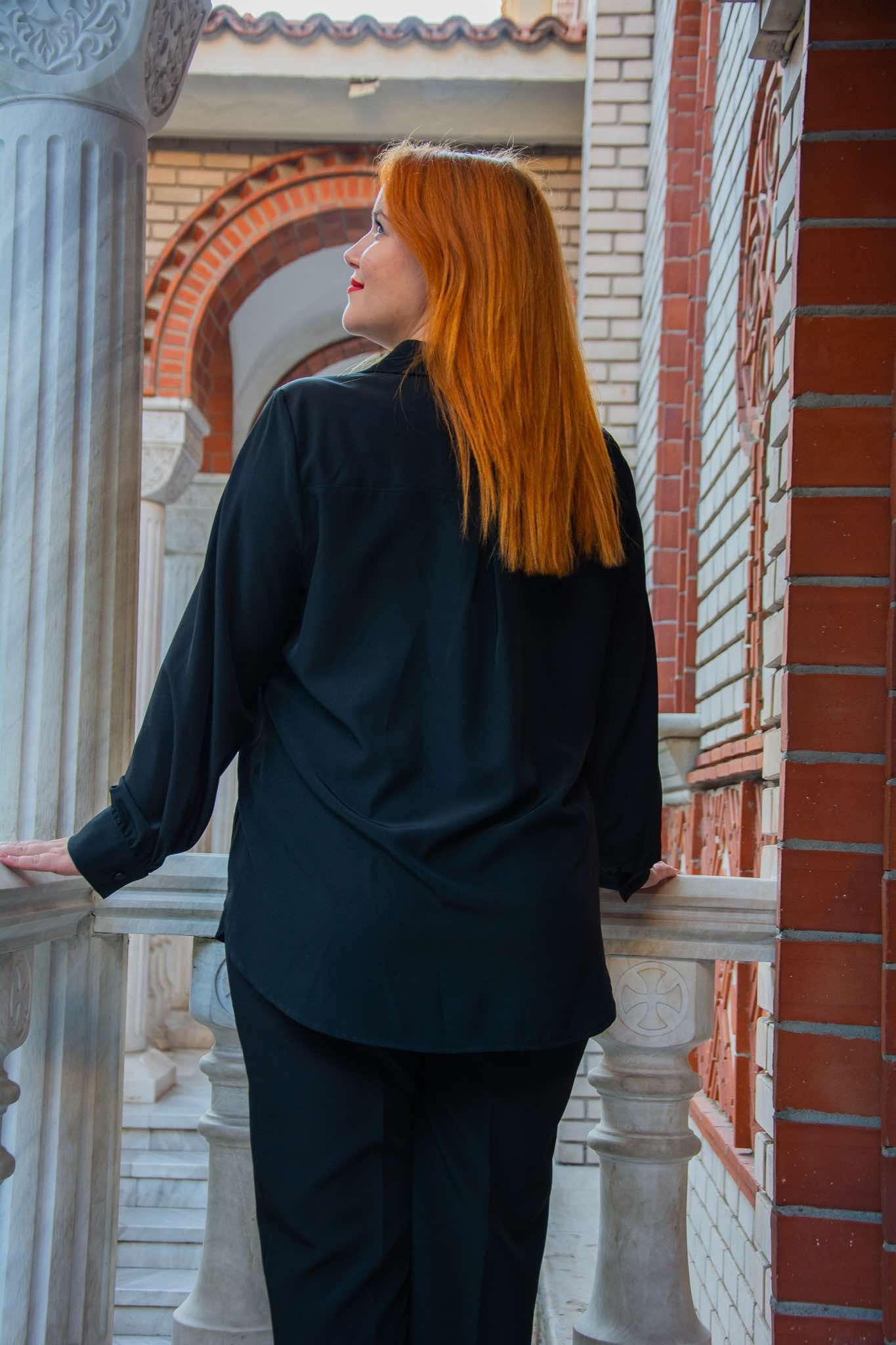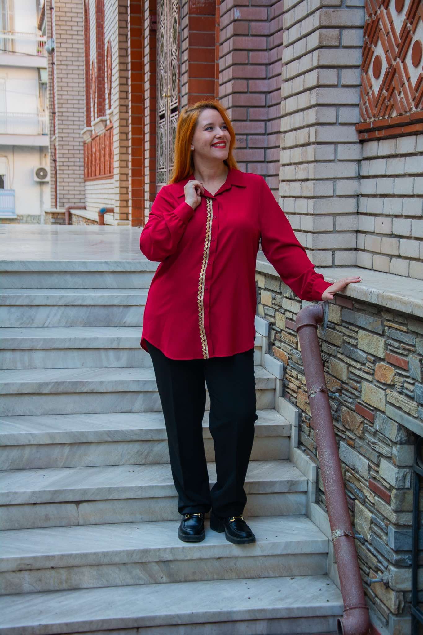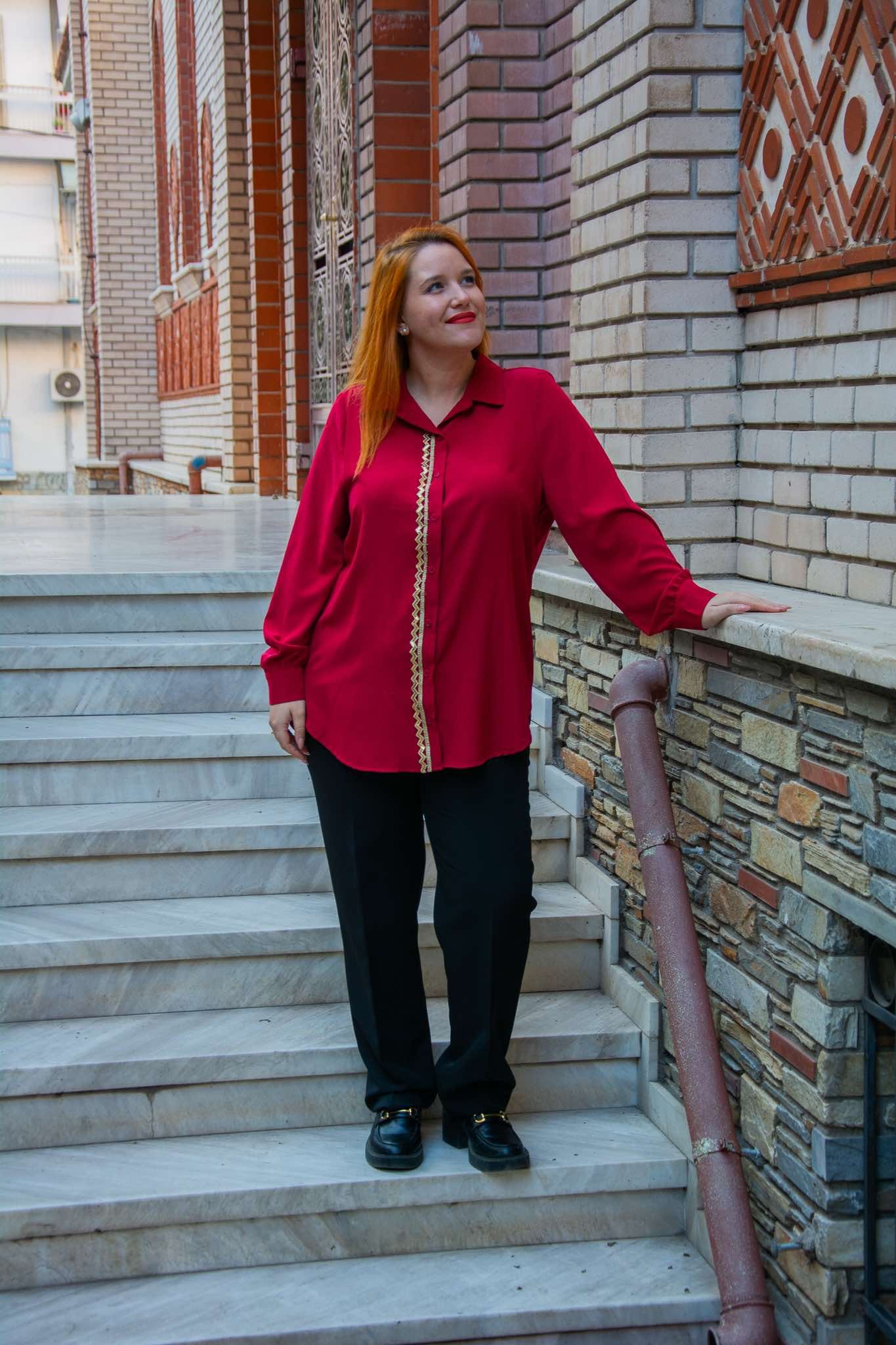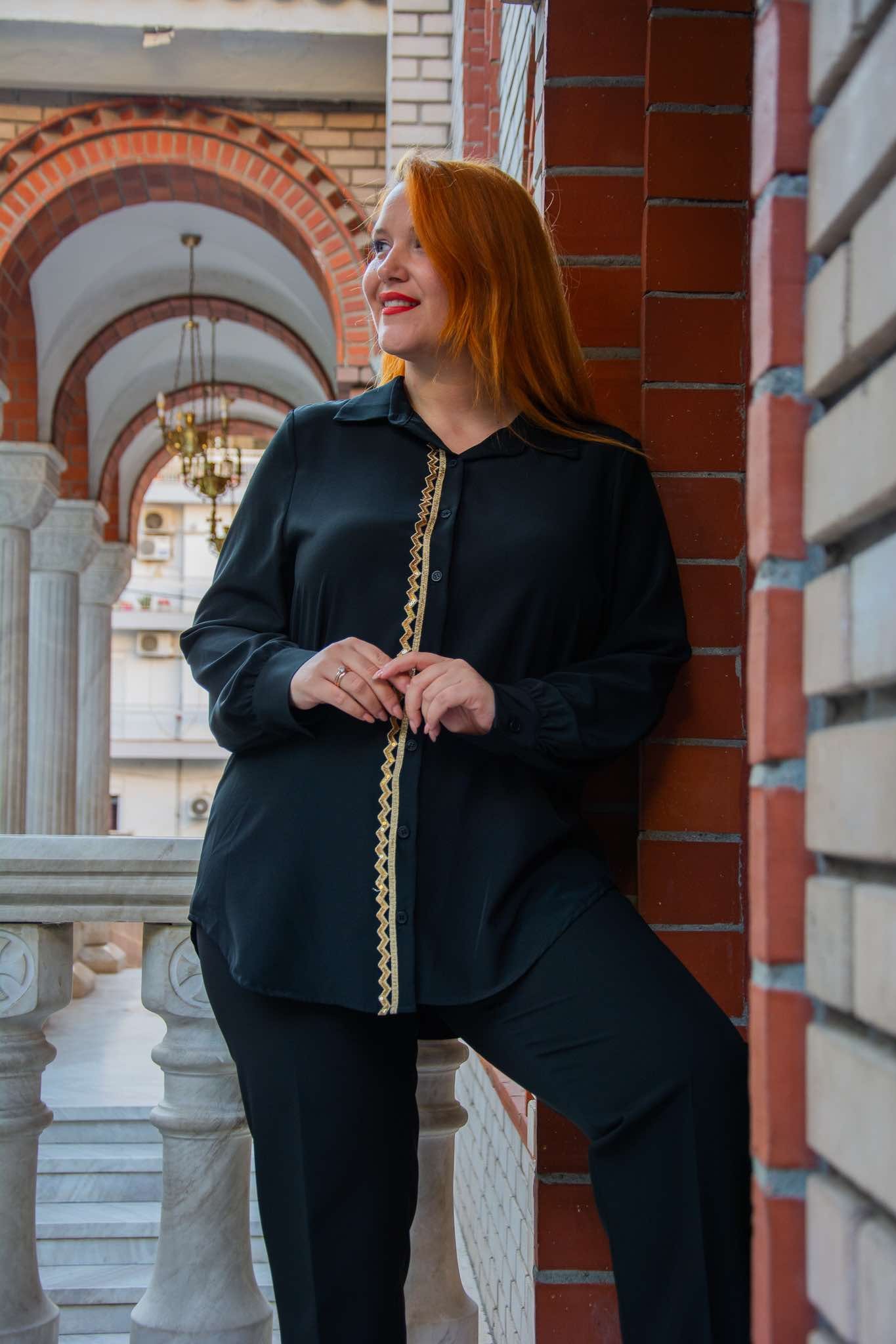 Πουκάμισο, σε μεγάλα μεγέθη. Έχει κάθετη χρυσή τρέσα δίπλα στα κουμπιά και καλύπτει περιφέρεια.