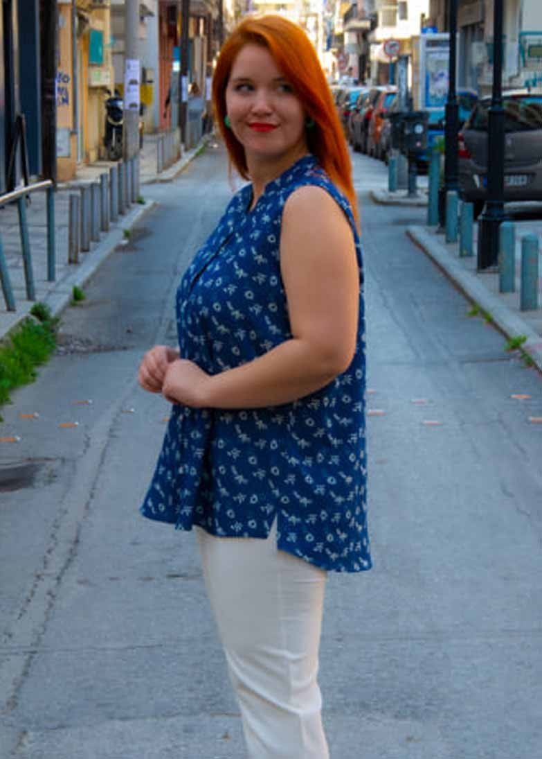 Πουκάμισο, σε μεγάλα μεγέθη, με V ντεκολτέ, χωρίς γιακά αμάνικο, με ασύμμετρο ποδόγυρο, και σχίσιμο στις πλαϊνές.