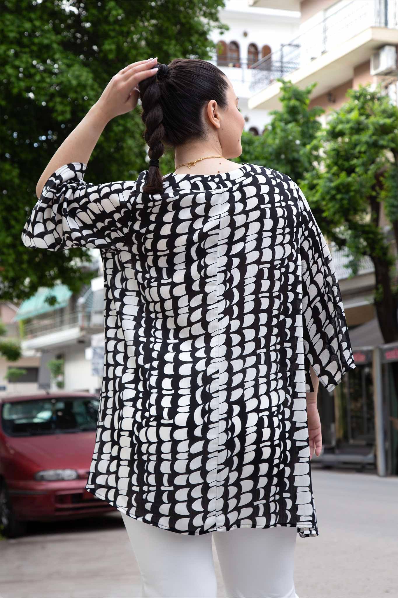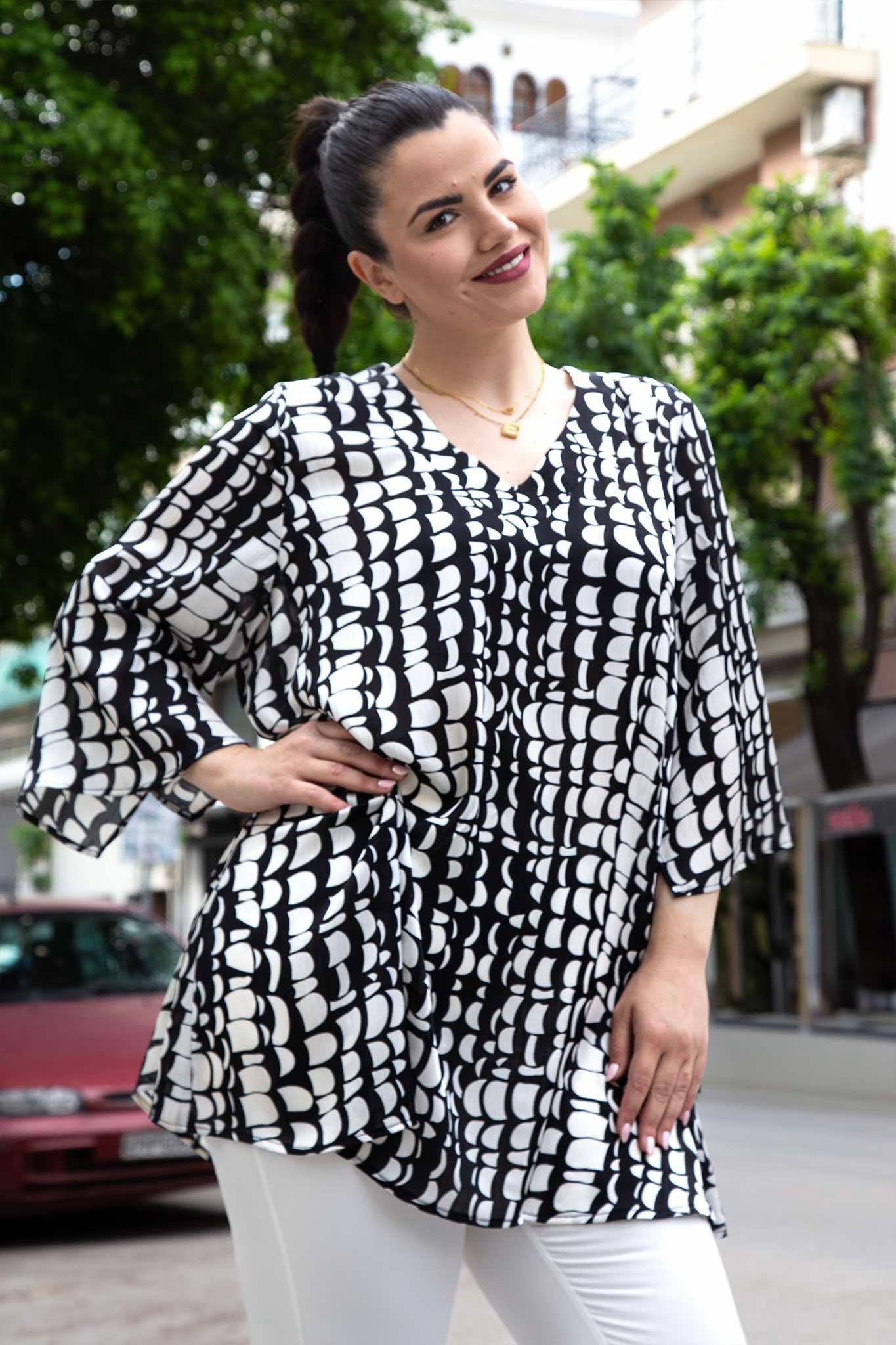 Τουνίκ, σε μεγάλα μεγέθη. Έχει V-ντεκολτέ και 3/4 μανίκι. Είναι σε άλφα γραμμή και καλύπτει περιφέρεια.