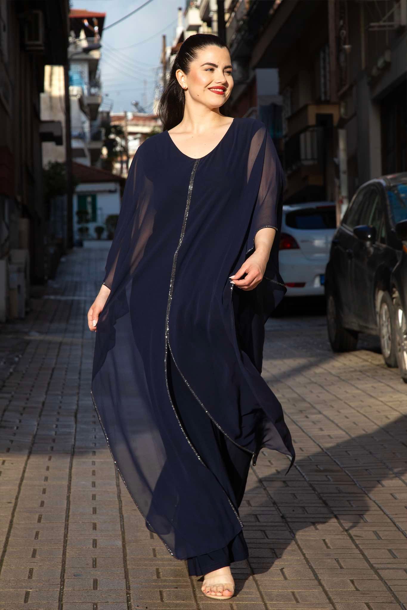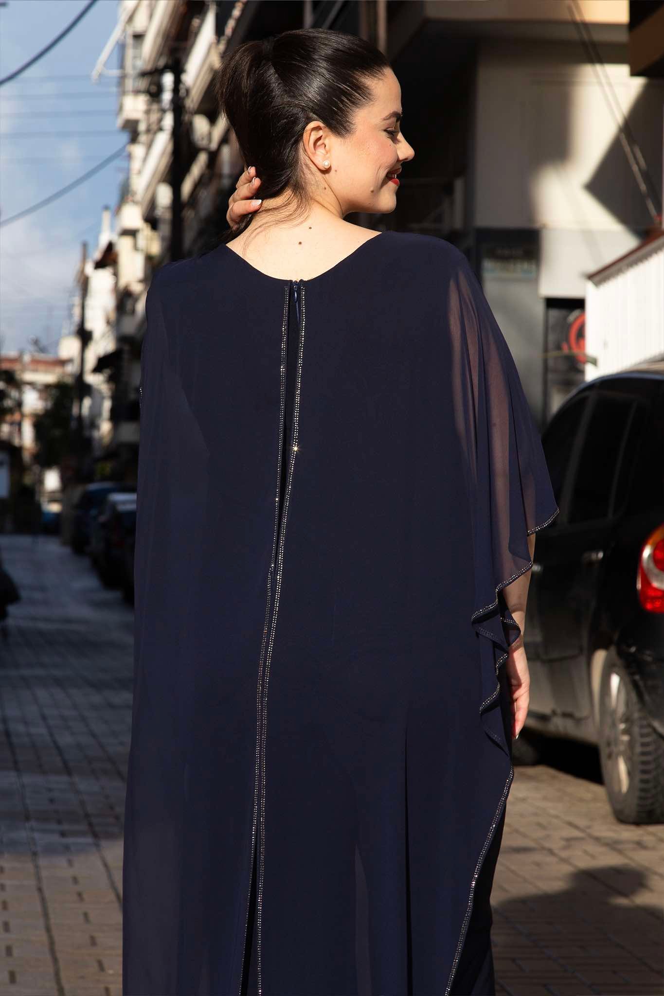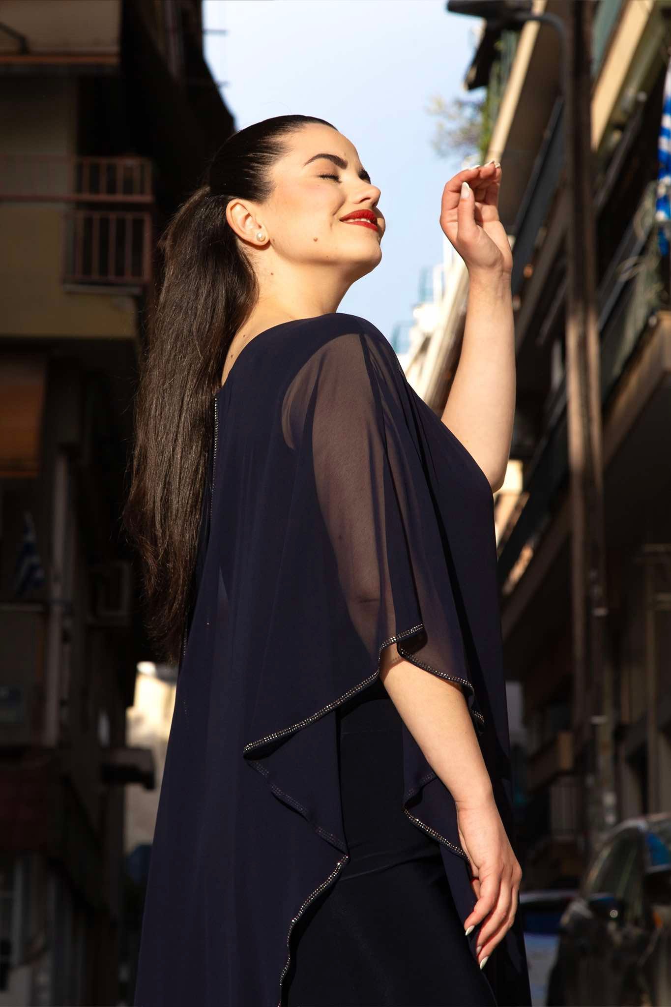 Ολόσωμη φόρμα, σε μεγάλα μεγέθη. Είναι αμάνικη σε ζέρσεϊ, κουμπώνει με φερμουάρ στην πλάτη. Από πάνω πέφτει μακριά εντυπωσιακή μουσελίνα, με κοψίματα για ελεύθερη κίνηση. Καλύπτει το μπράτσο.