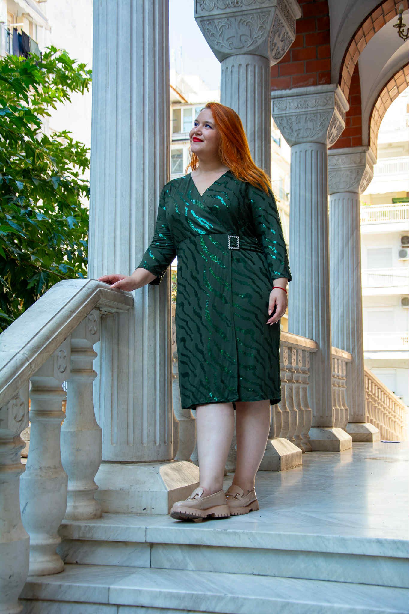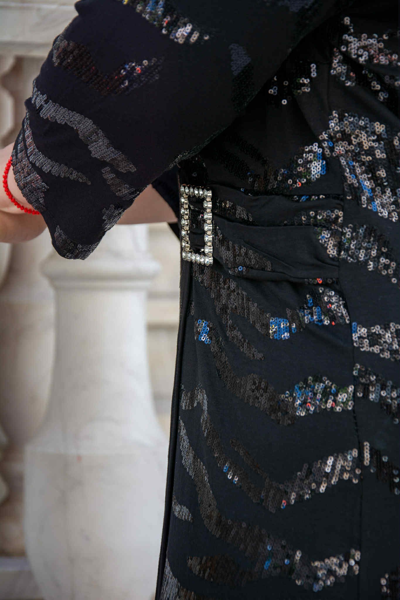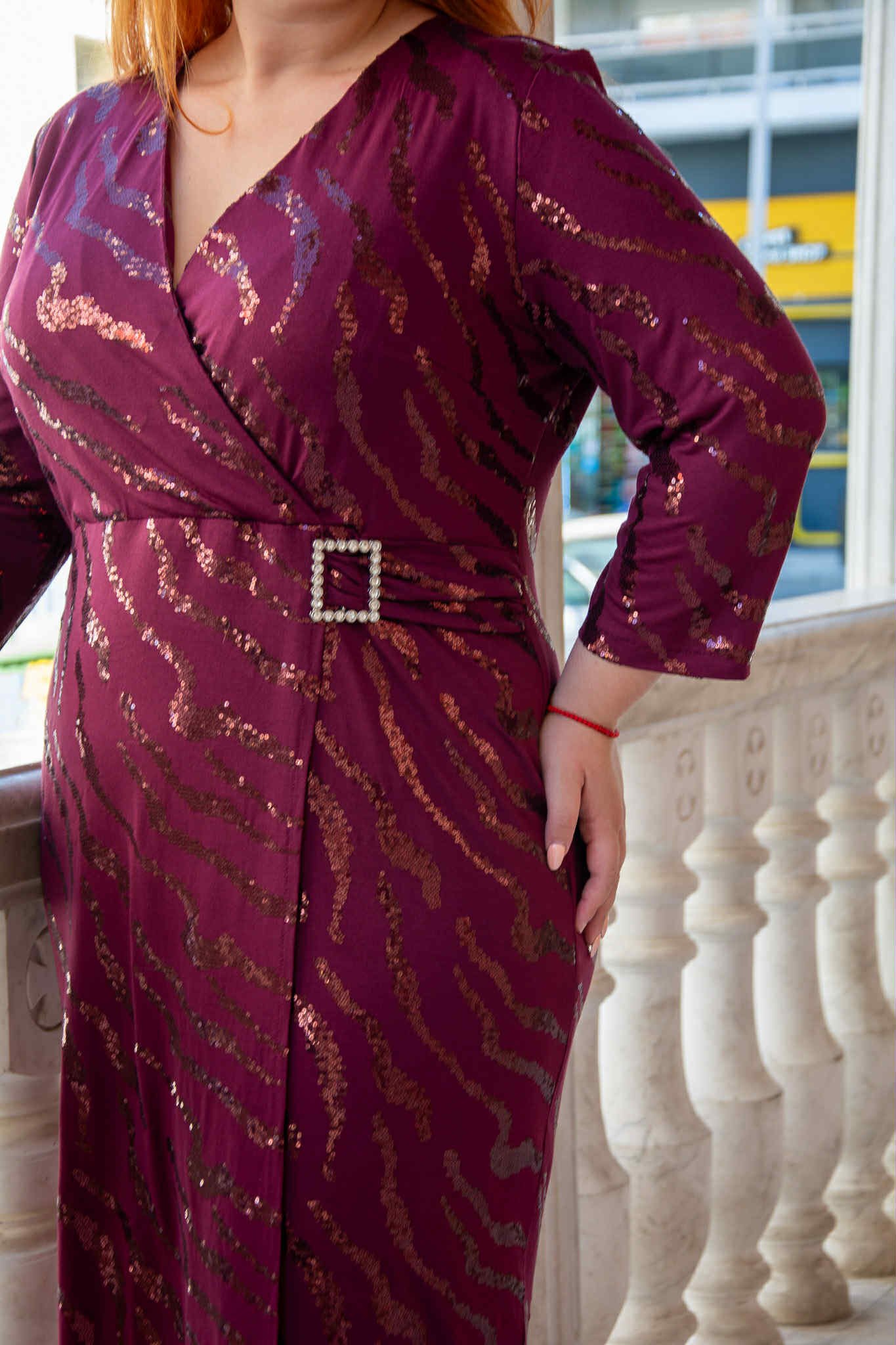 Φόρεμα, σε μεγάλα μεγέθη. Έχει κρουαζέ ντεκολτέ, είναι μίντι, ελαστικό, σε στενή γραμμή και έχει λεπτομέρειες από παγέτα.