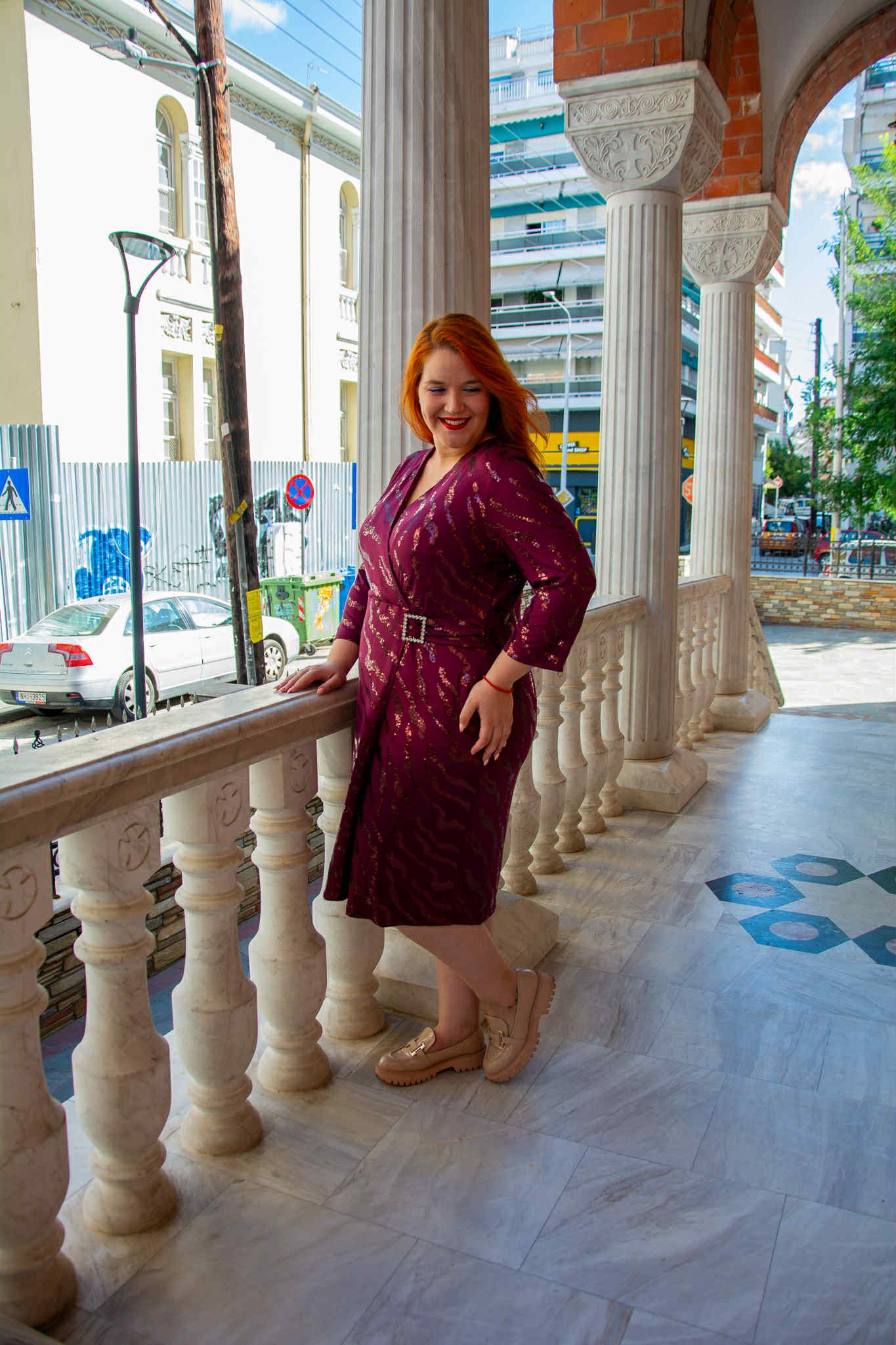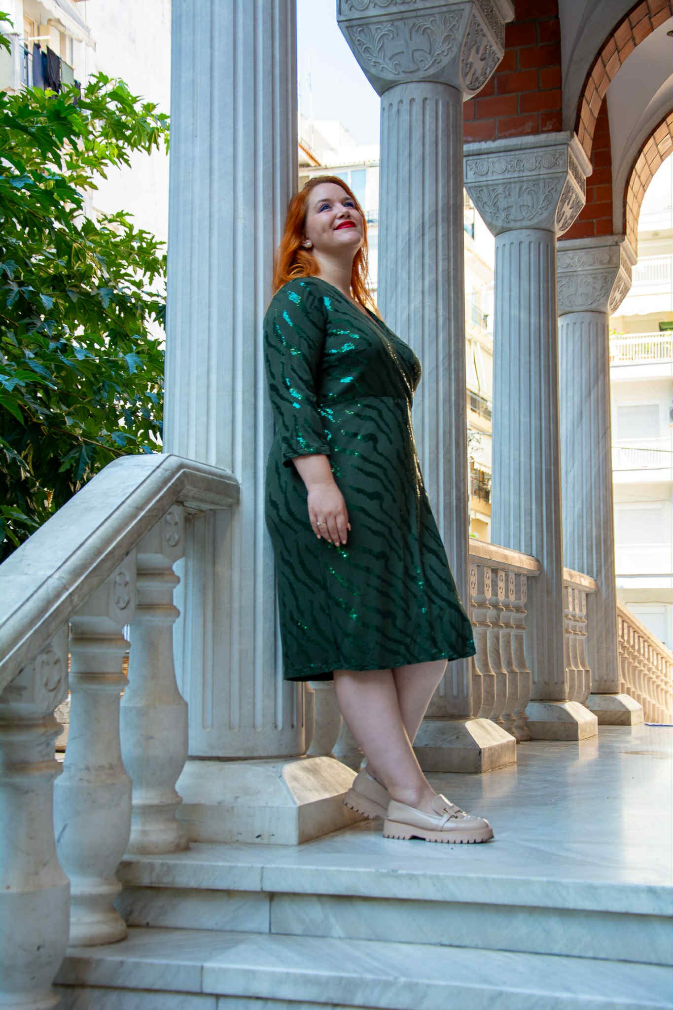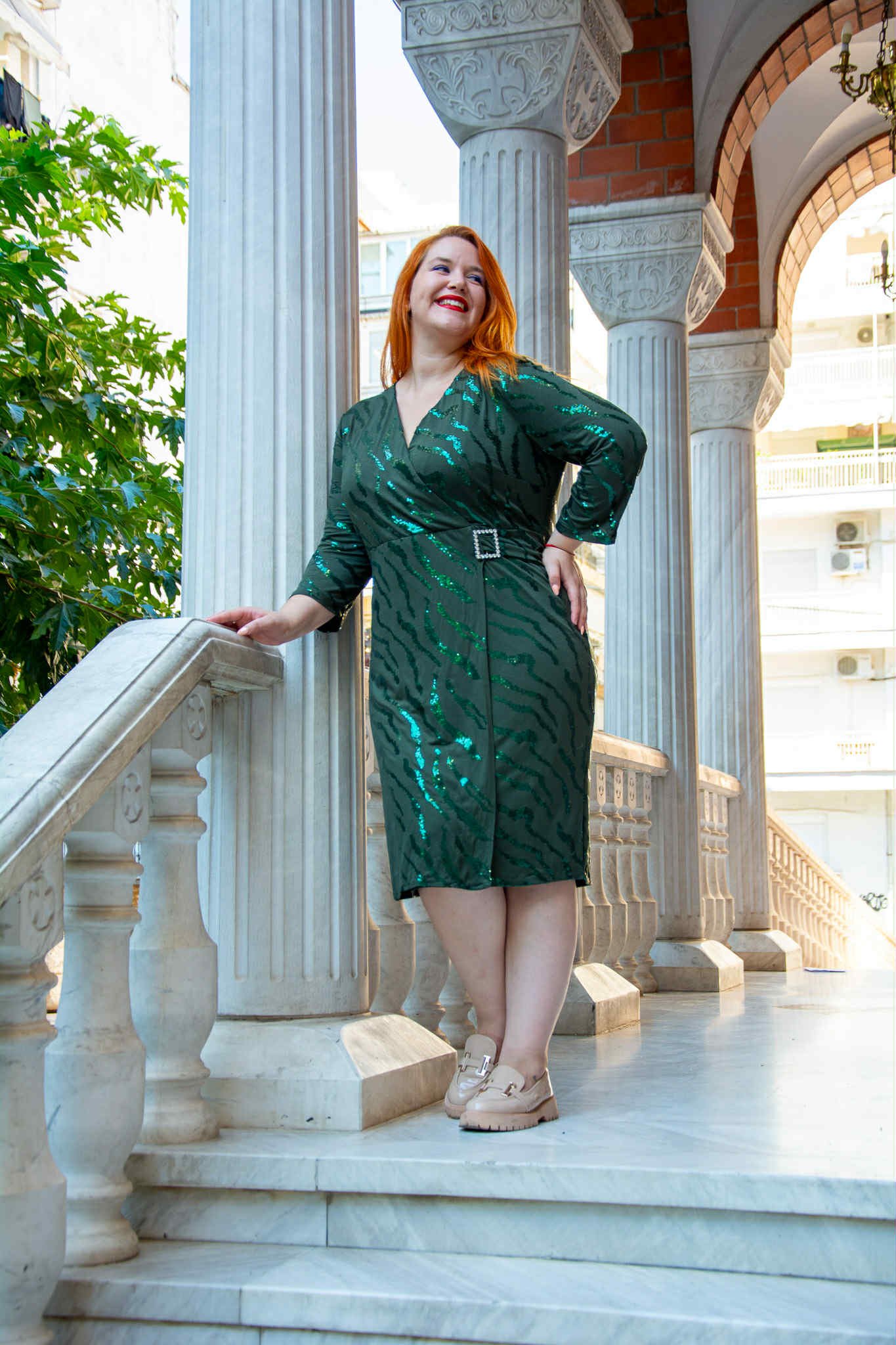 Φόρεμα, σε μεγάλα μεγέθη. Έχει κρουαζέ ντεκολτέ, είναι μίντι, ελαστικό, σε στενή γραμμή και έχει λεπτομέρειες από παγέτα.