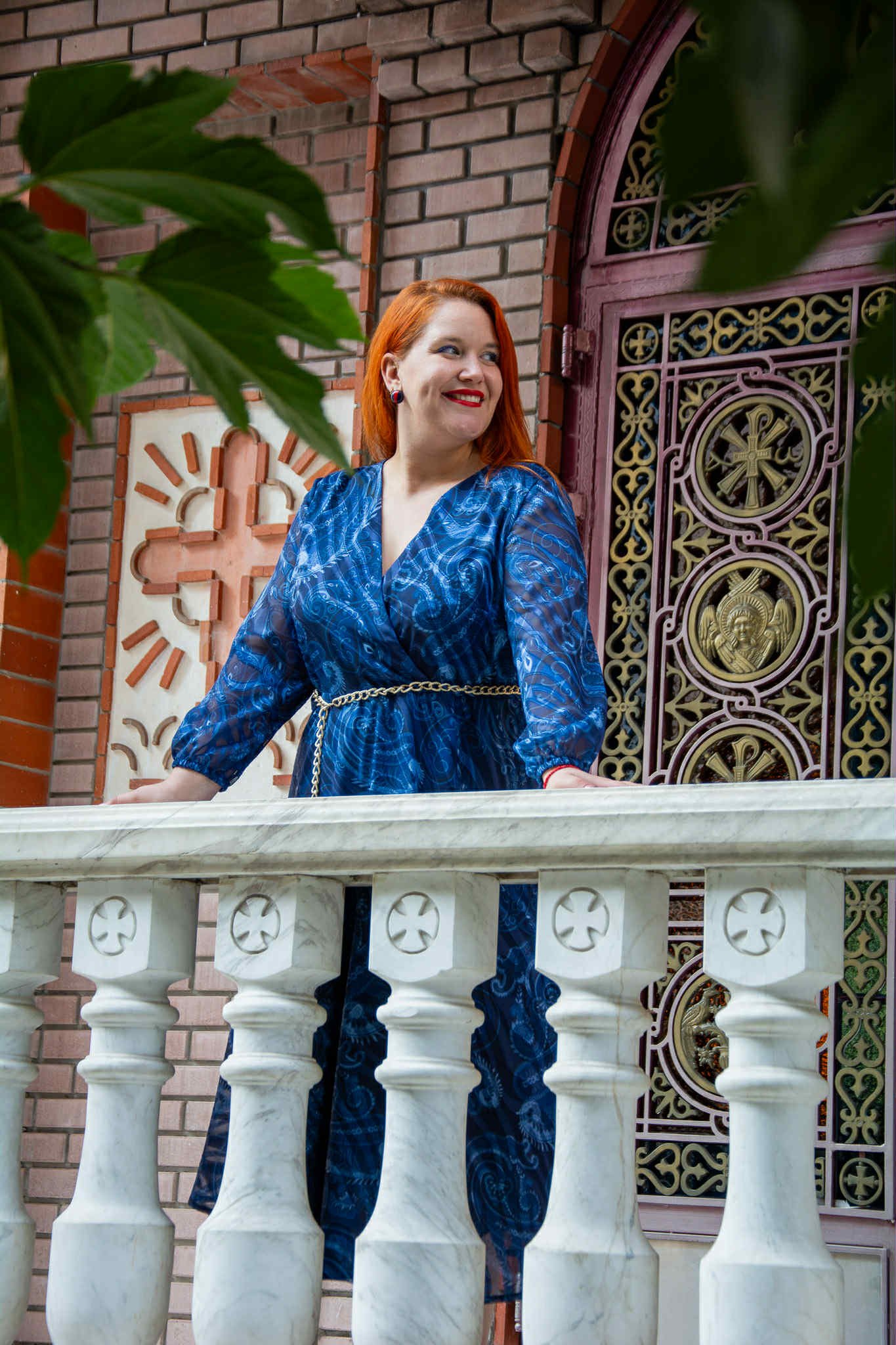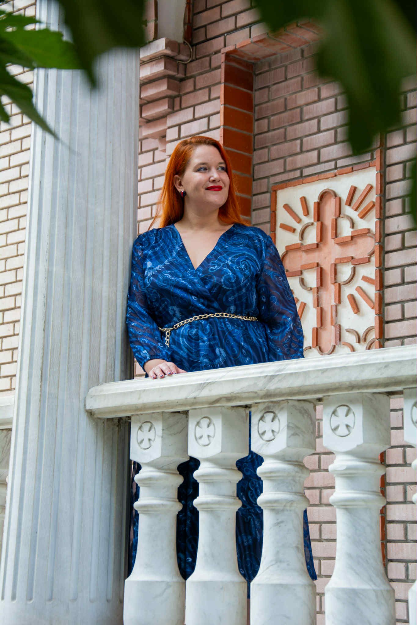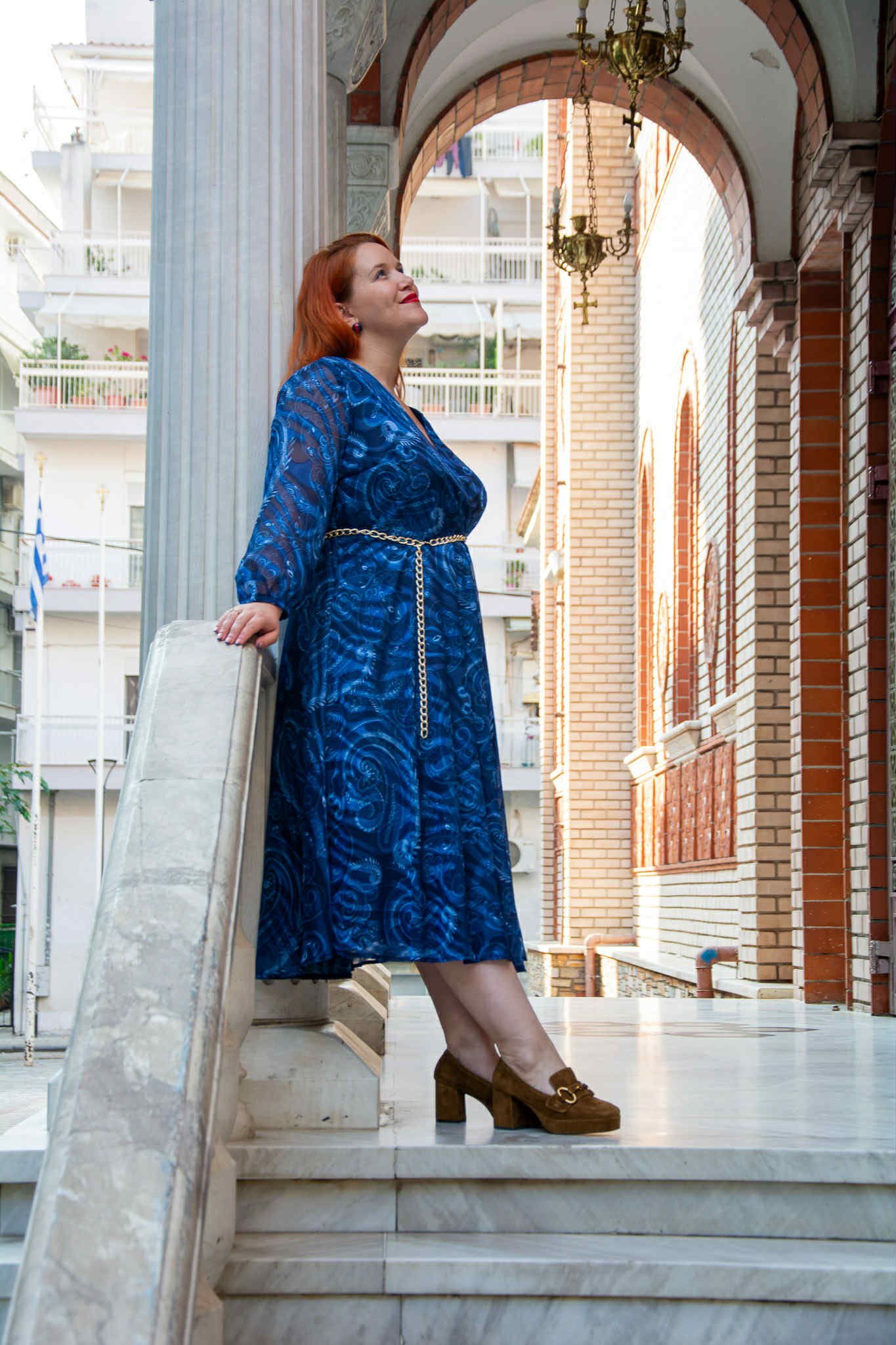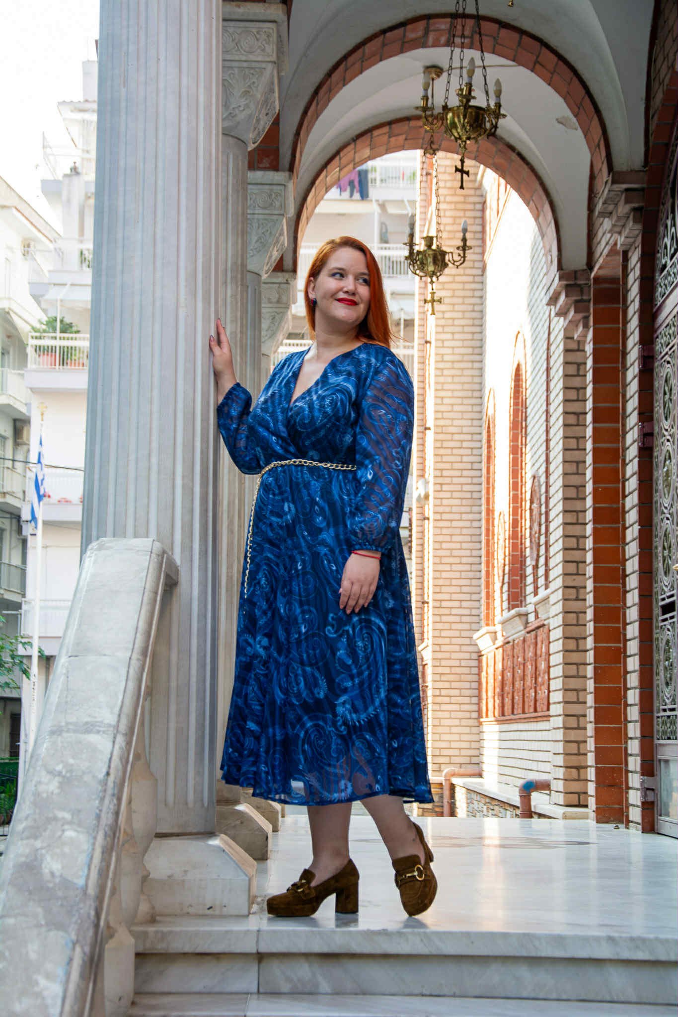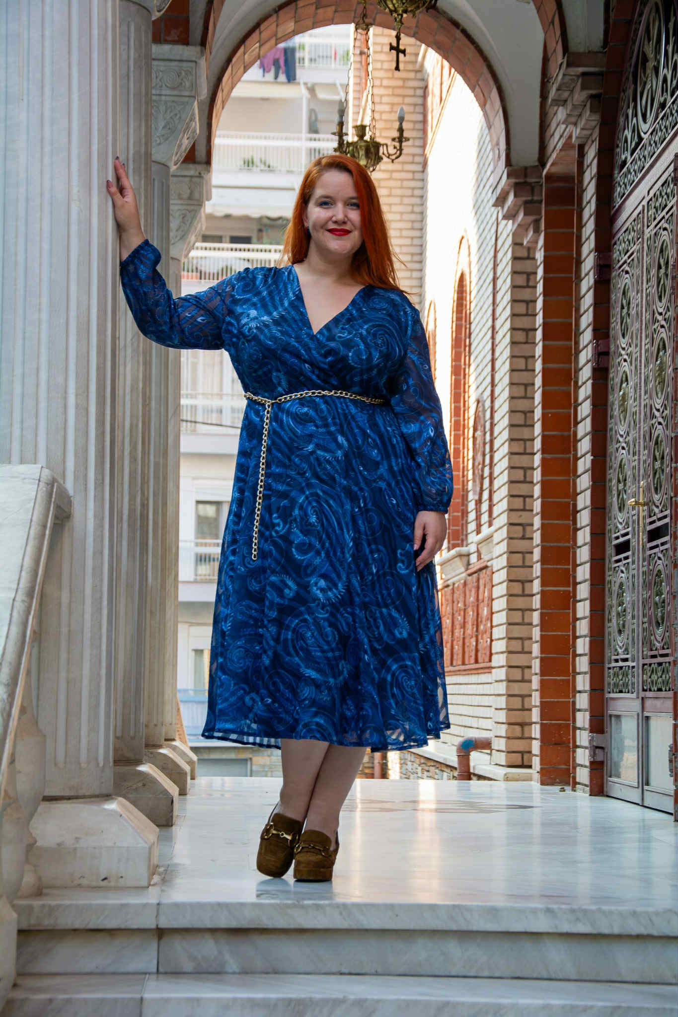 Φόρεμα, σε μεγάλα μεγέθη. Είναι μίντι, κρουαζέ, φοδραρισμένο και έχει λάστιχο στο τελείωμα του μανικιού. Διαθέτει χρυσή αλυσίδα για ζώνη.