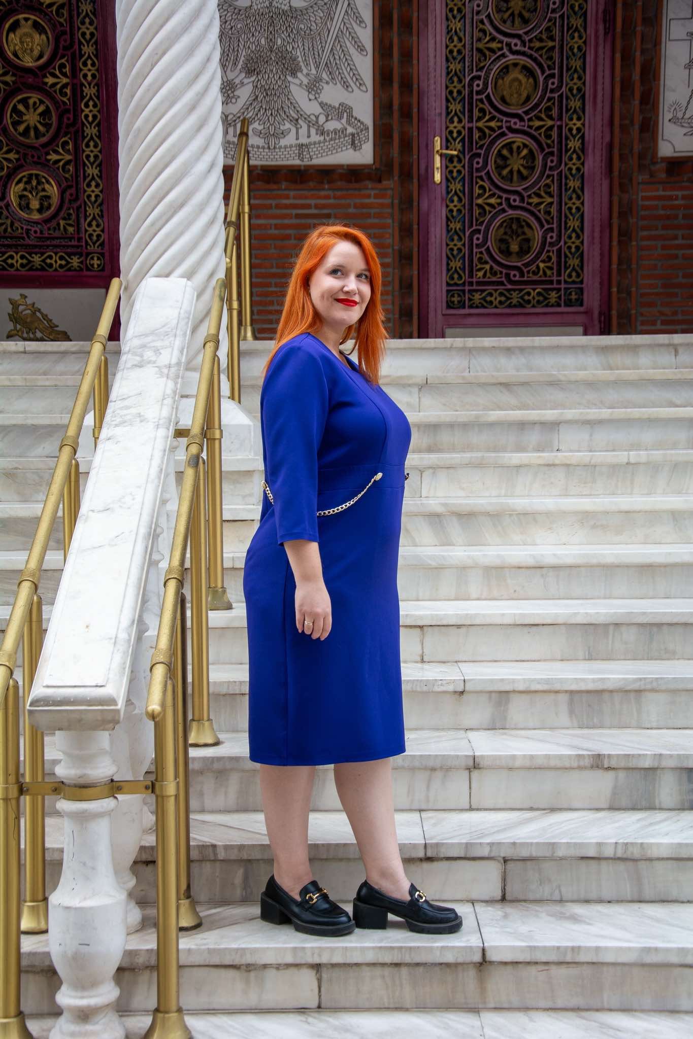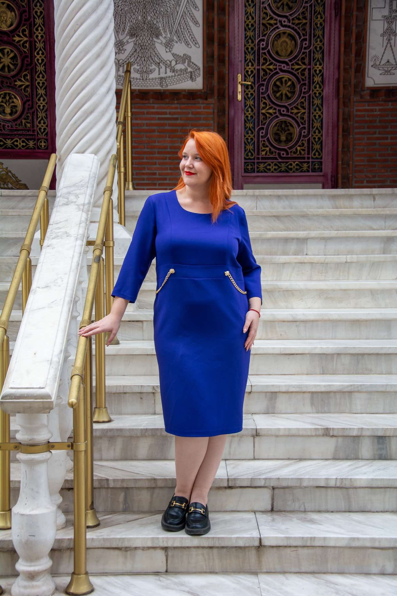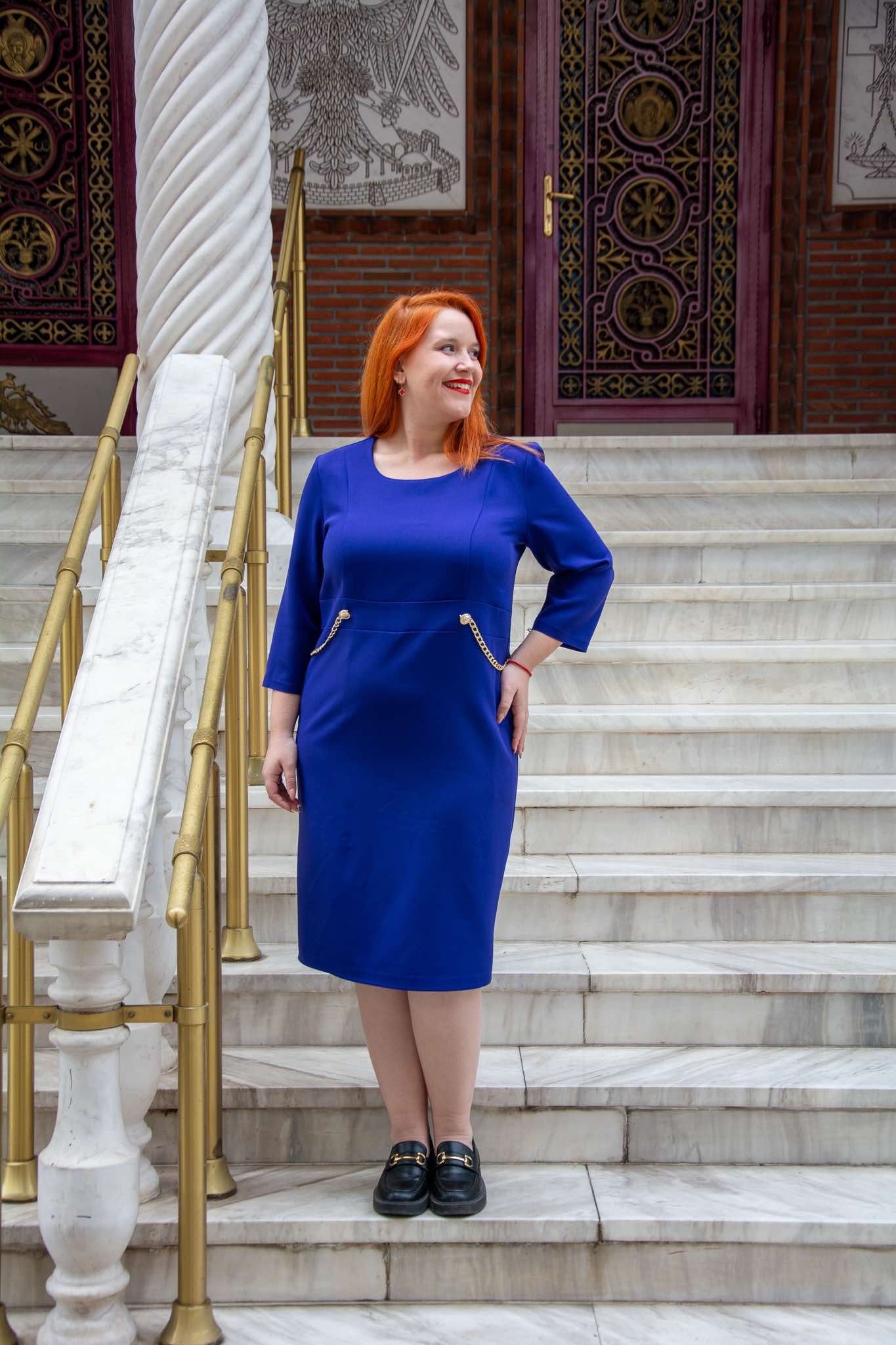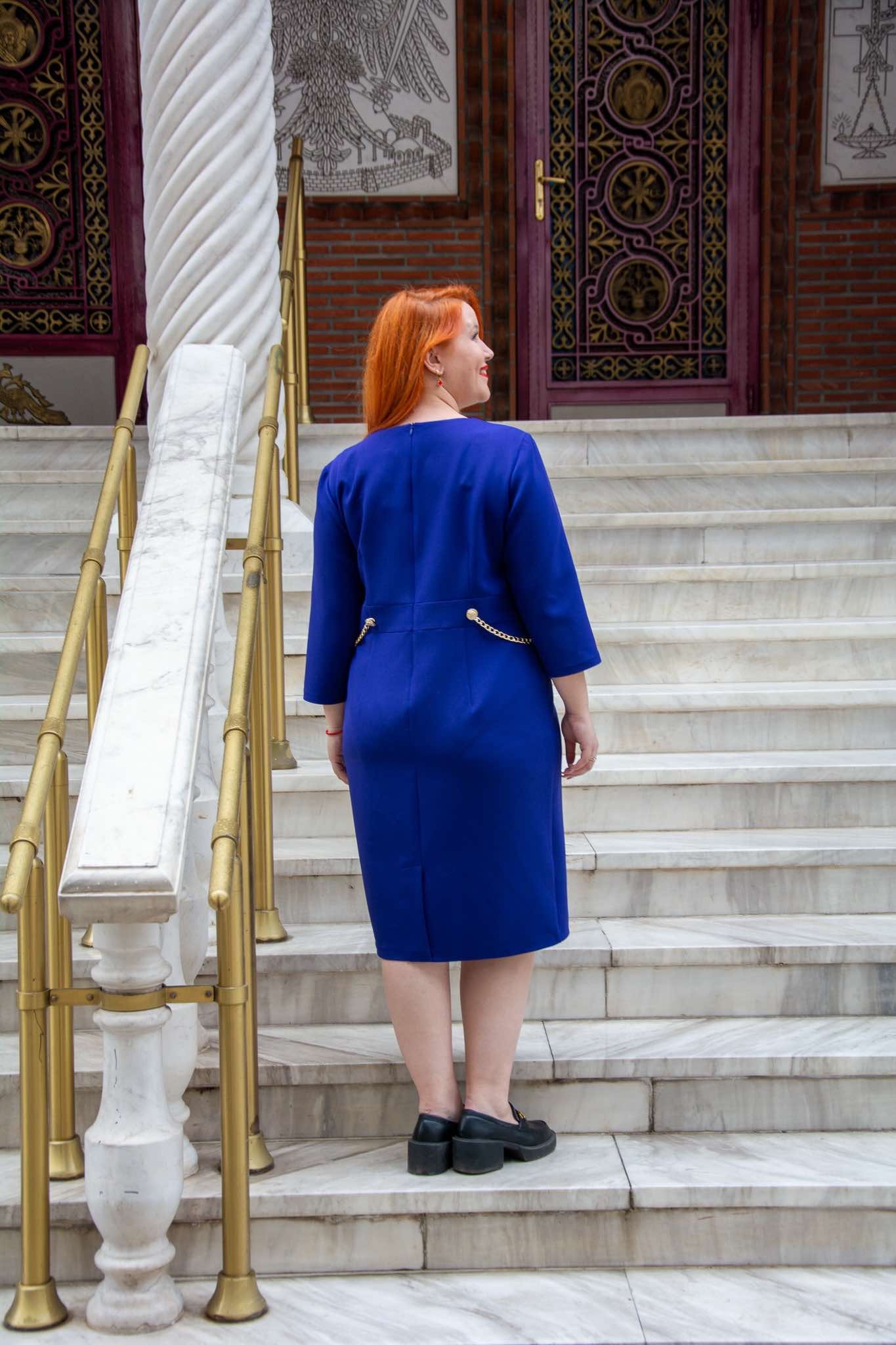 Φόρεμα, σε μεγάλα μεγέθη. Είναι μίντι, σε ίσια γραμμή και έχει 3/4 μανίκι. Διαθέτει λεπτομέρειες από χρυσή αλυσίδα. Είναι φοδραρισμένο.