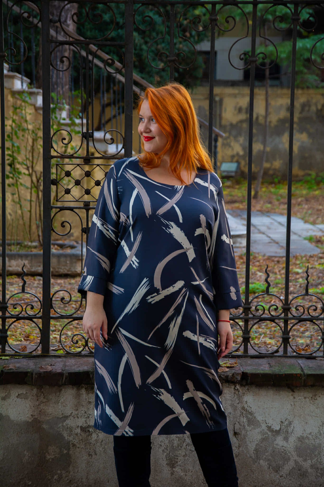 Φόρεμα, σε μεγάλα μεγέθη. Είναι μίντι, σε ίσια γραμμή και έχει 3/4 μανίκι. Είναι φοδραρισμένο.