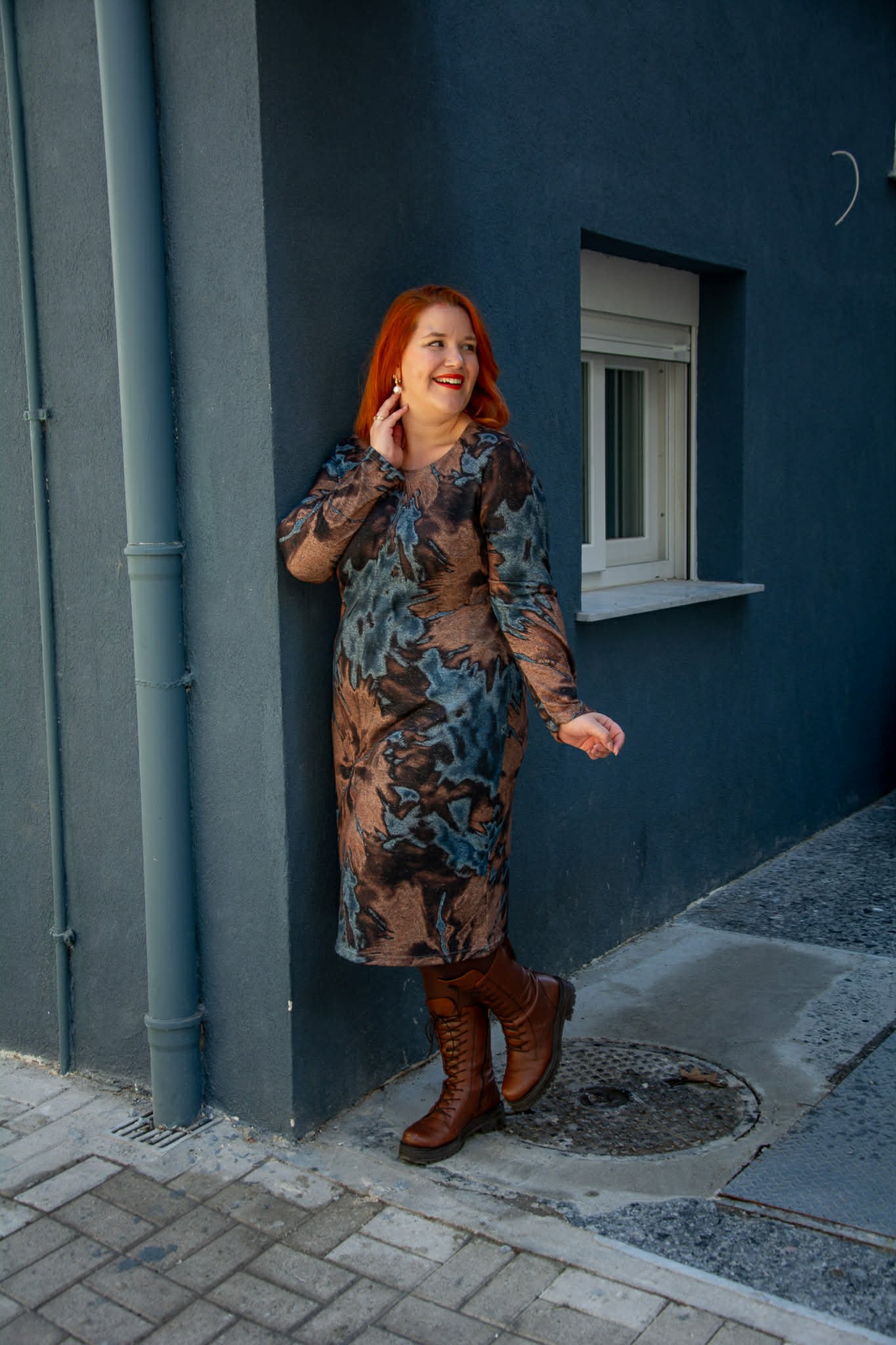Φόρεμα, σε μεγάλα μεγέθη. Είναι μίντι, σε ίσια γραμμή και έχει στρογγυλεμένο ντεκολτέ. Είναι φοδραρισμένο.