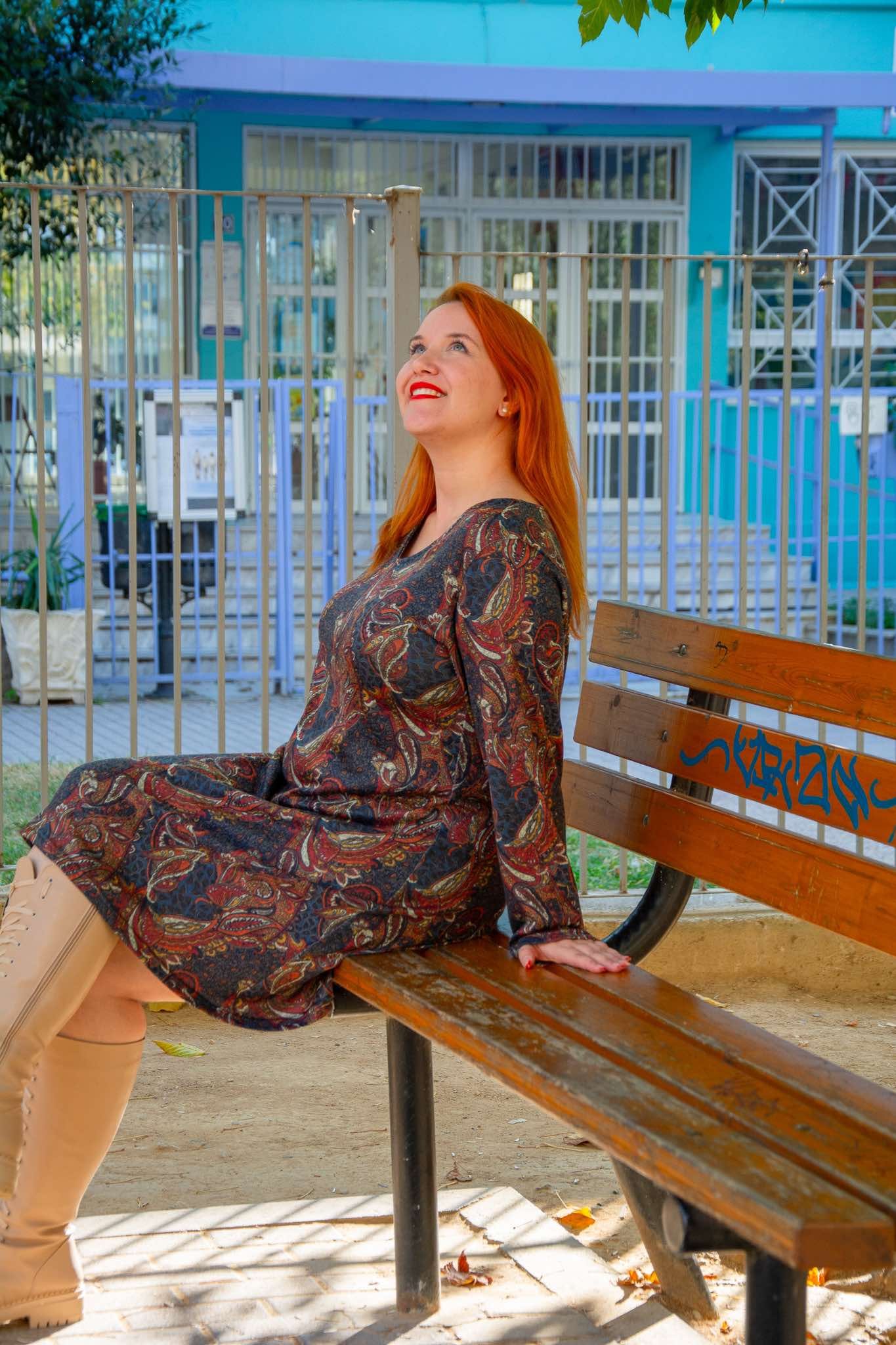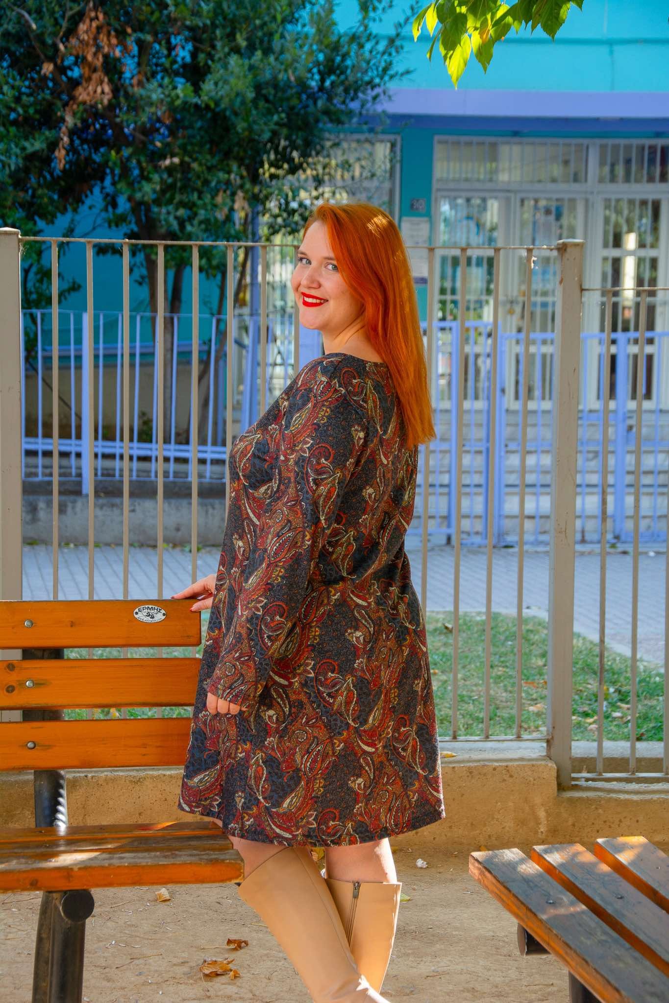 Φόρεμα, σε μεγάλα μεγέθη. Έχει ελαφριά άλφα γραμμή και V-ντεκολτέ. Το μήκος του είναι ως το γόνατο.