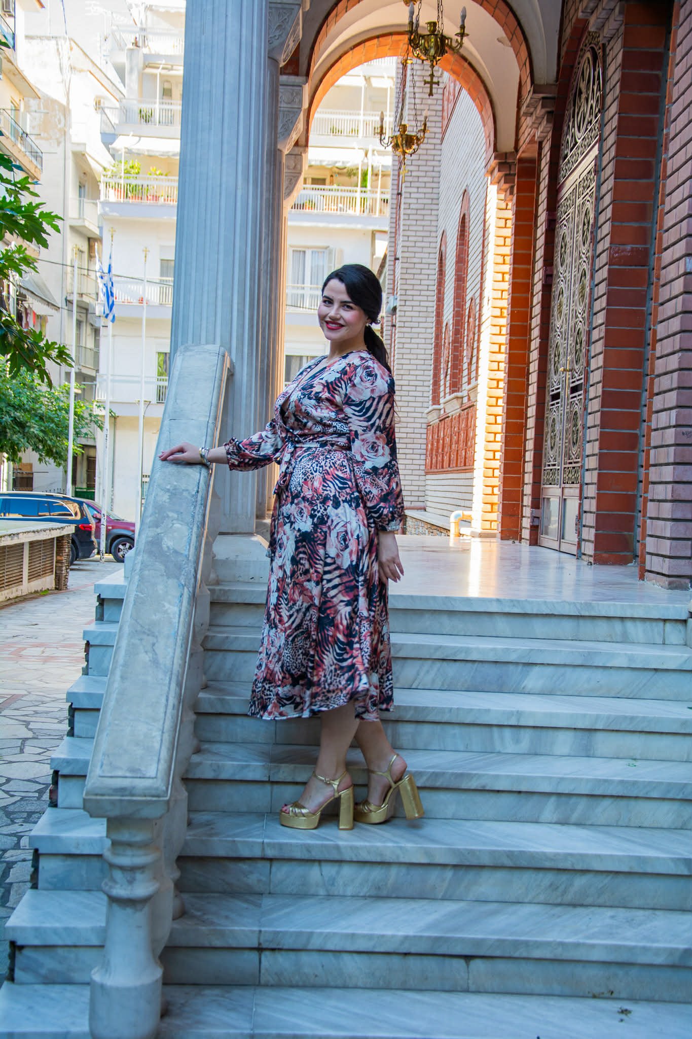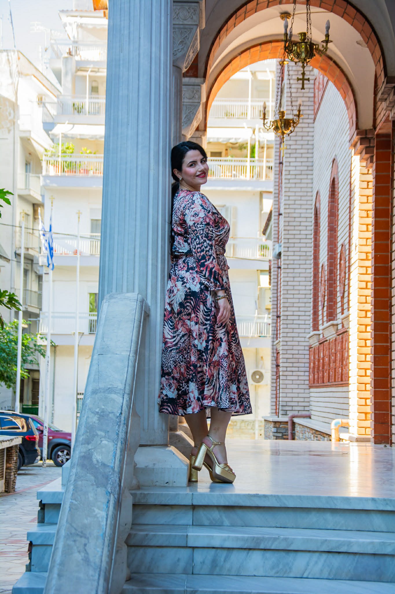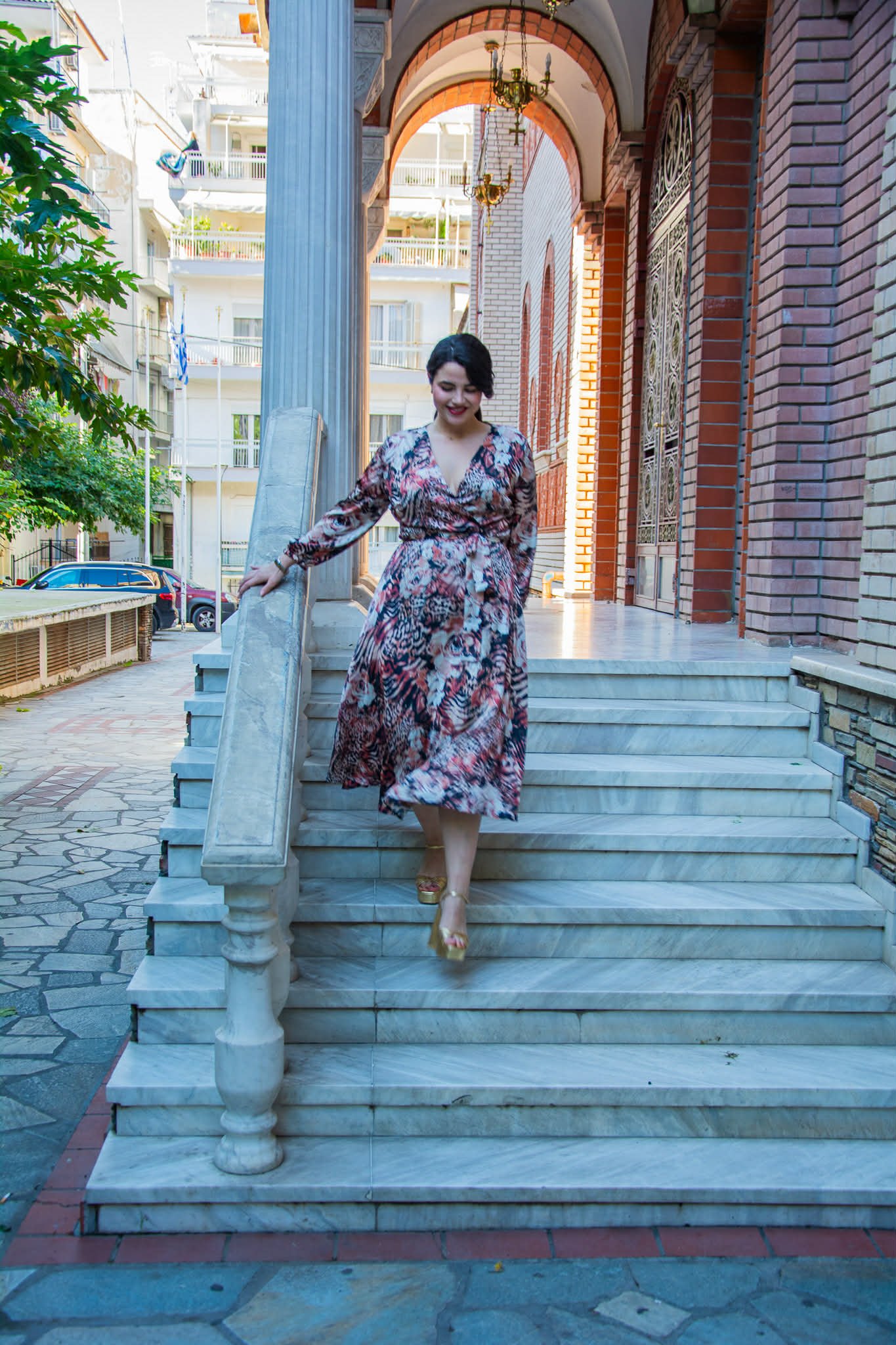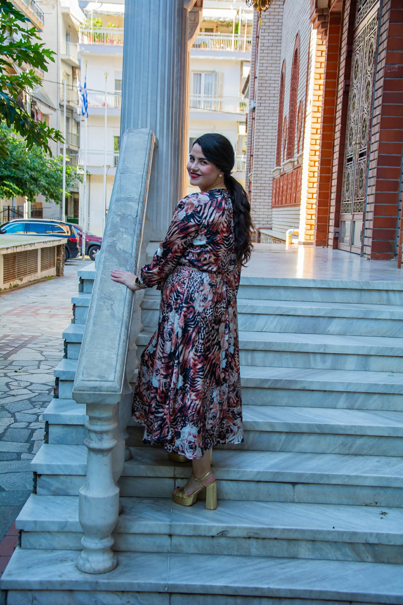 Φόρεμα, σε μεγάλα μεγέθη. Είναι μίντι, κρουαζέ, φοδραρισμένο και έχει λάστιχο στο τελείωμα του μανικιού. Διαθέτει ζώνη από το ίδιο ύφασμα.
