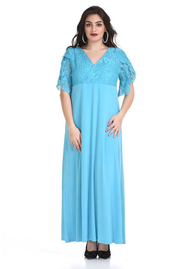 Φόρεμα μάξι, σε μεγάλα μεγέθη, κρουαζέ εμπρός και πίσω στην πλάτη, δαντέλα στο μπούστο και το μανίκι είναι σε σχήμα μανδύλας (επανωτίζει το μπρος με το πίσω), φοδραρισμένο.