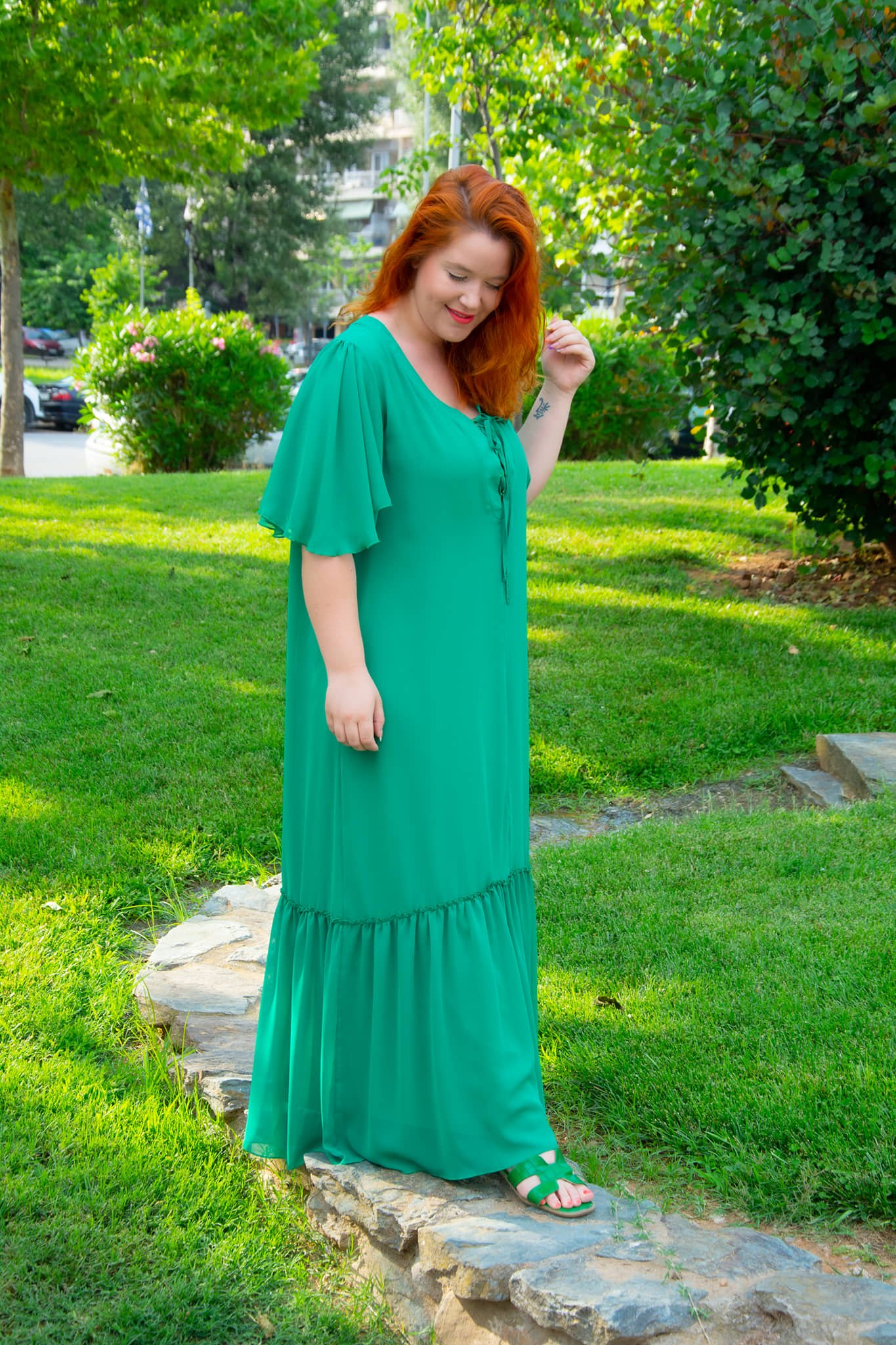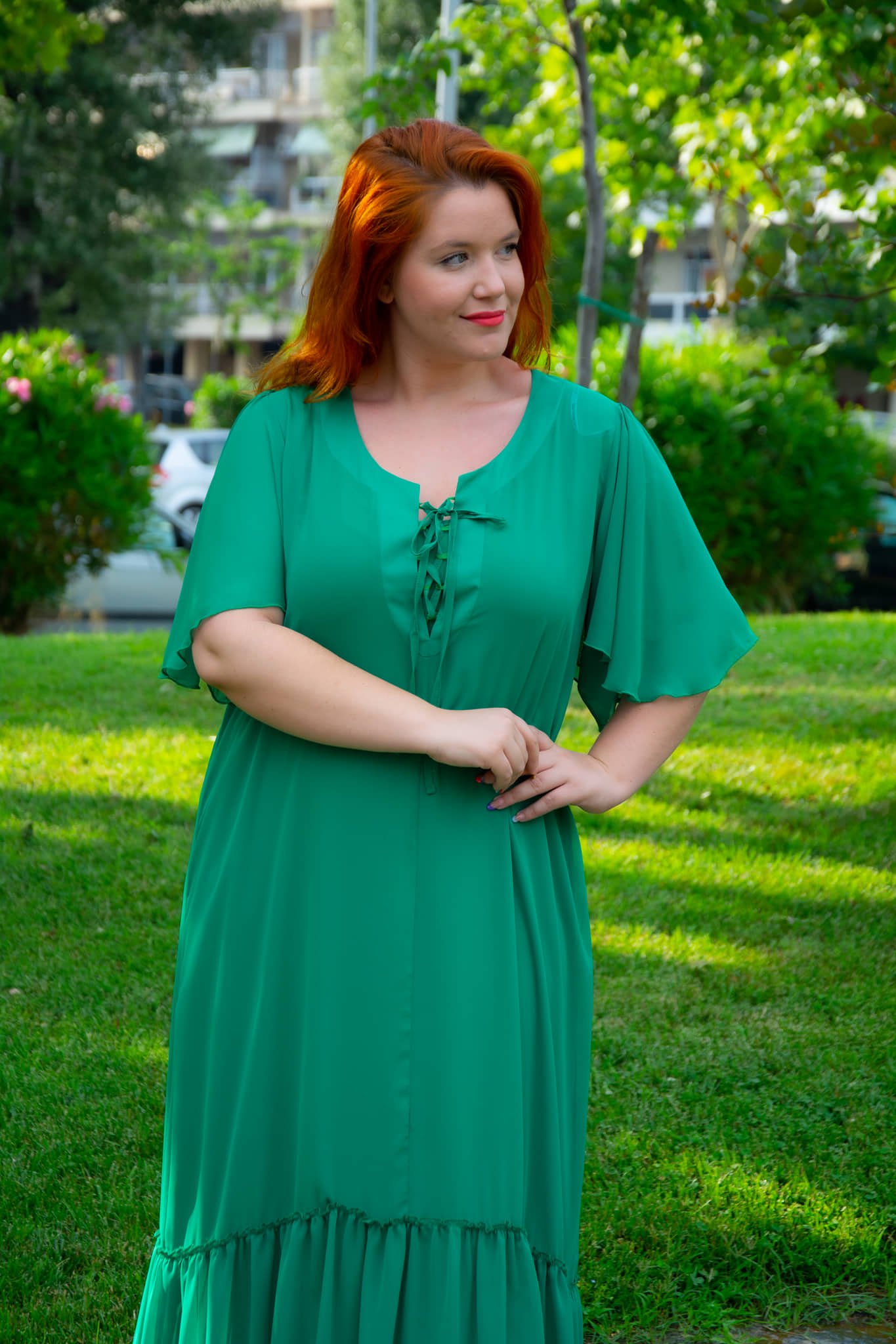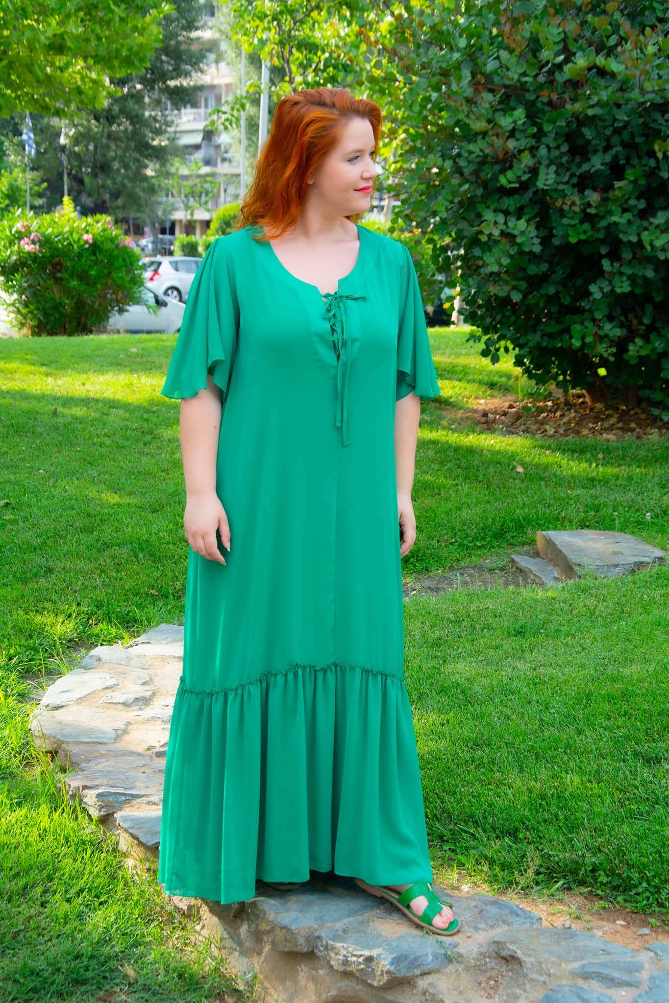 Φόρεμα μάξι διπλό, σε μεγάλα μεγέθη. Το εξωτερικό κομμάτι είναι μουσελίνα, έχει πλούσιο μανίκι, ωραίο ντεκολτέ, που χιάζει στο V με κορδελάκι από μουσελίνα, και καταλήγει σε ένα φαρδύ βολάν. Το εσωτερικό φόρεμα είναι μάξι αμάνικο.