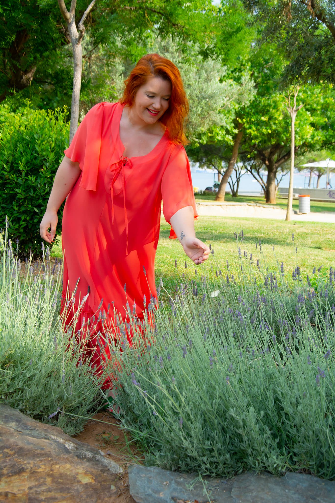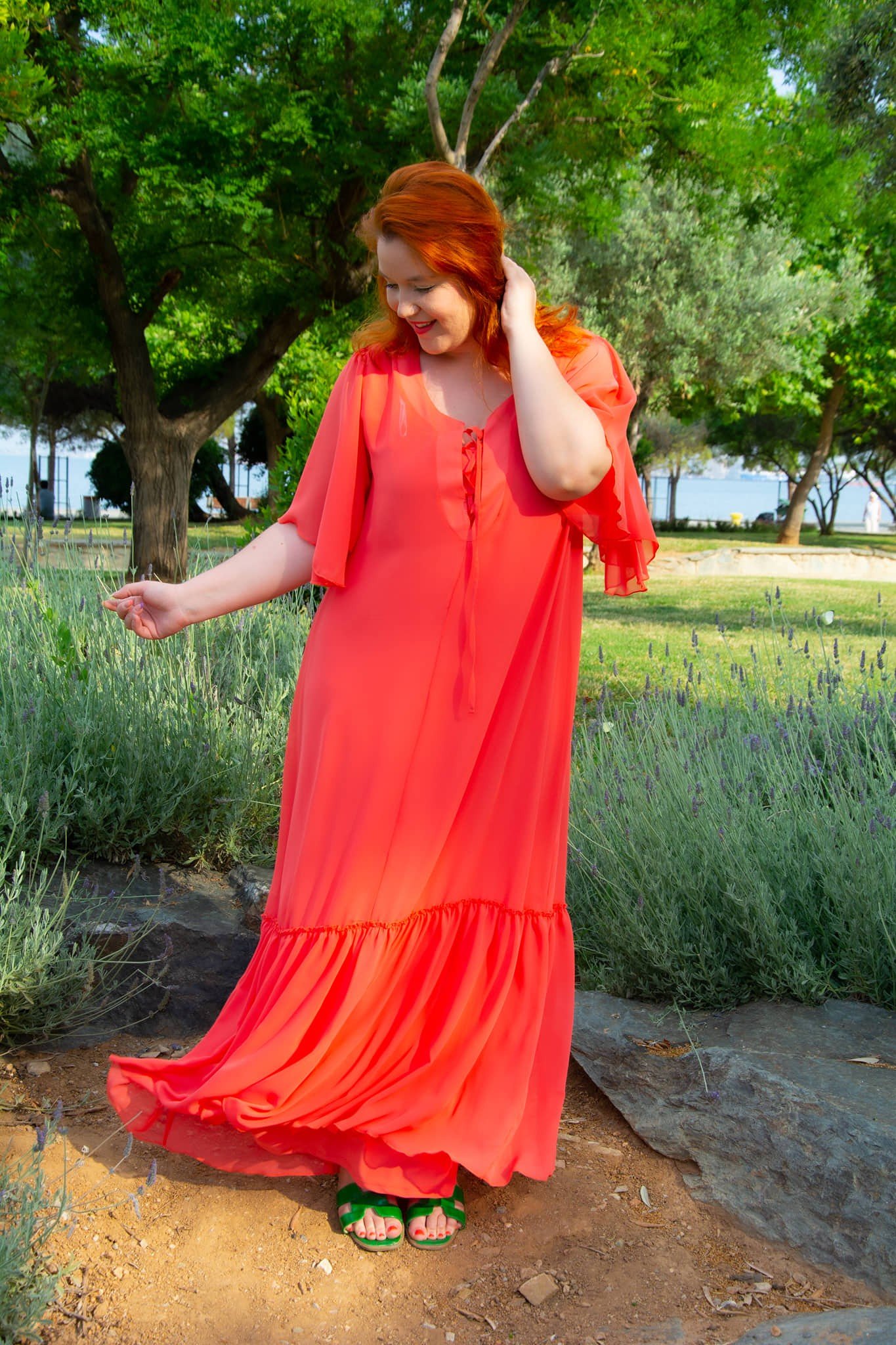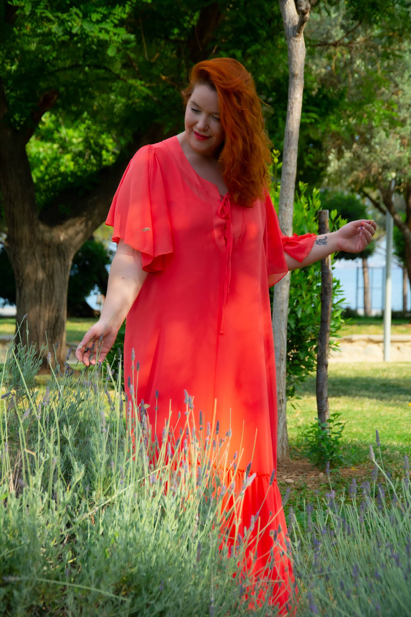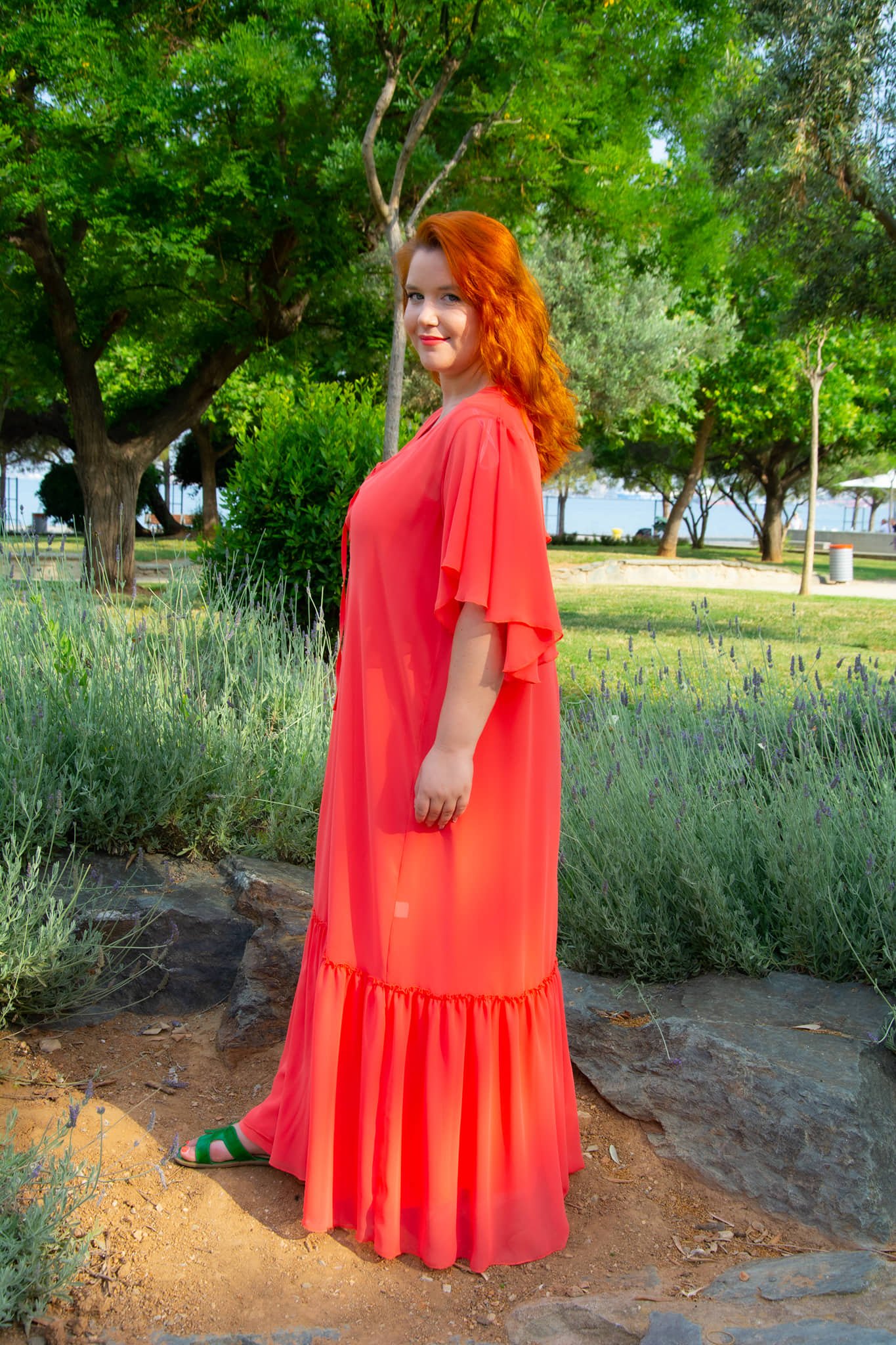 Φόρεμα μάξι διπλό, σε μεγάλα μεγέθη. Το εξωτερικό κομμάτι είναι μουσελίνα, έχει πλούσιο μανίκι, ωραίο ντεκολτέ, που χιάζει στο V με κορδελάκι από μουσελίνα, και καταλήγει σε ένα φαρδύ βολάν. Το εσωτερικό φόρεμα είναι μάξι αμάνικο.